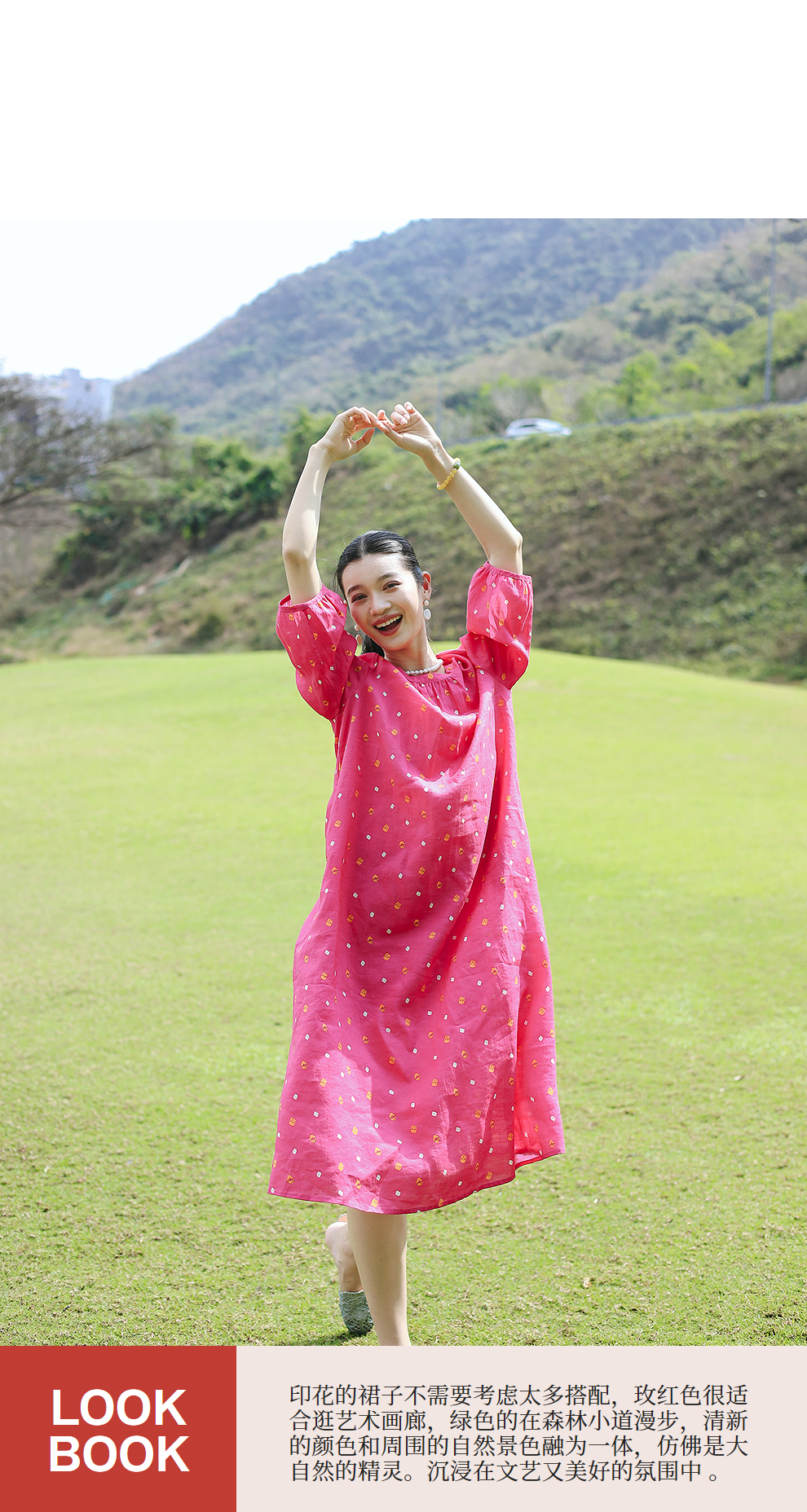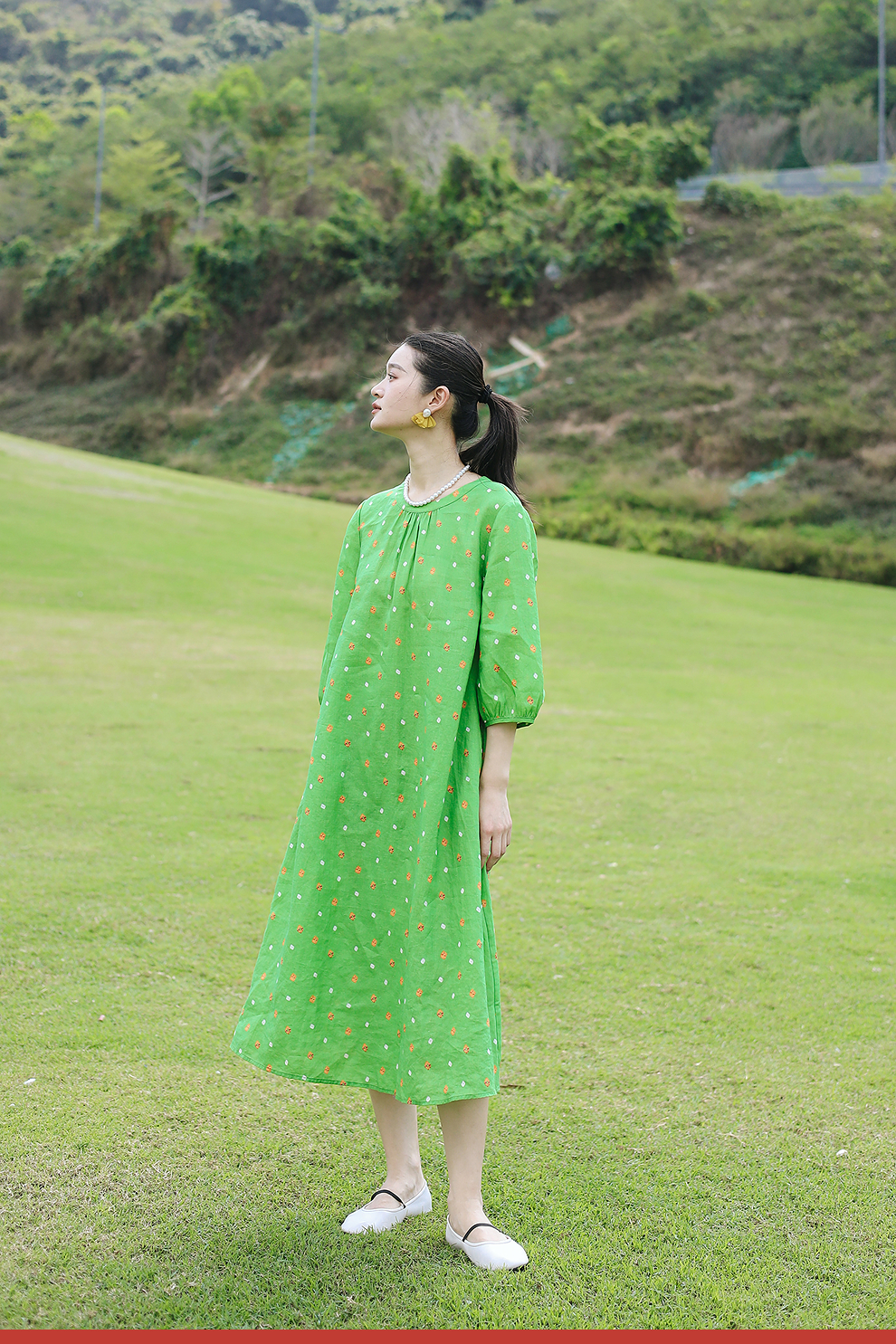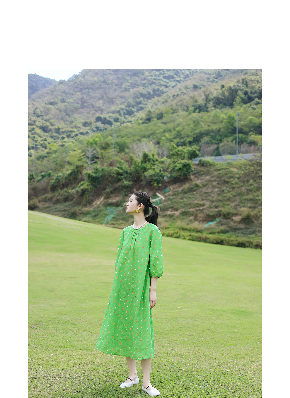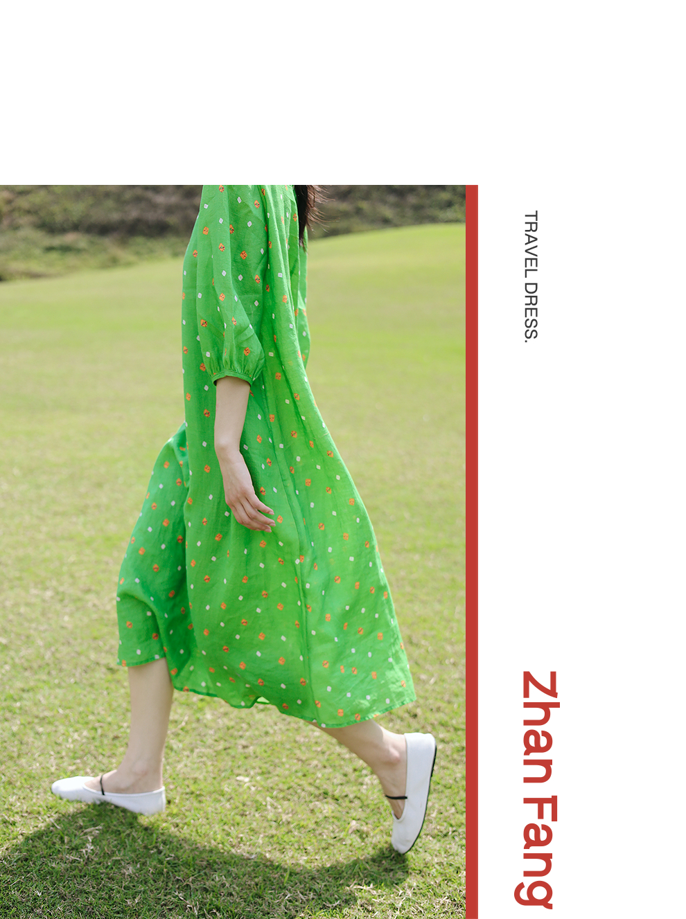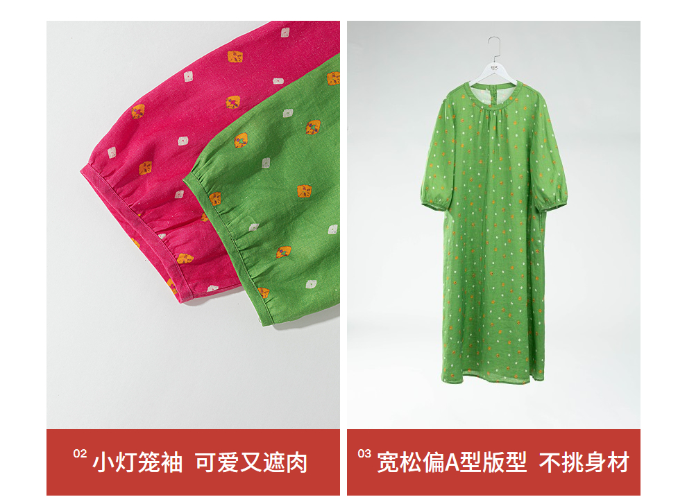 绽放旅行女装202朵/雨点裙春季小波点印花灯笼袖文艺七分袖连衣裙