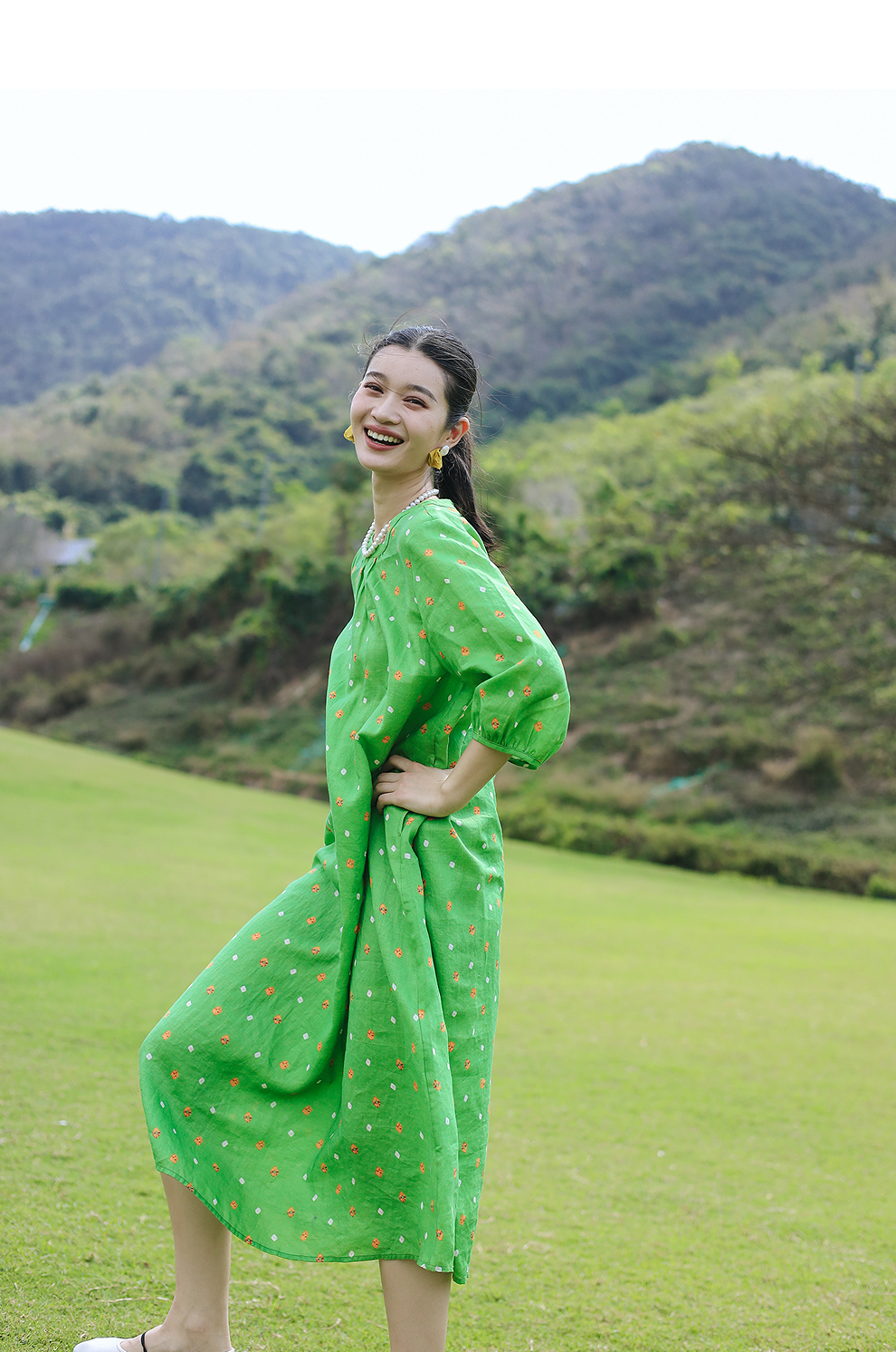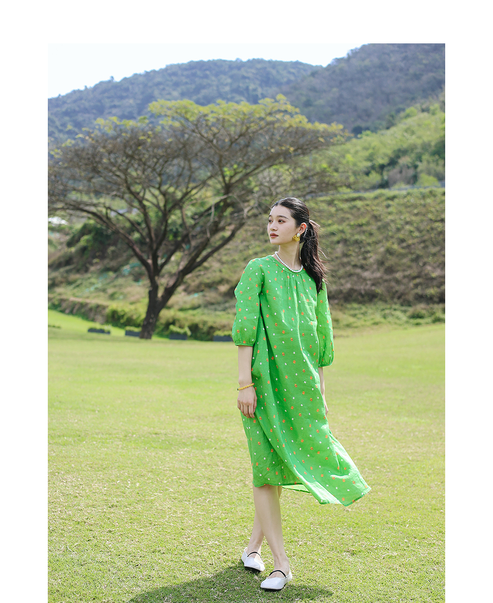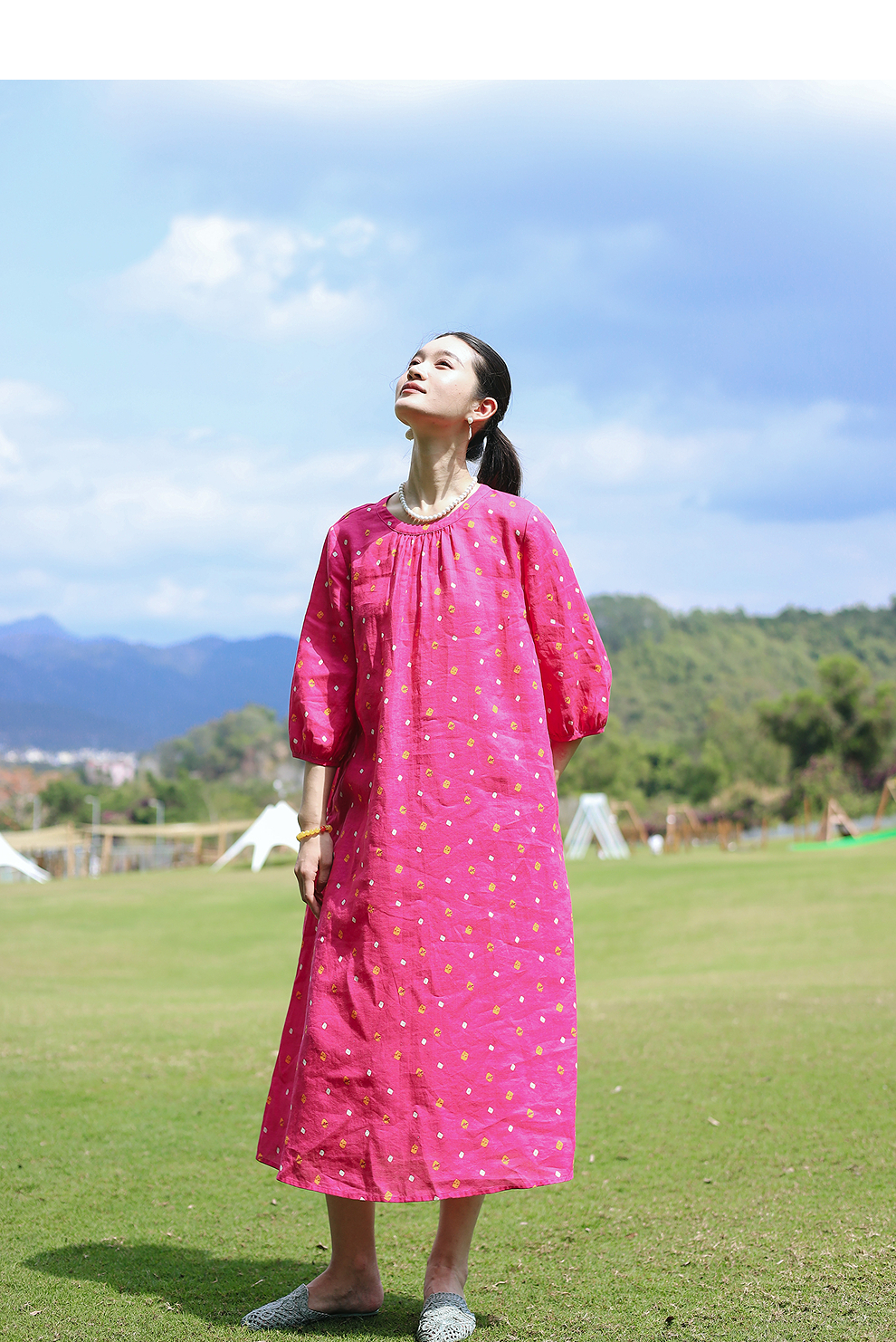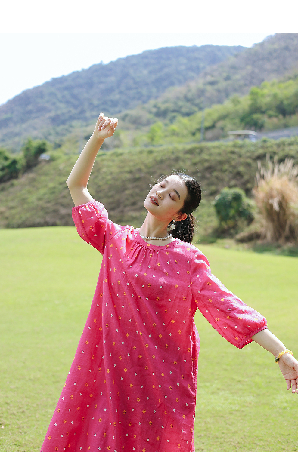 绽放旅行女装202朵/雨点裙春季小波点印花灯笼袖文艺七分袖连衣裙