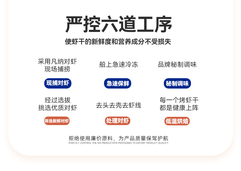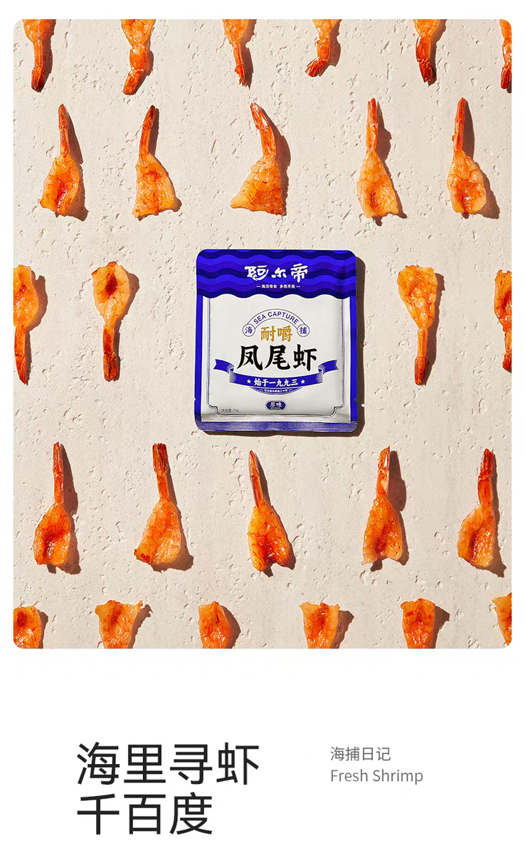 好零食的根基,在于优质原料与精湛工艺。阿尔帝精选进口凡纳对虾,这种虾壳薄肉紧,出肉率高达67%,鲜度十足。为了锁住这份鲜味,现捕的对虾在船上就急速冷冻保鲜,随后经过挑选、去头去壳,连虾线都逐个剔除,起来干干净净,安心又放心。更难得的是,每五斤鲜虾经过层层筛选后,仅能制成一斤虾干哦,浓缩的都是纯粹的海味鲜香。