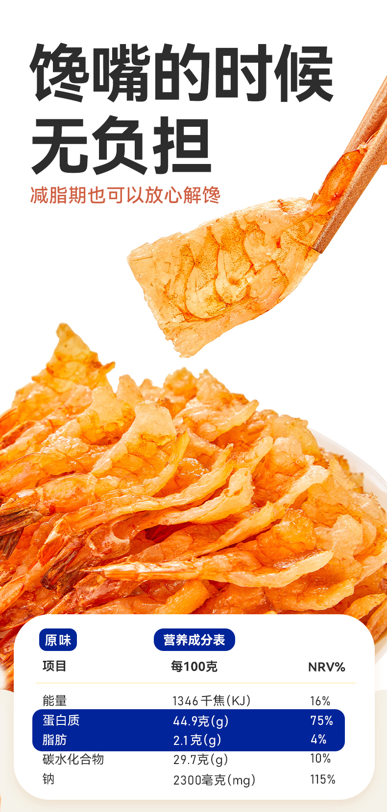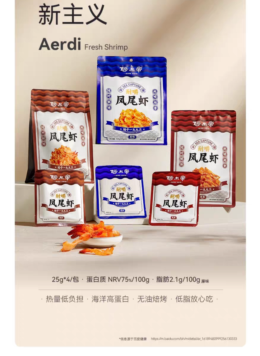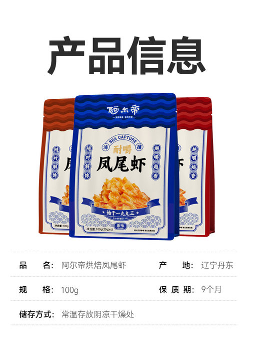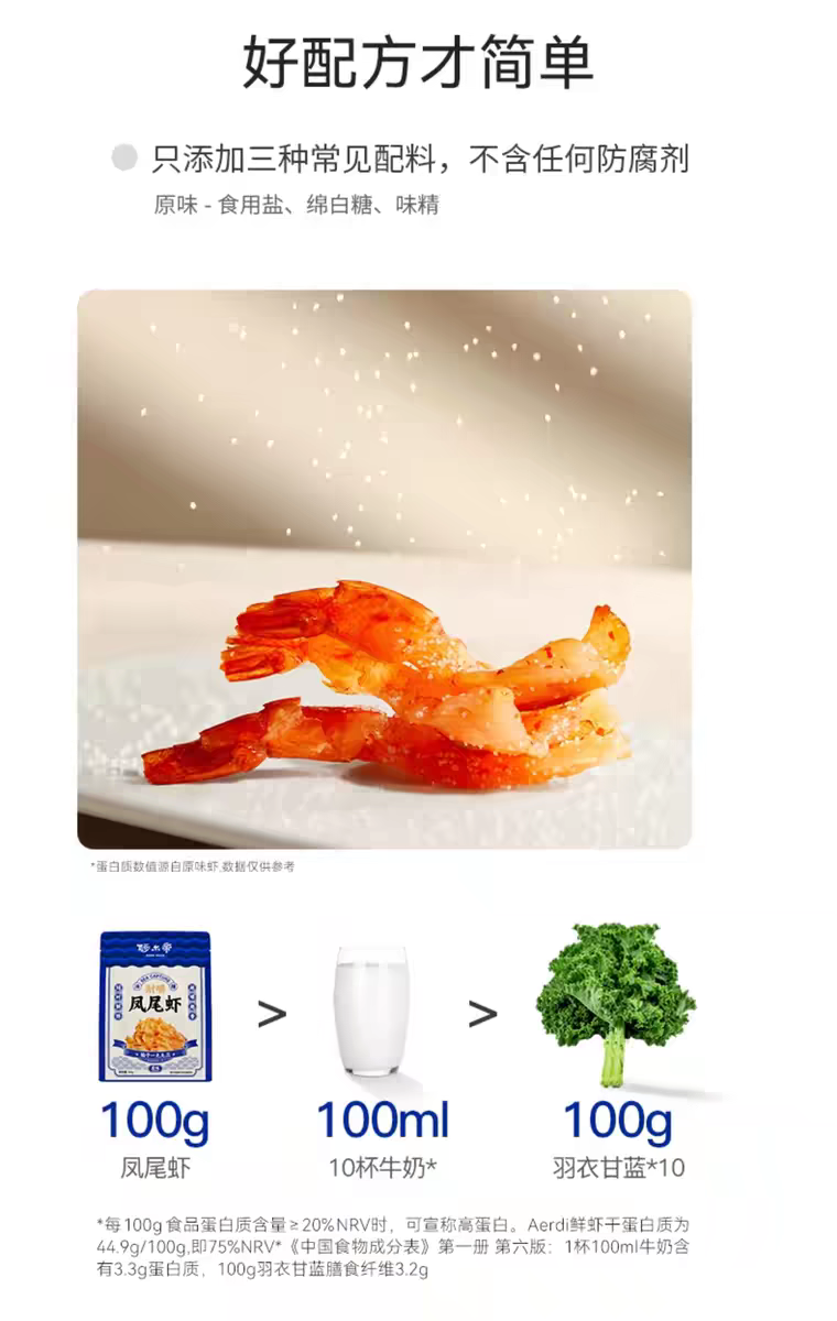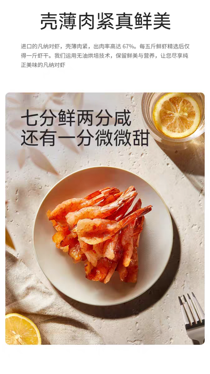 在制作工艺上,阿尔帝摒弃了传统油炸方式,采用无油烘焙技术:130度高温4分钟快速锁鲜,再以45度低温慢烘6小时,既保留了虾肉的丰富营养,又赋予它耐嚼不柴的绝佳口感。配料表更是简洁明了,仅添加食用盐、绵白糖、味精三种常见调料,不含任何防腐剂,老人小孩都能吃。