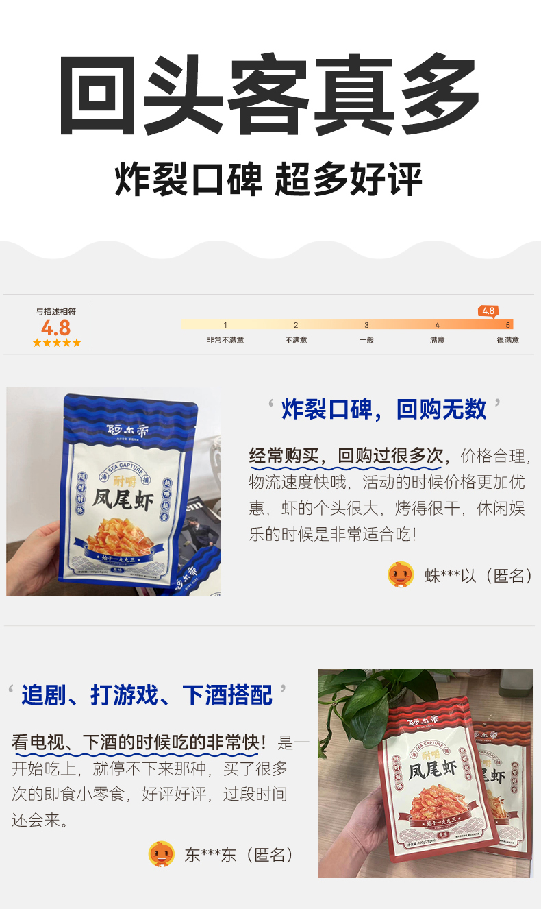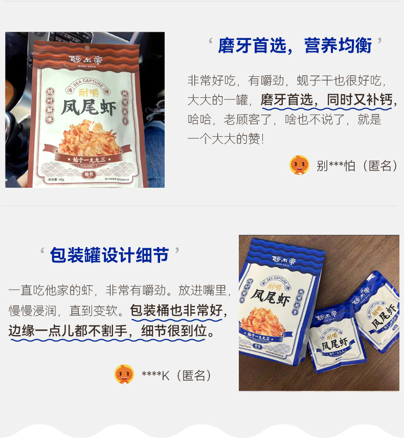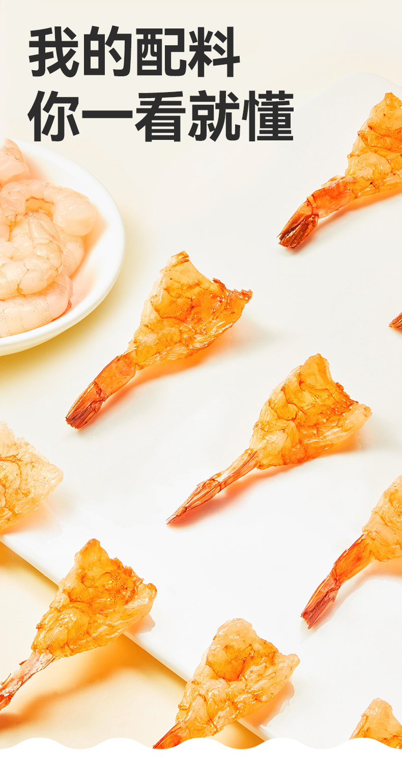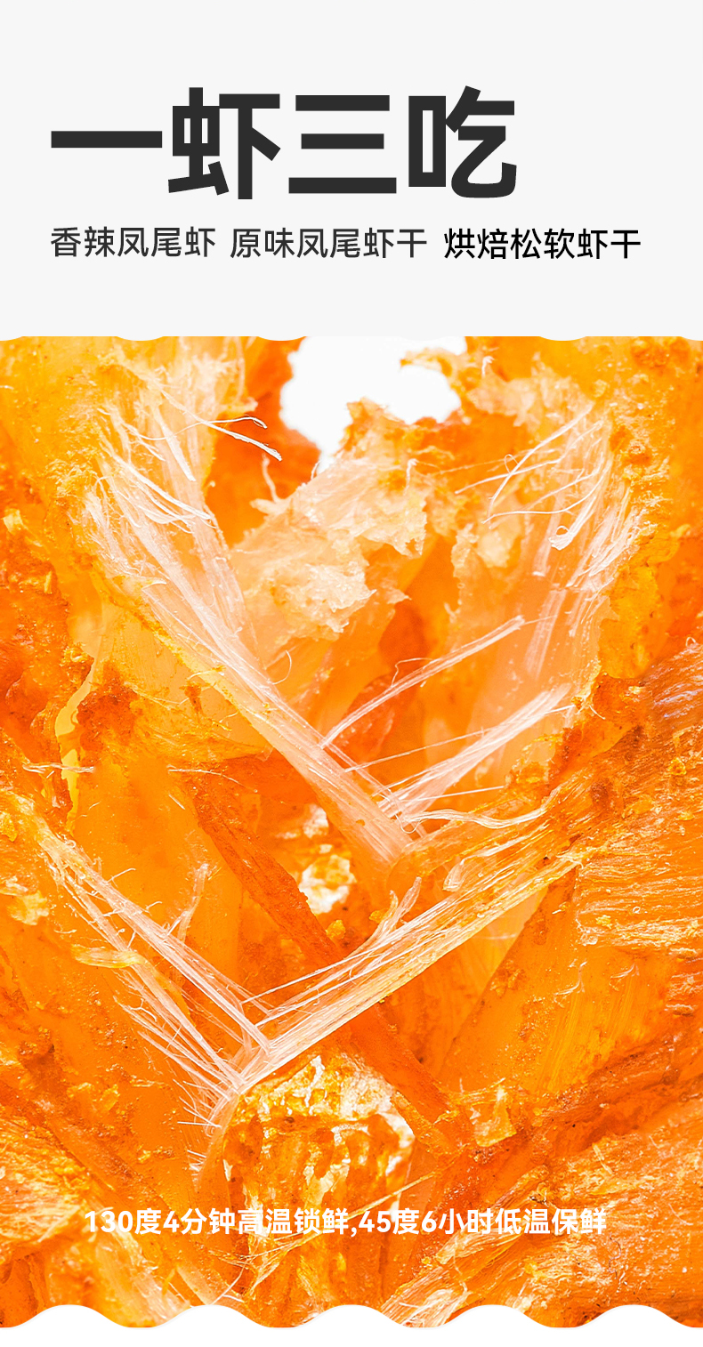 凤尾虾有三种口味,原味突出虾肉本身的鲜甜,低脂非油炸,还原纯粹本真;香辣味带着恰到好处的辛辣,解馋又过瘾;松软款就更好嚼些,小朋友更喜欢!口味上更是点睛,七分鲜两分咸,还带着一分微微甜,越嚼越香,根本停不下来。。。个头大,烤得又很干,磨牙首选,还能补补钙!