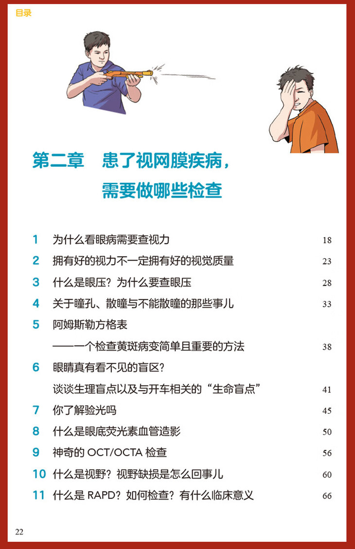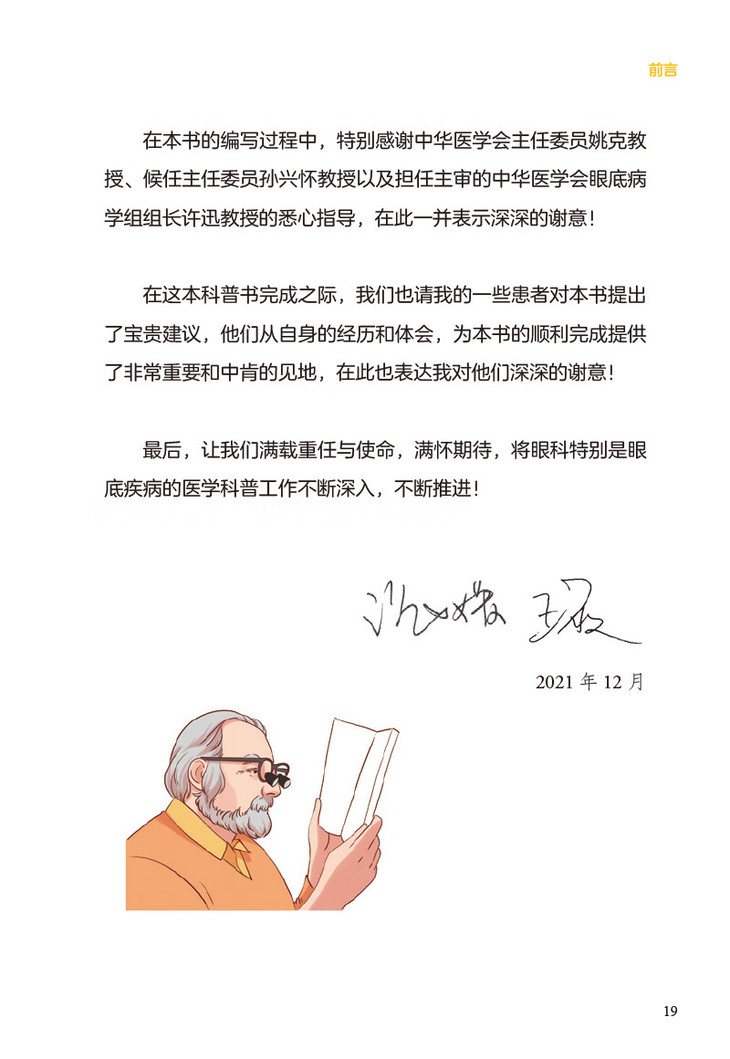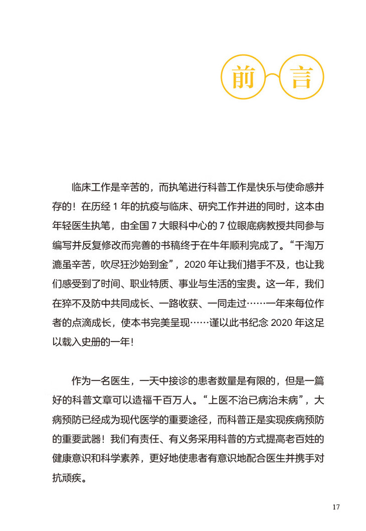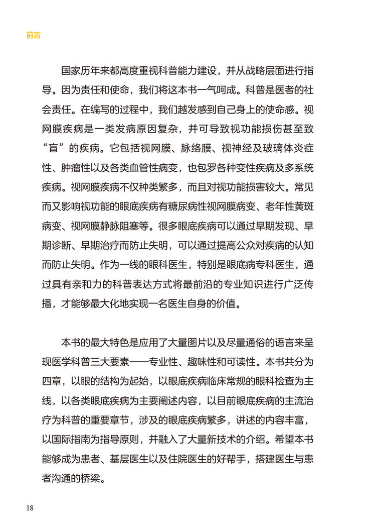 本书作者在工作之中深感在有限的就诊时间内很难对患者讲清楚患者可能要经历的诊治流程,在治疗过程中患者需要如何配合医生才能获得更好的疗效。因此作者在工作之余,就患者经常问及的问题,在自己的公众号中通过文章予以解答,希望患者在就诊后以及下次就诊前主动阅读,获得更多的科学、靠谱的与自身疾病相关的知识,有益于患者的自我健康管理。本书为一本深入浅出的眼底疾病的科普类作品。书中介绍了在日常生活中最常见的50种眼底疾病,其目的为使患者了解疾病的同时,指导患者配合治疗; 也可成为眼底科医生在临床诊疗中,帮助患者答疑,节省医疗资源,成为临床医生与患者之间沟通的桥梁。