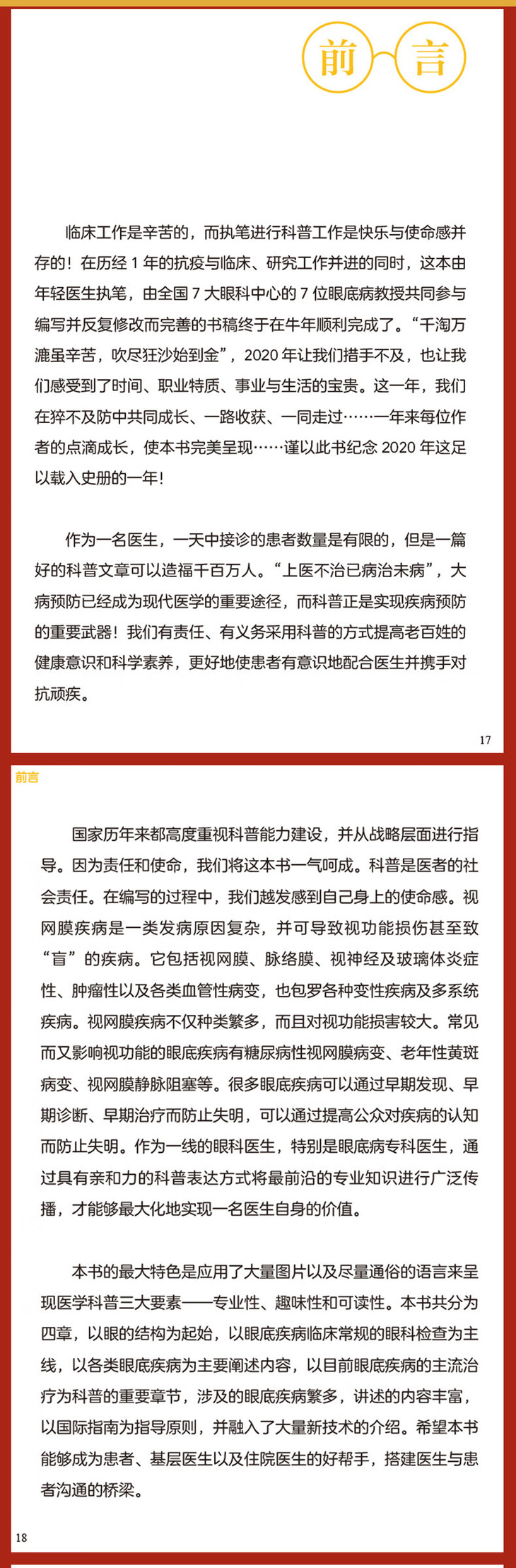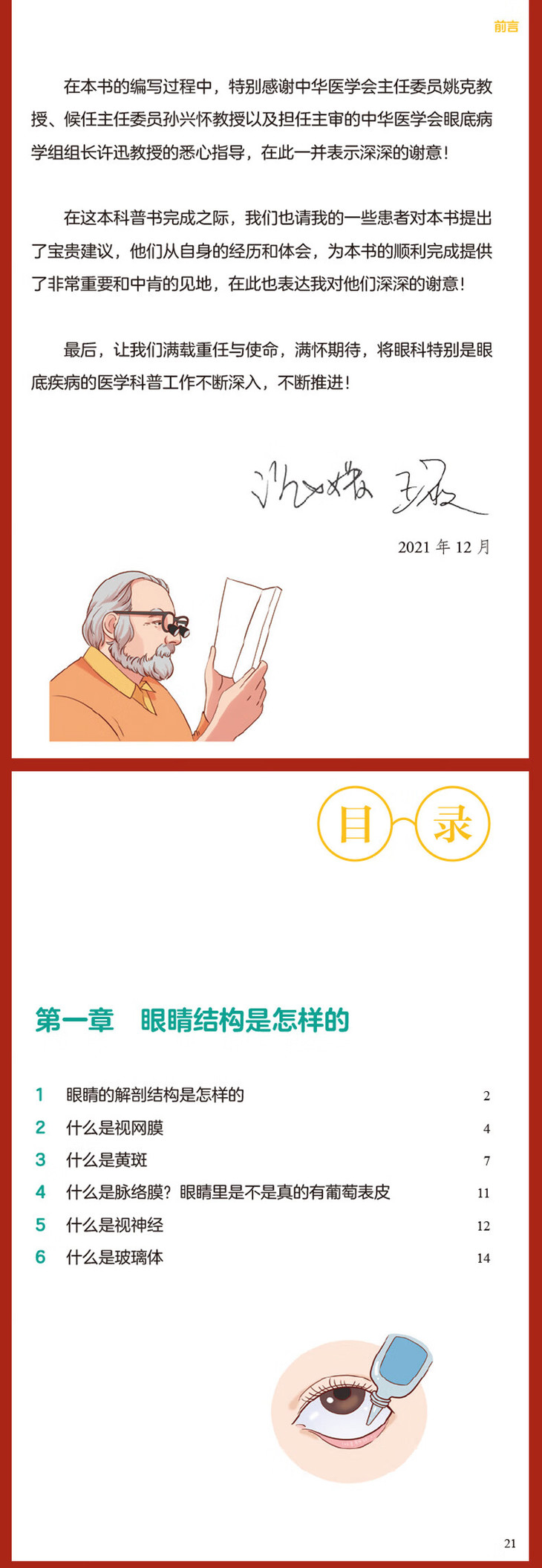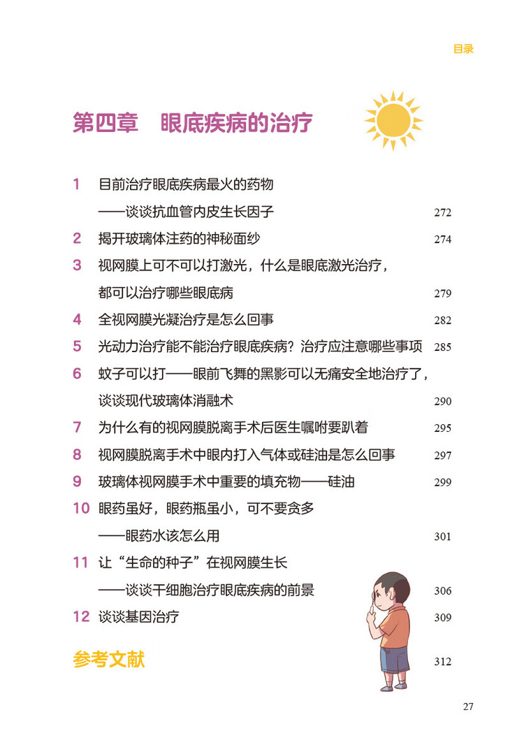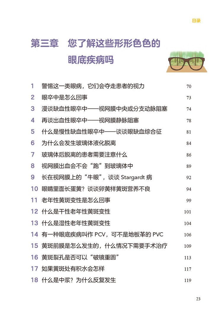 本书作者在工作之中深感在有限的就诊时间内很难对患者讲清楚患者可能要经历的诊治流程,在治疗过程中患者需要如何配合医生才能获得更好的疗效。因此作者在工作之余,就患者经常问及的问题,在自己的公众号中通过文章予以解答,希望患者在就诊后以及下次就诊前主动阅读,获得更多的科学、靠谱的与自身疾病相关的知识,有益于患者的自我健康管理。本书为一本深入浅出的眼底疾病的科普类作品。书中介绍了在日常生活中最常见的50种眼底疾病,其目的为使患者了解疾病的同时,指导患者配合治疗; 也可成为眼底科医生在临床诊疗中,帮助患者答疑,节省医疗资源,成为临床医生与患者之间沟通的桥梁。