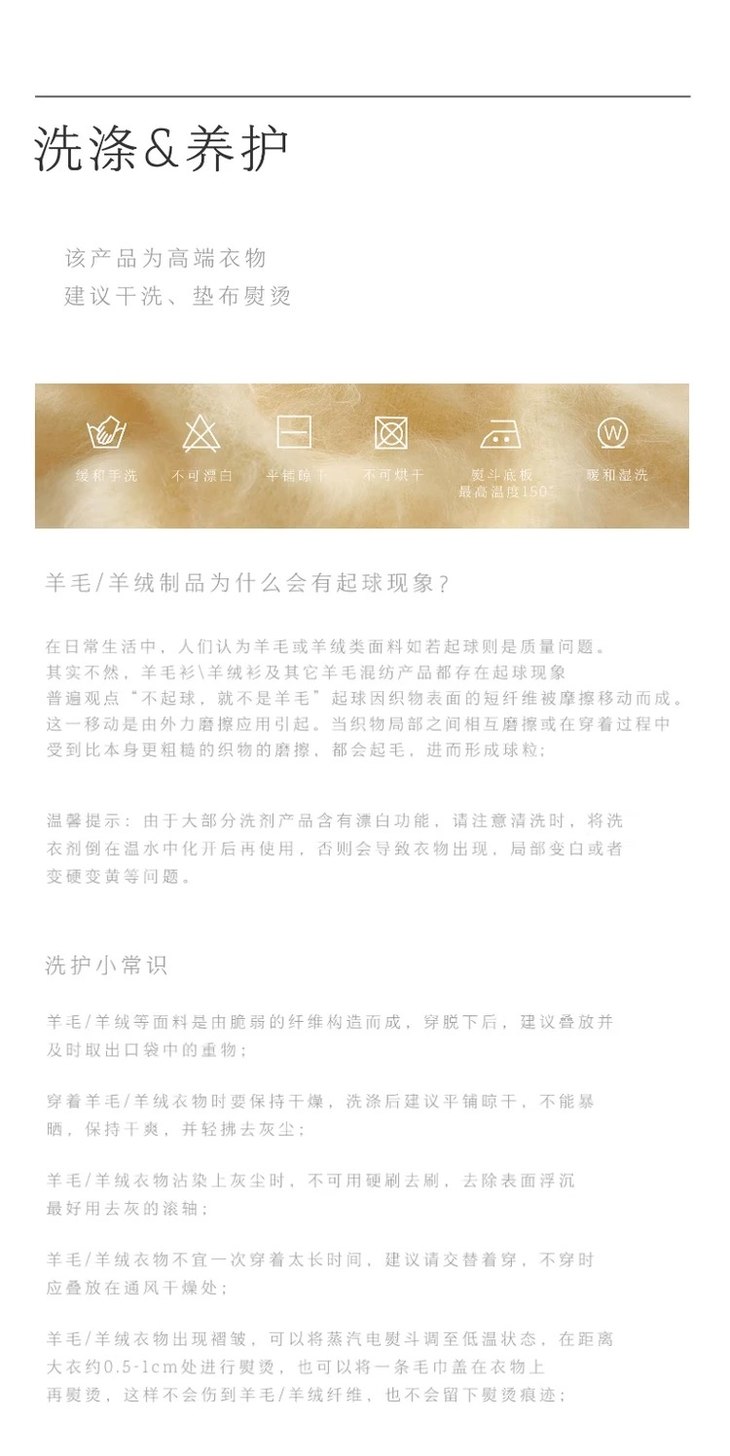 洗涤建议:建议干洗,或用中性洗涤剂低温手洗。