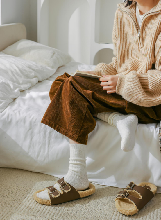 可以搭配那种漏脚趾的羊毛拖一点也不冷的,双脚暖了、浑身都是暖乎乎的