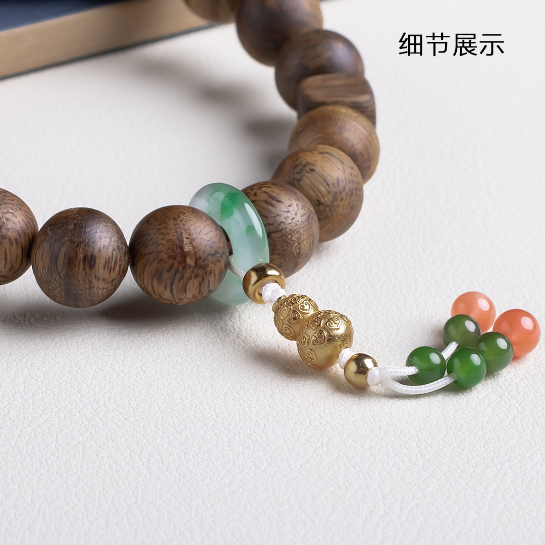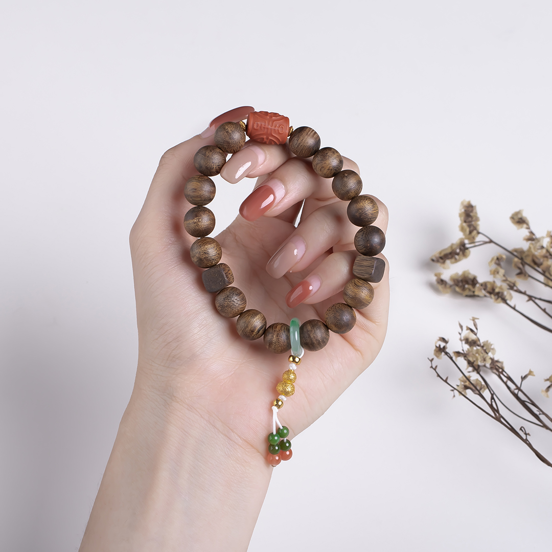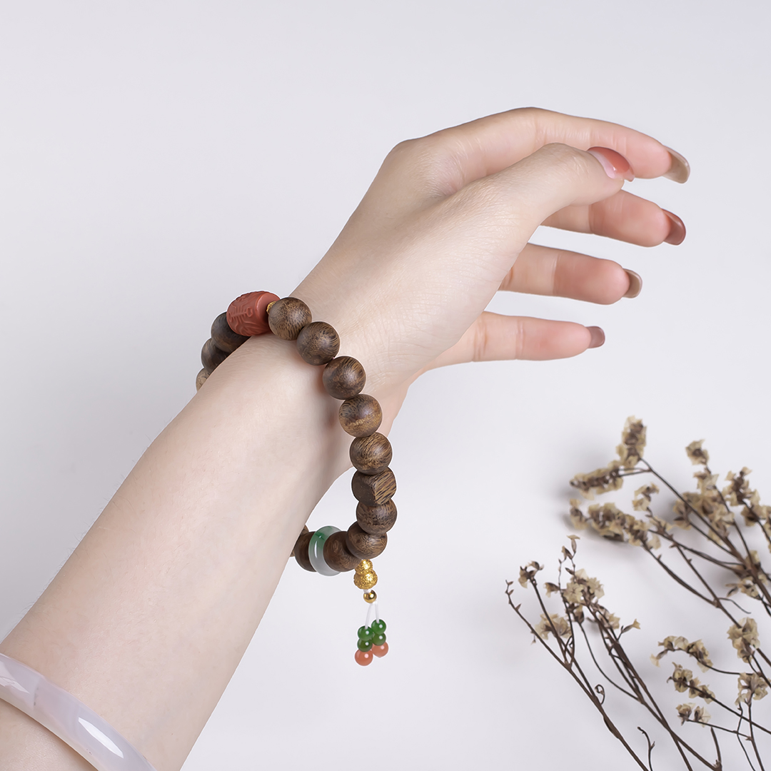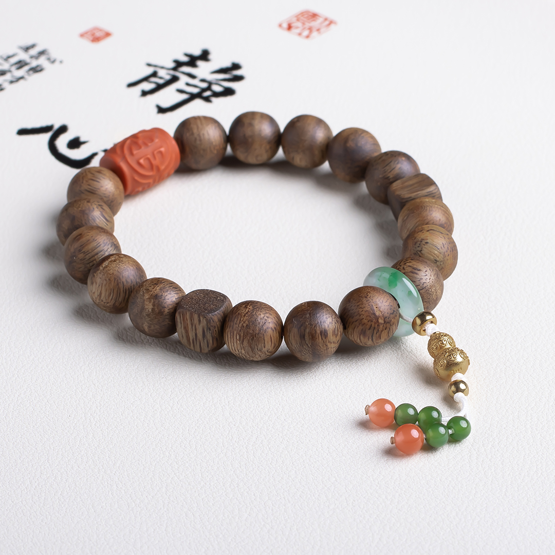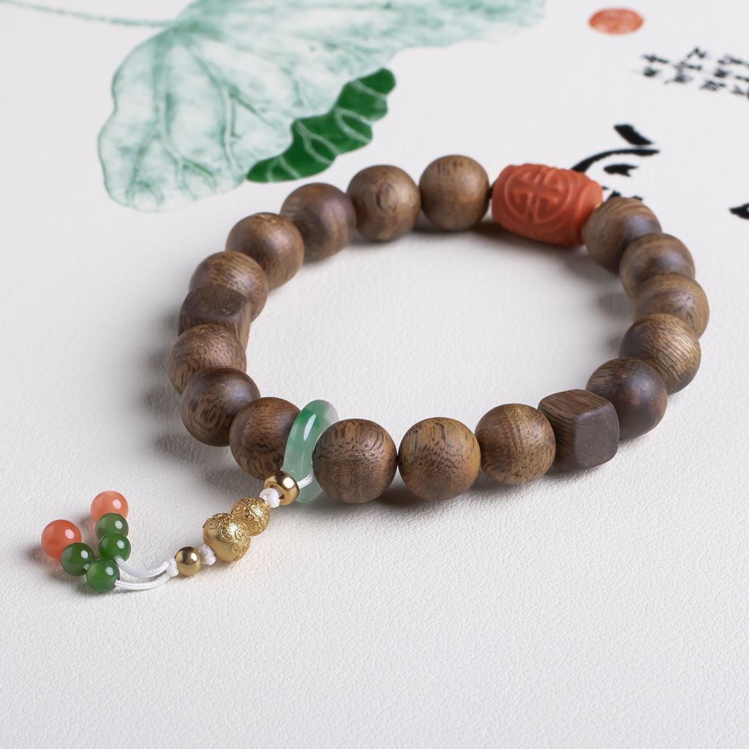 xy0429沉香+南红福寿珠手串.银,天然沉香约10.3mm,原色原味,香味自然清甜,一颗满色肉的南红,雕刻寿字,一枚银镀金的葫芦小坠,福禄相伴,国风穿搭,安康纳福。