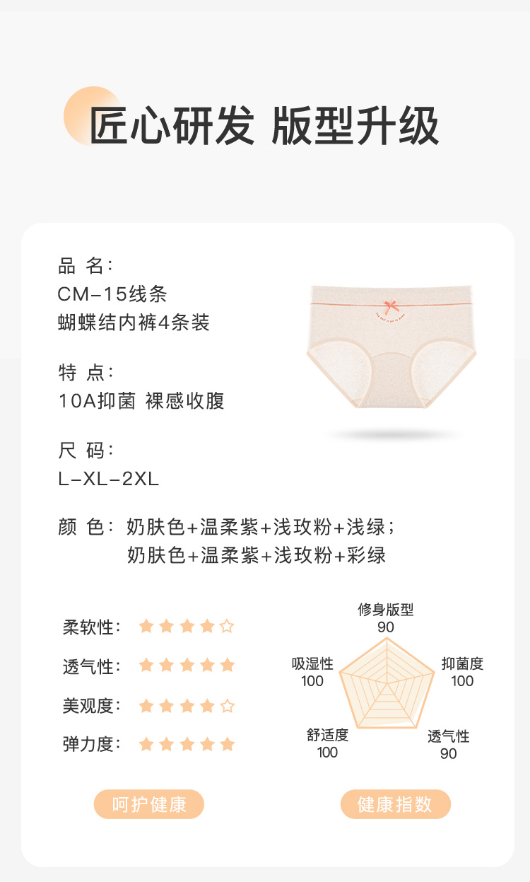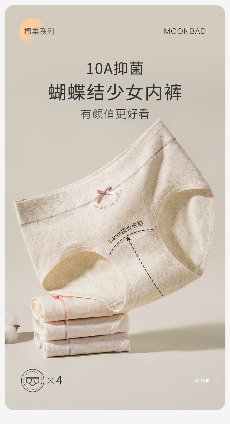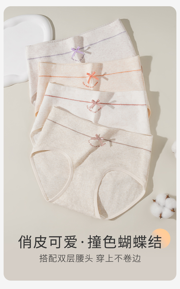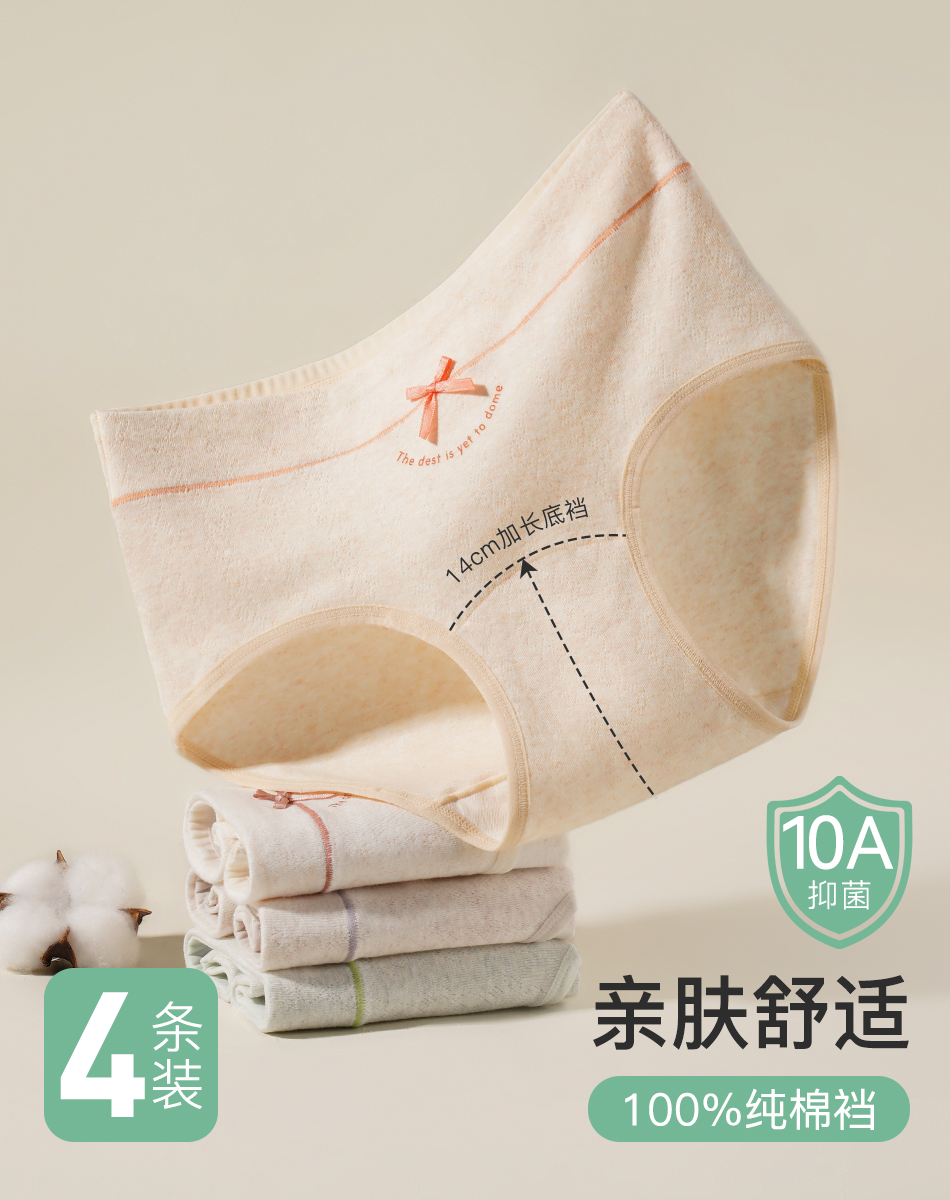 【4条装】10A抑菌纯棉加长裆内裤女舒适0染原棉高弹不夹臀CM-15线条蝴蝶结内裤