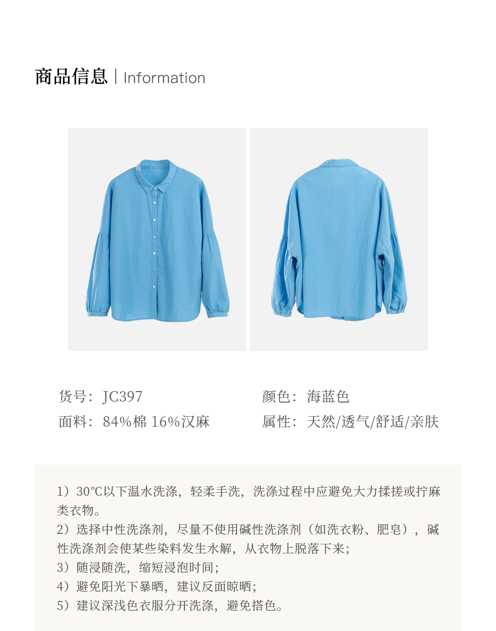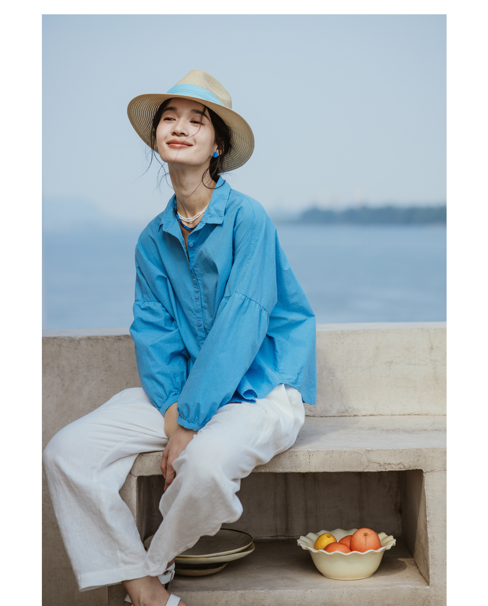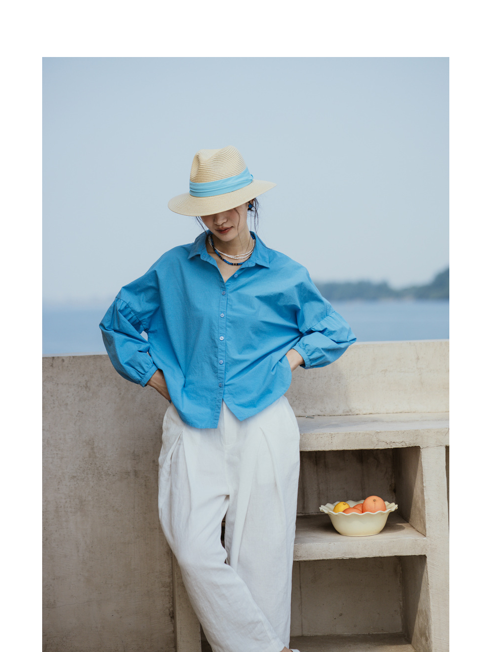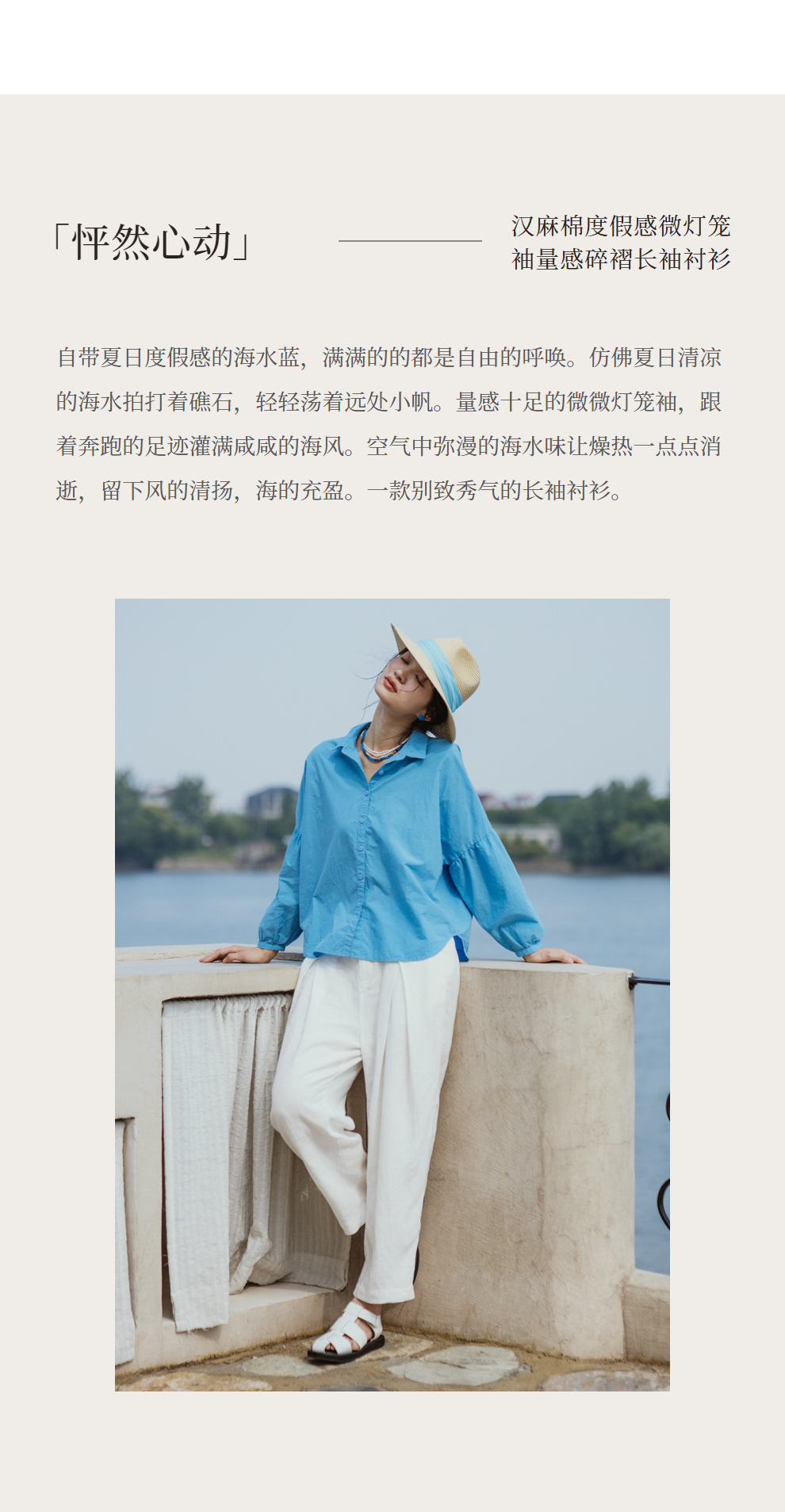 * 绽放装397朵【入蓝系列】海蓝色高端汉麻棉海边度假灯笼长袖衬衫