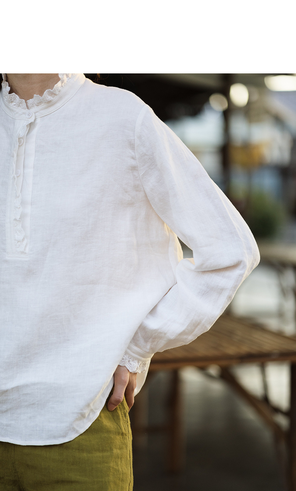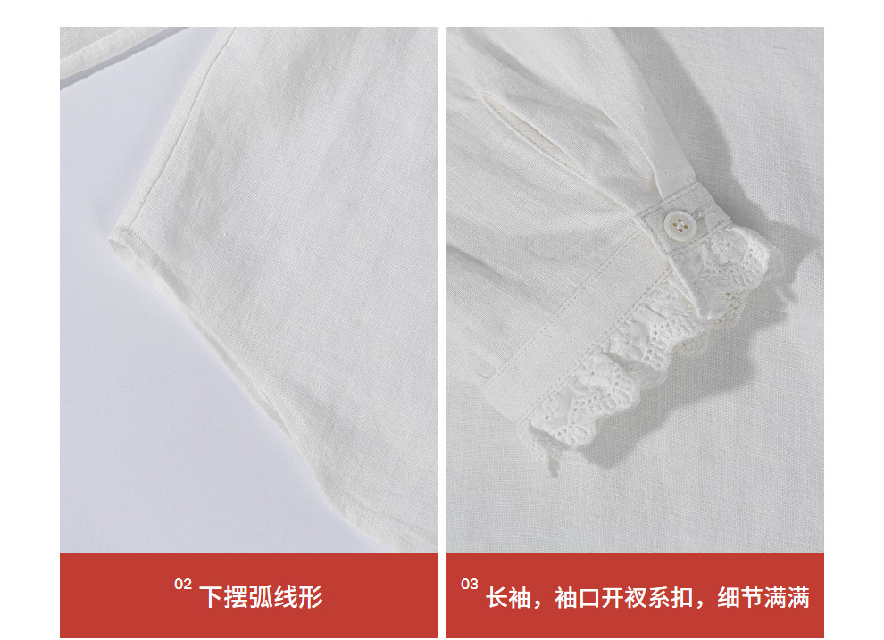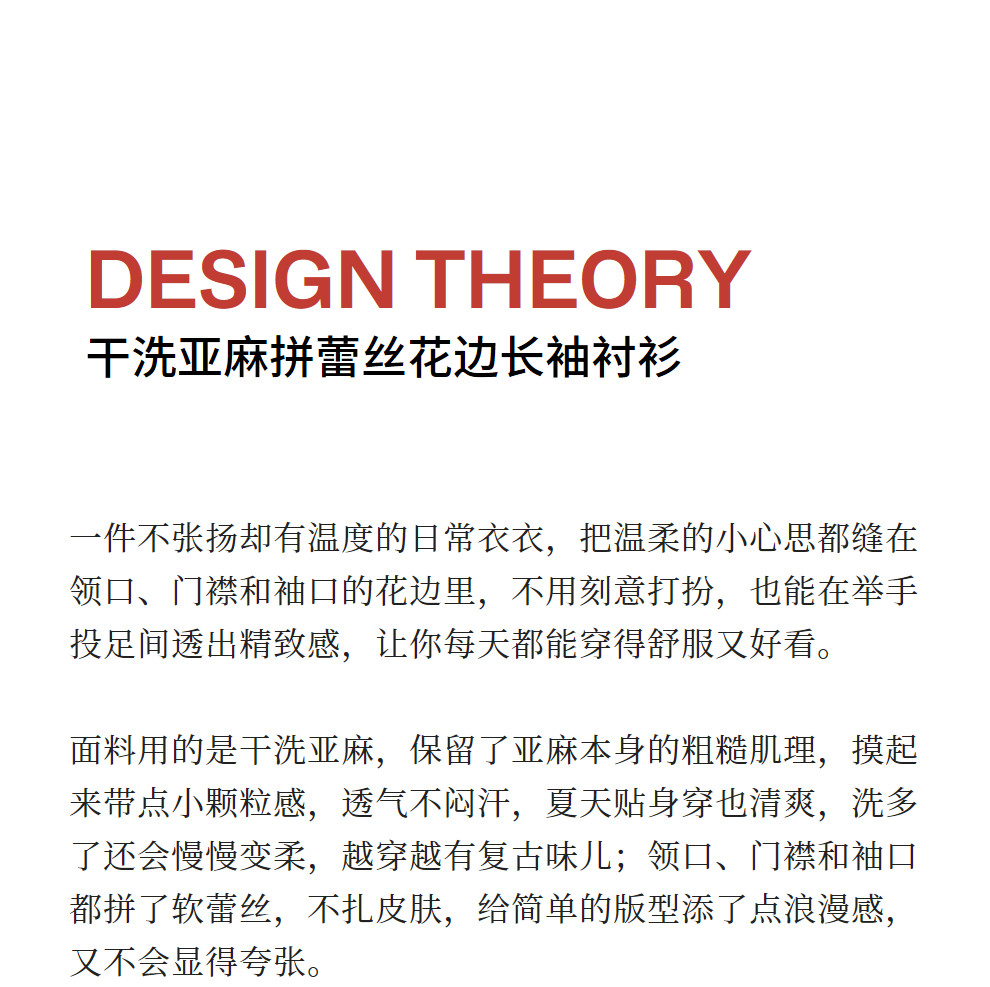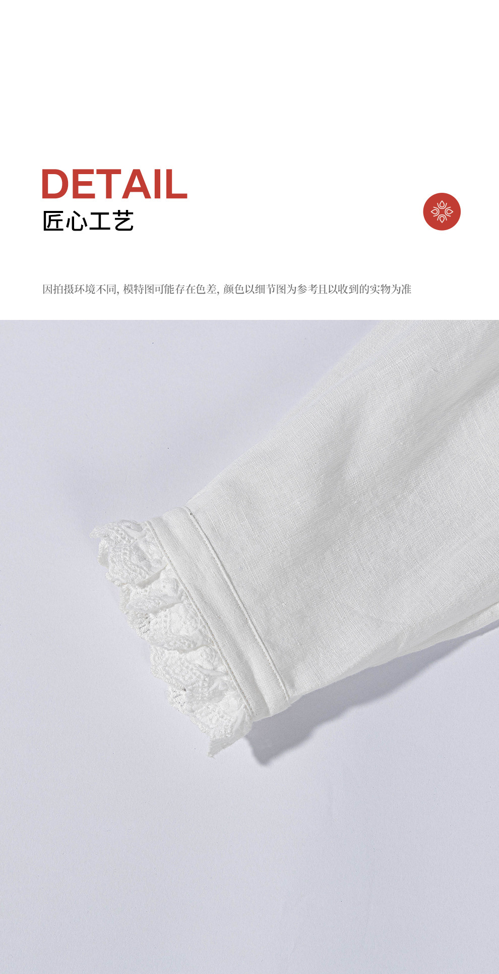 绽放106朵/干洗亚麻拼蕾丝花边正常肩长袖衬衫女夏新款半开襟小衫