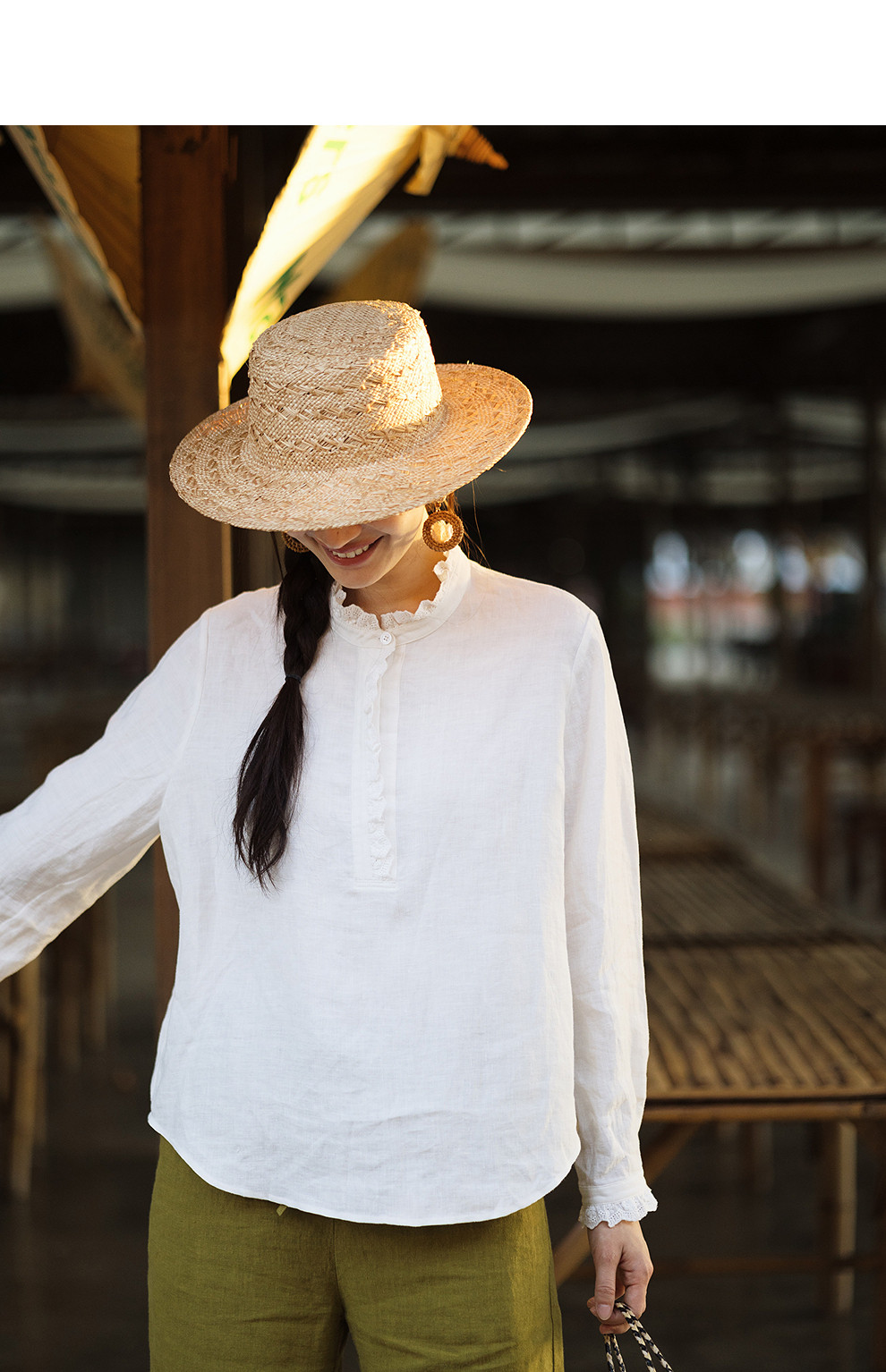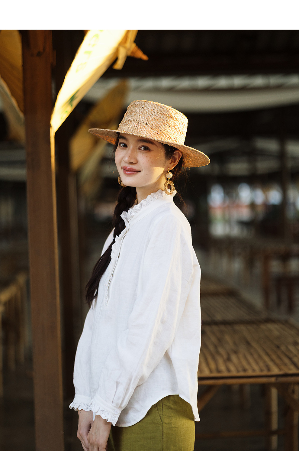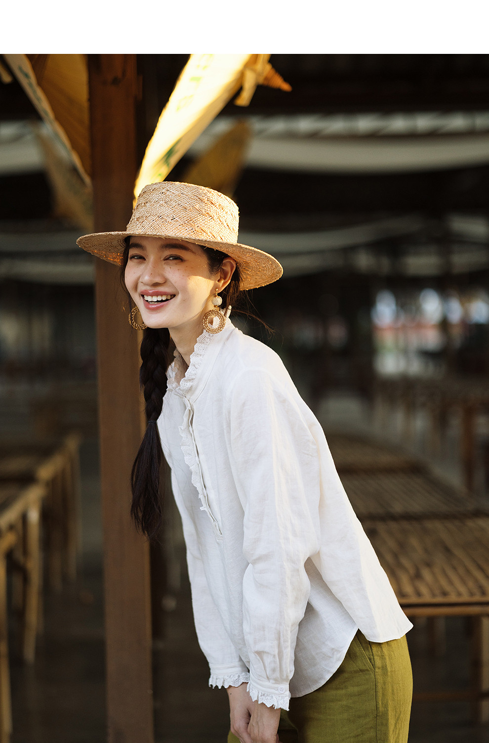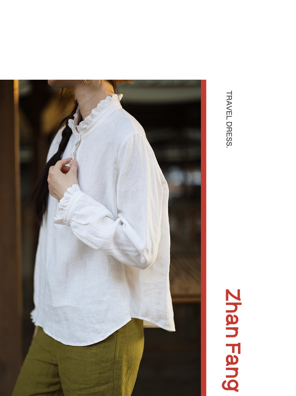 绽放106朵/干洗亚麻拼蕾丝花边正常肩长袖衬衫女夏新款半开襟小衫