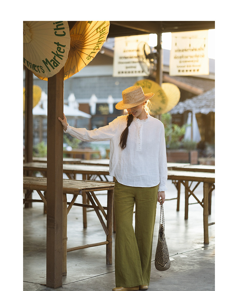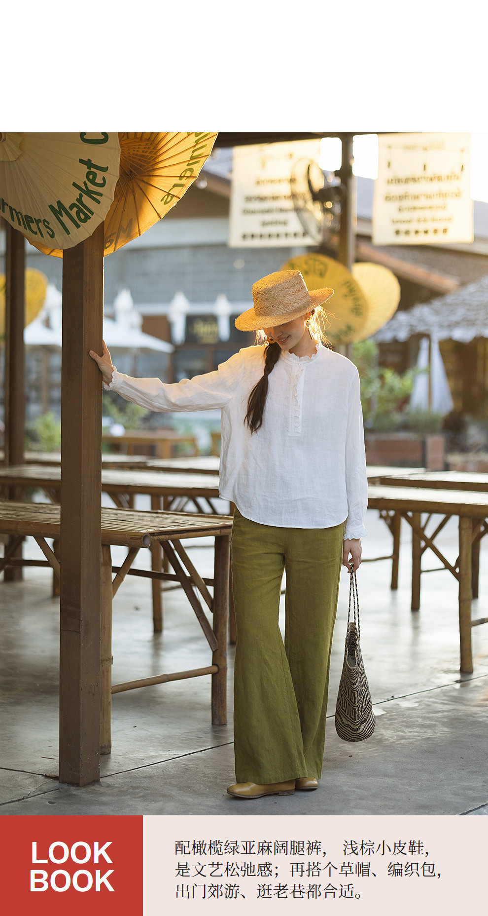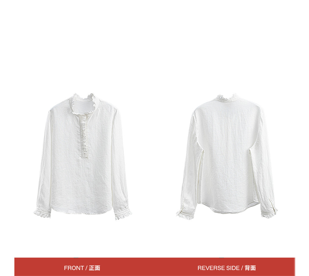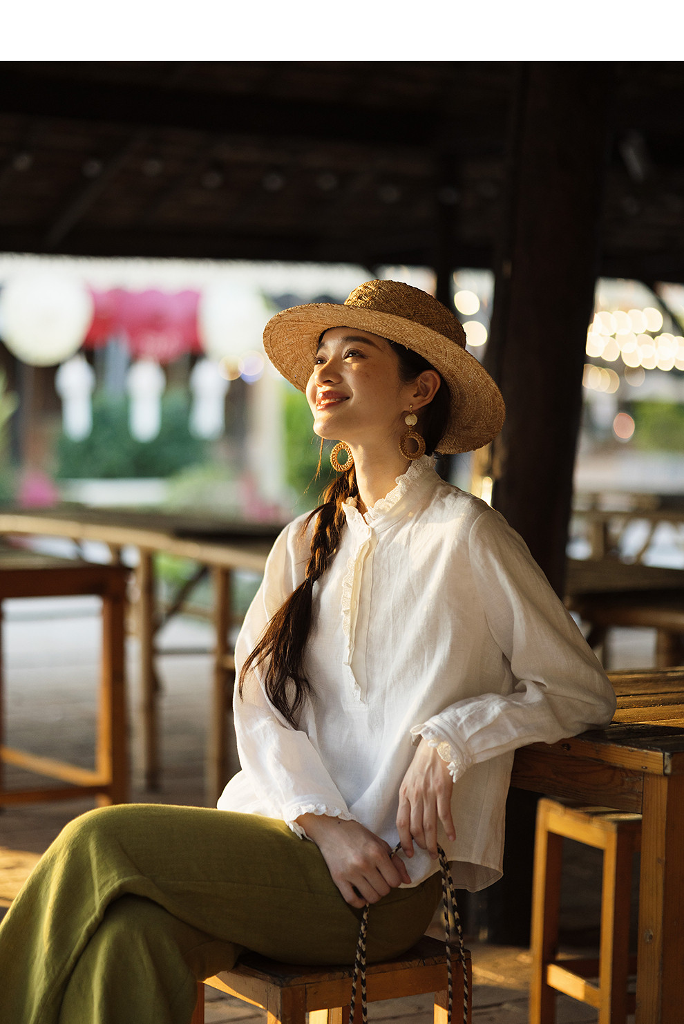 绽放106朵/干洗亚麻拼蕾丝花边正常肩长袖衬衫女夏新款半开襟小衫