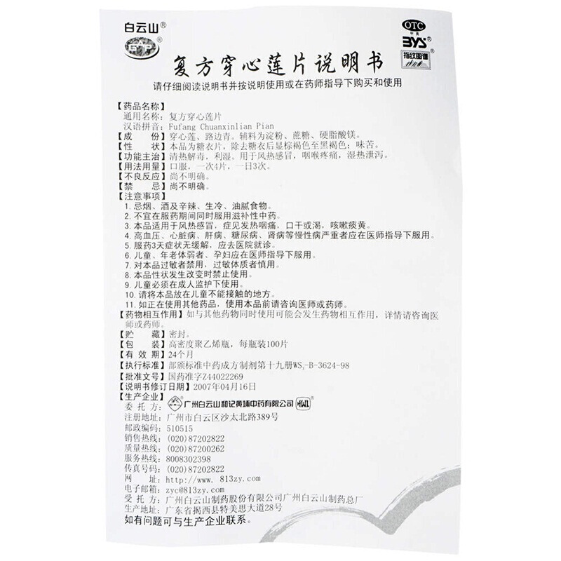 白云山复方穿心莲片100片*1瓶/盒清热解毒 咽喉疼痛 风热感冒