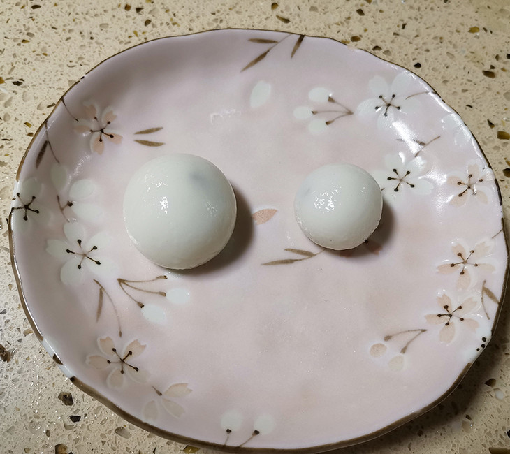 我把普通汤圆和王升大汤圆煮熟,然后把汤圆切开。