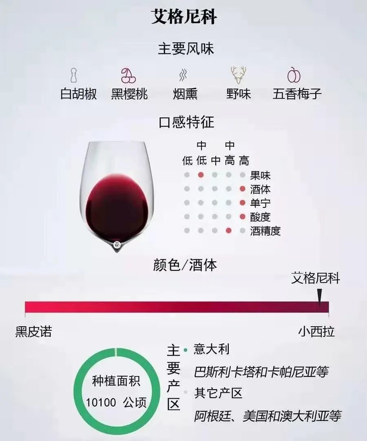 在布满火山岩的山坡上生长得最好。艾格尼科最大的一个特点就是即使是在炎热气候下种植,也会呈现较高的酸度。所酿造的酒款酒体饱满、单宁充沛、酸度十足,酒精度中等偏上。