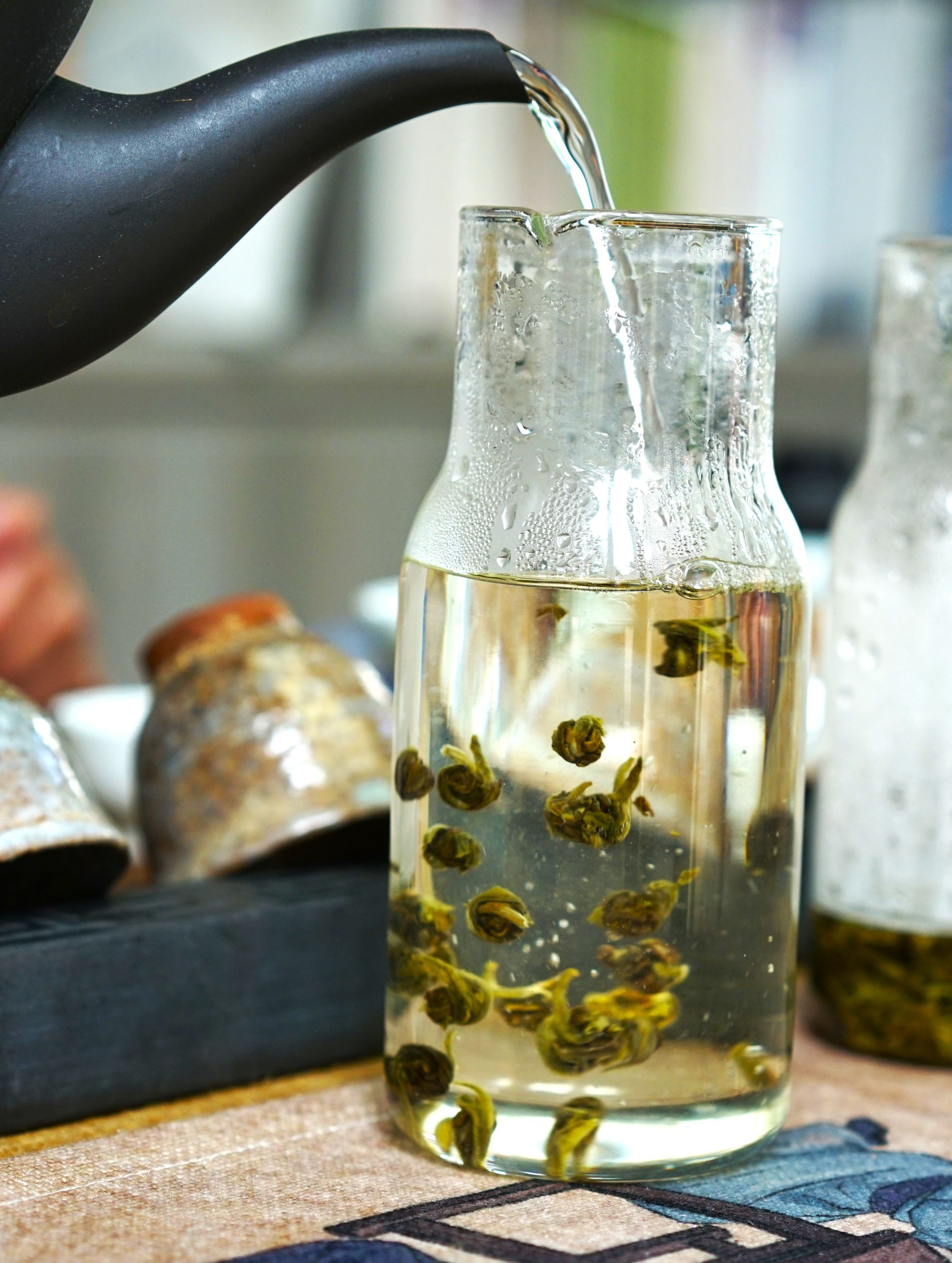 用盖碗冲泡茉莉龙珠时,水温不宜太高,水开后把烧水壶盖打开稍微等十几秒就可以啦!前三道沿杯壁注水,等后面几道茶叶已经舒展了再适当淋茶叶。可根据个人滋味调整倒出茶汤时间。