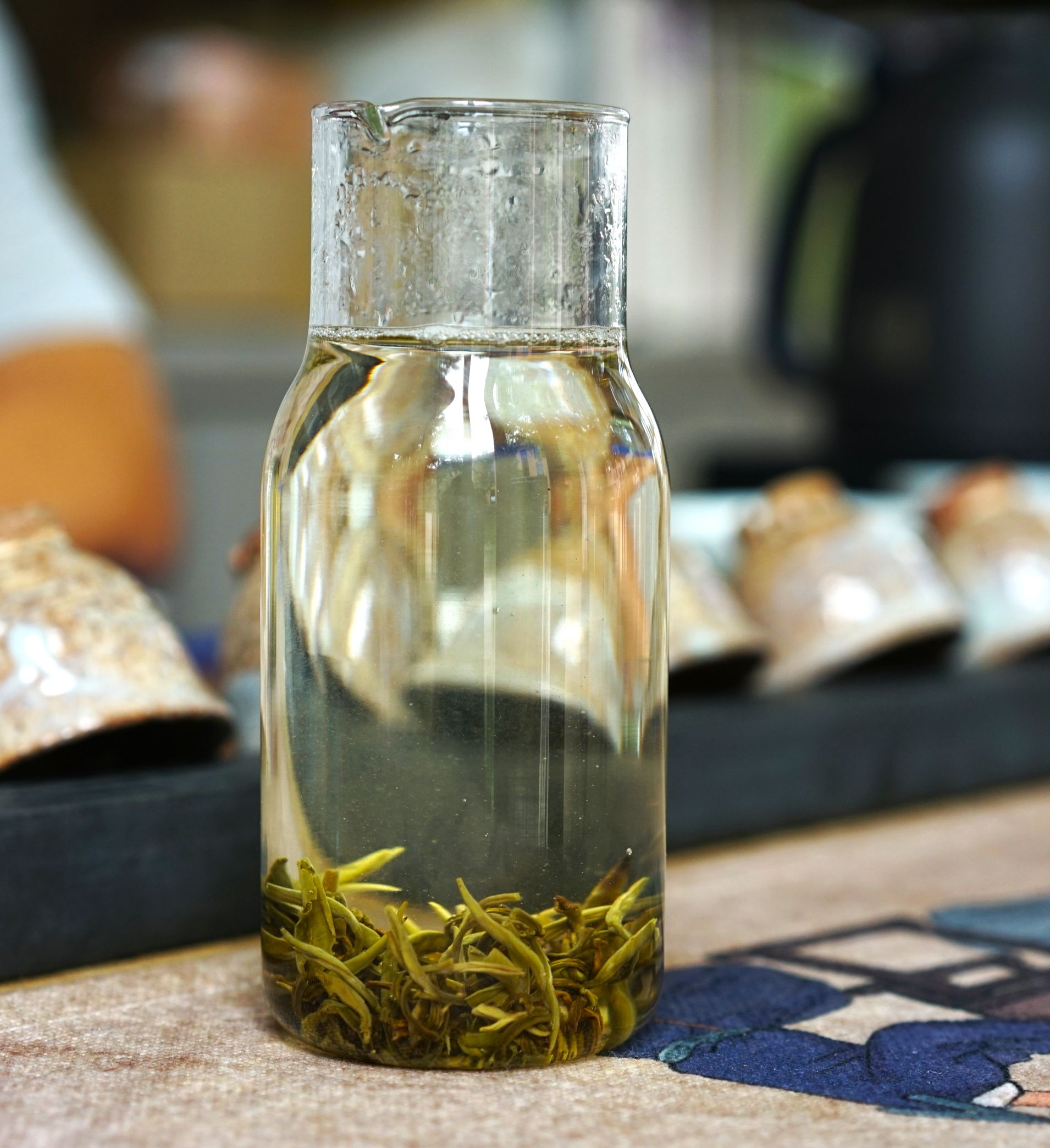 将龙珠投入盖碗,经过几道的冲泡,能看见茶叶在水中慢慢化开,芽头舒展,茶汤清亮;细啜一口,香气绵柔,滋味甘甜;叶底以嫩芽为主,带有短嫩茶梗,偶有些许叶片。