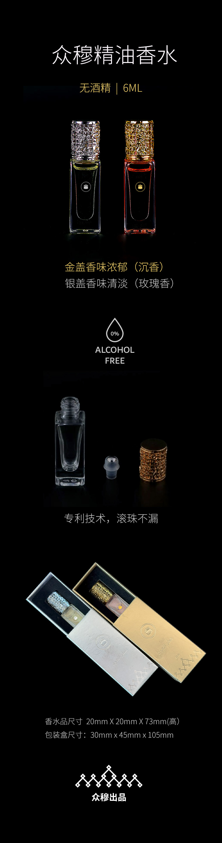 本款香水选择中东地区最受欢迎的两种味道,金盖是浓郁的沉香味,银盖是清淡的玫瑰香味。