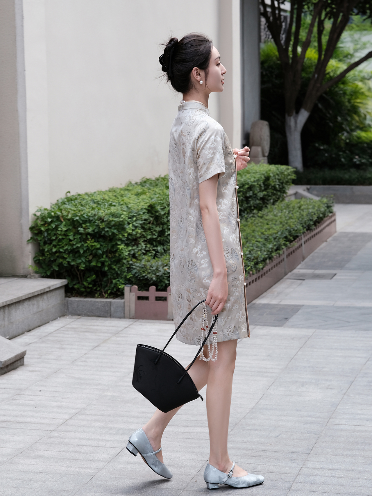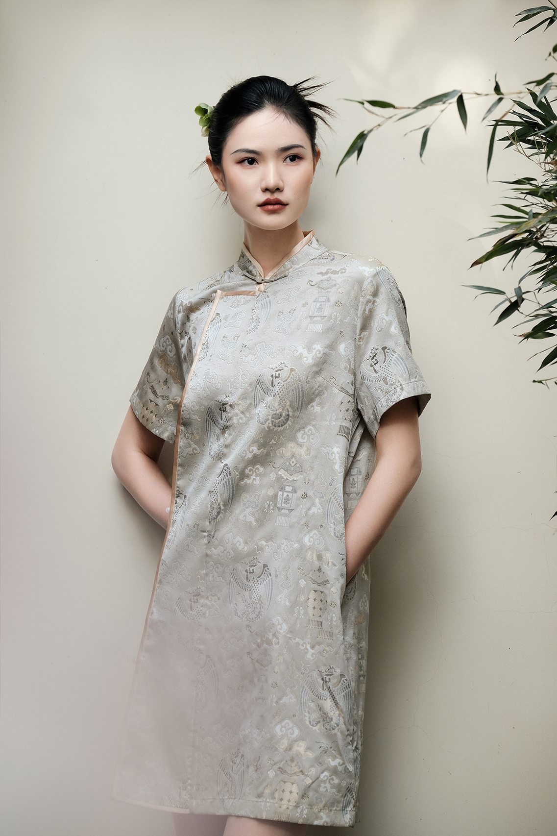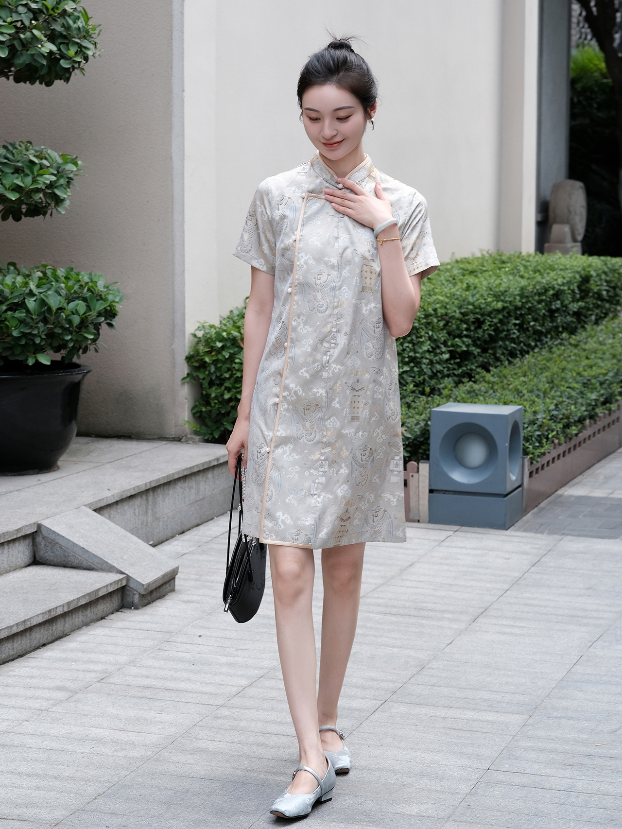 盛唐婧 |宋锦异色箩小立领偏襟连衣裙