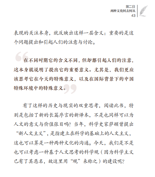 西方工业革命之后,科学家与人文学家、科学文化和人文文化,从互不相通到彼此冲突撕裂。科学与人文两种文化的融合问题,是当今世界亟待解决的重大理论问题和现实问题。中华优秀传统文化中科学与人文的沟通与对话,正是中华文明的独特之处。中华传统文化中科学与人文的对话,以及今日中国在科学与人文方面的现状,科学和人文的融合都值得我们进行深入思考。要建设民主、富强、可持续发展的中国,科学与人文必须相互借鉴,取长补短,构建一种具有时代特色、民族的也是世界的新文化。