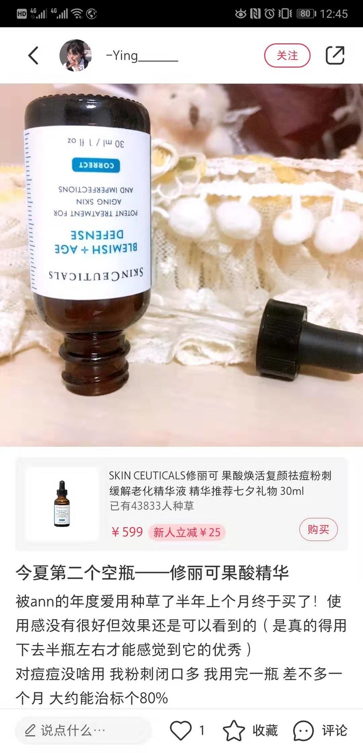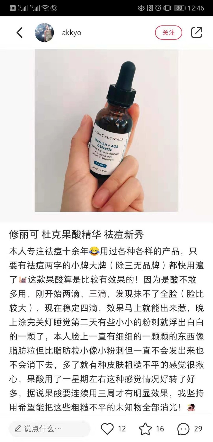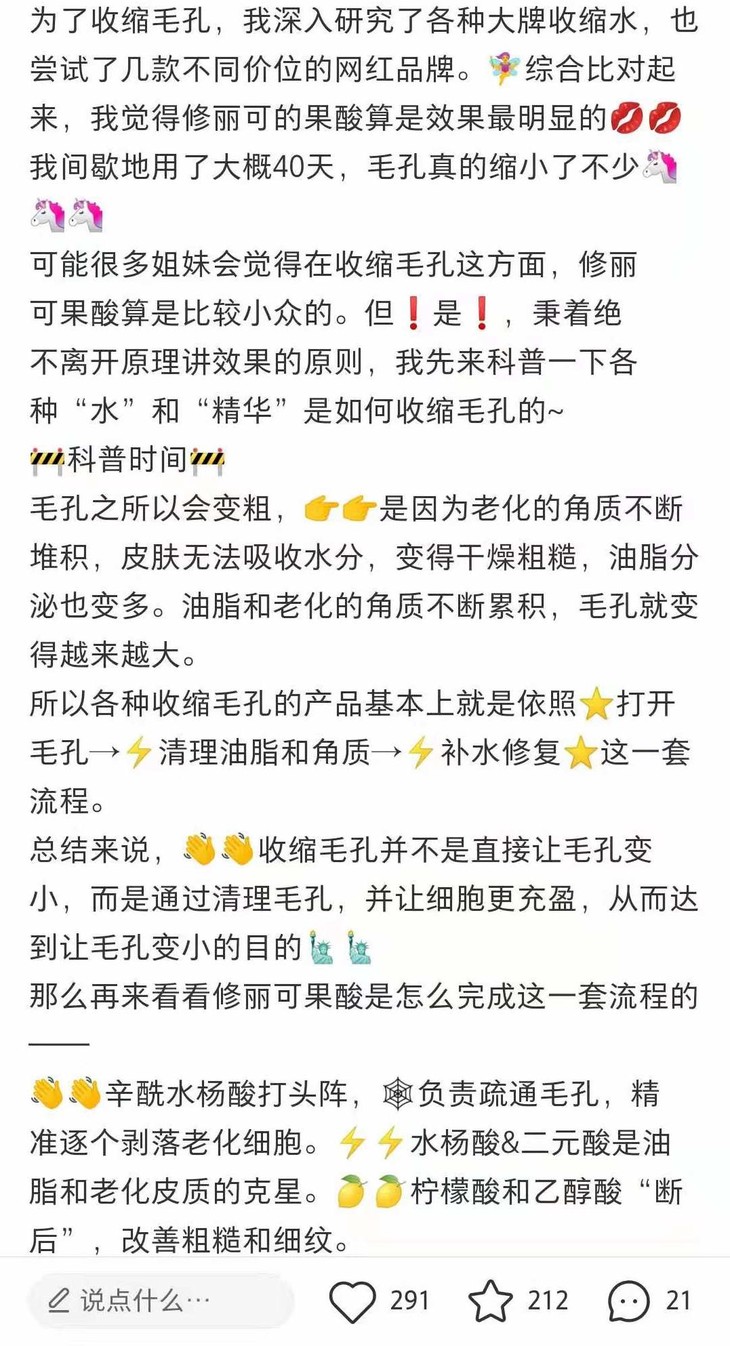 针对普通痤疮、粉刺、闭口这些问题,壹可的杏仁酸和老粉里的博乐达真的是好用,我己经很少很少爆痘了,所以我日常也不怎么刷酸。跟我一样被杏仁酸治好痘痘的老粉真的太多,这次开始上修丽可全套,我也为痘痘肌和油皮小仙女准备了这支果酸焕活精华,是修丽可产品线里比较有针对性适用于油皮和痘肌的精华。