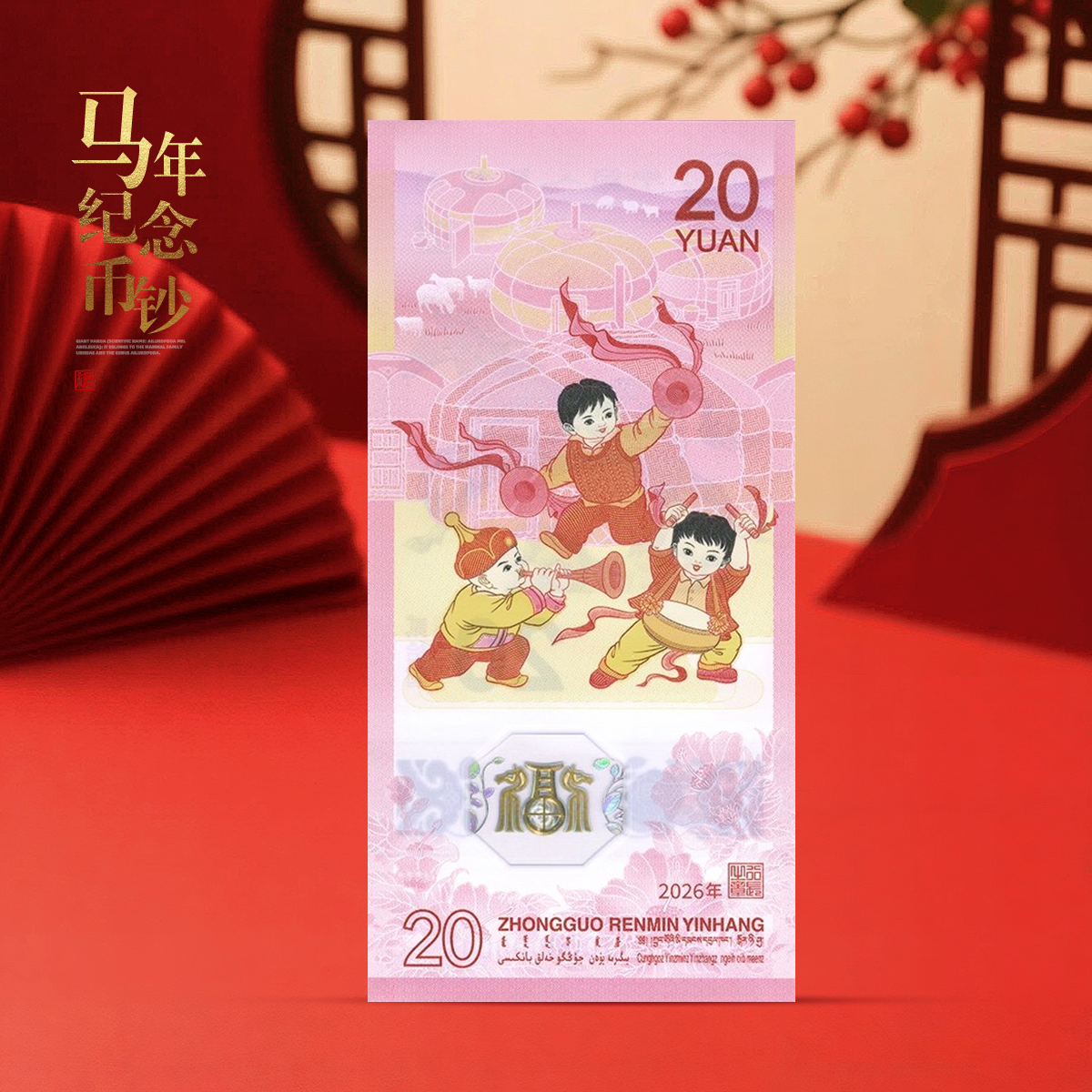 2.纪念钞面额20元,票面长145毫米,宽70毫米,采用塑料材质,发行数量为1亿张。