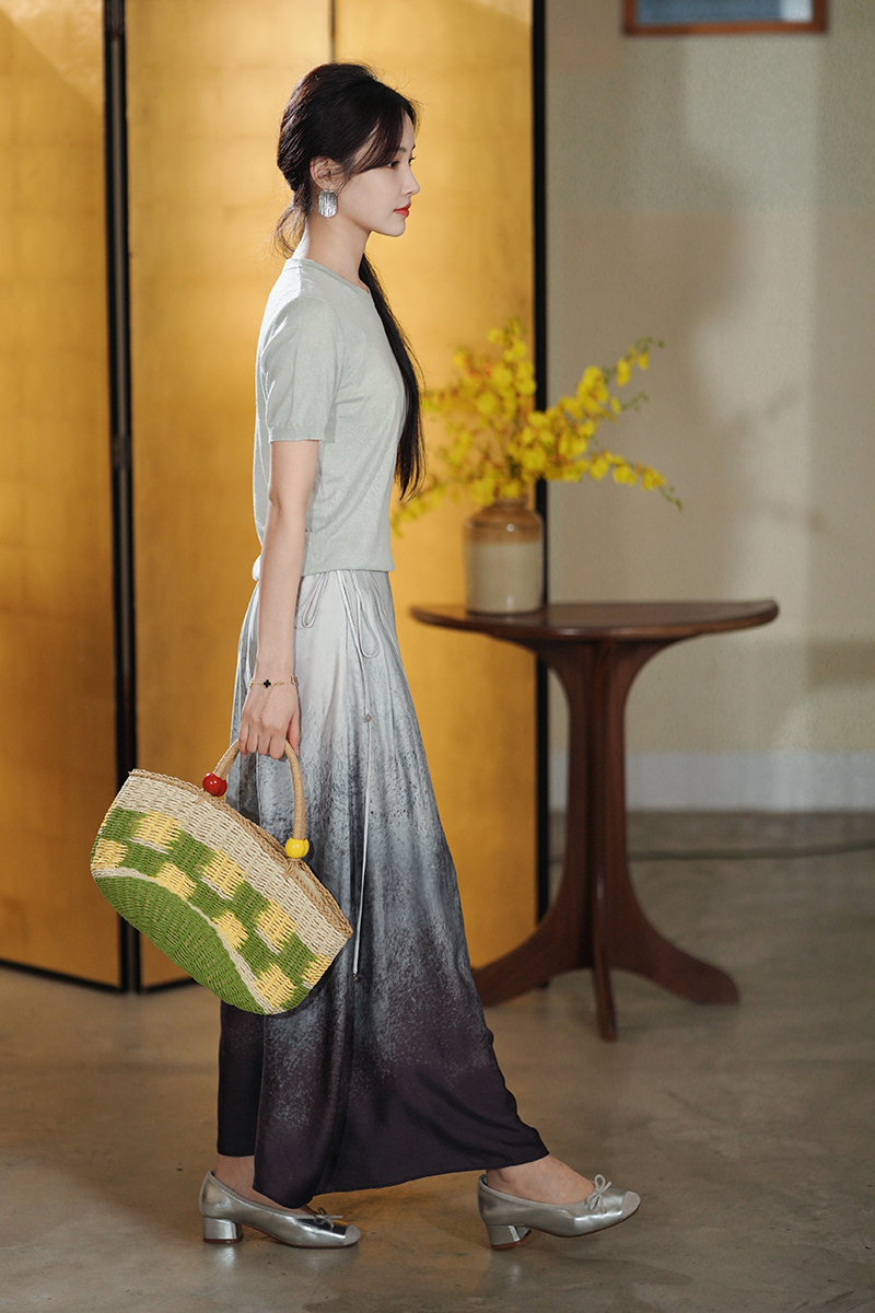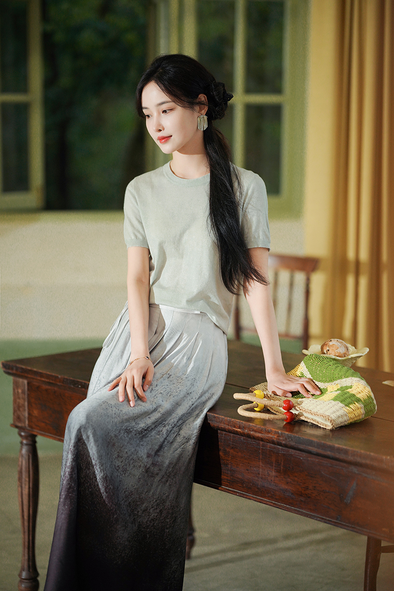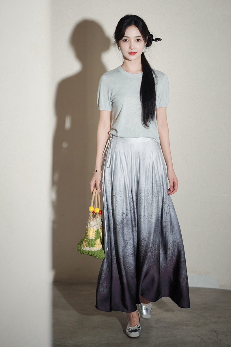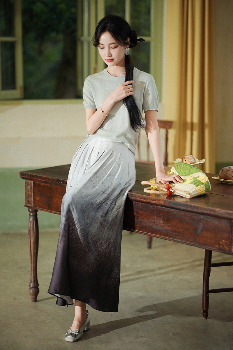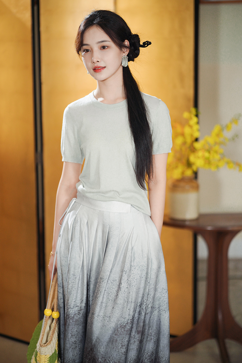 比T更有松弛新中式的韵味,搭配半裙展现出山水的层次感和动态之美,营造出宁静、内敛、高雅的氛围~~
