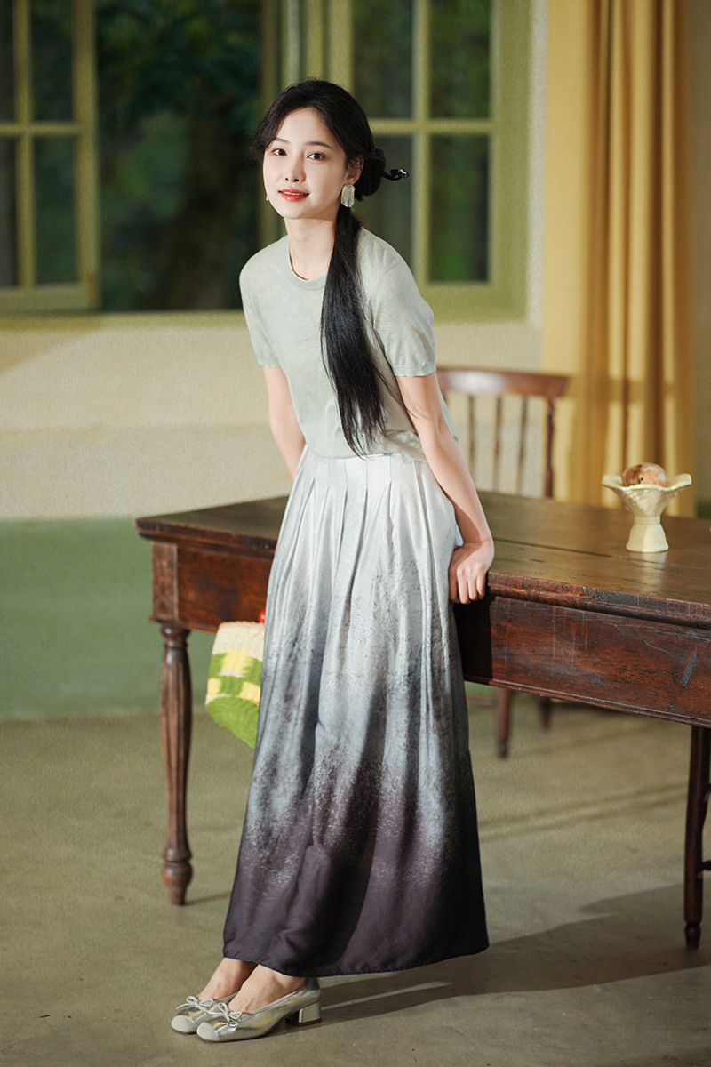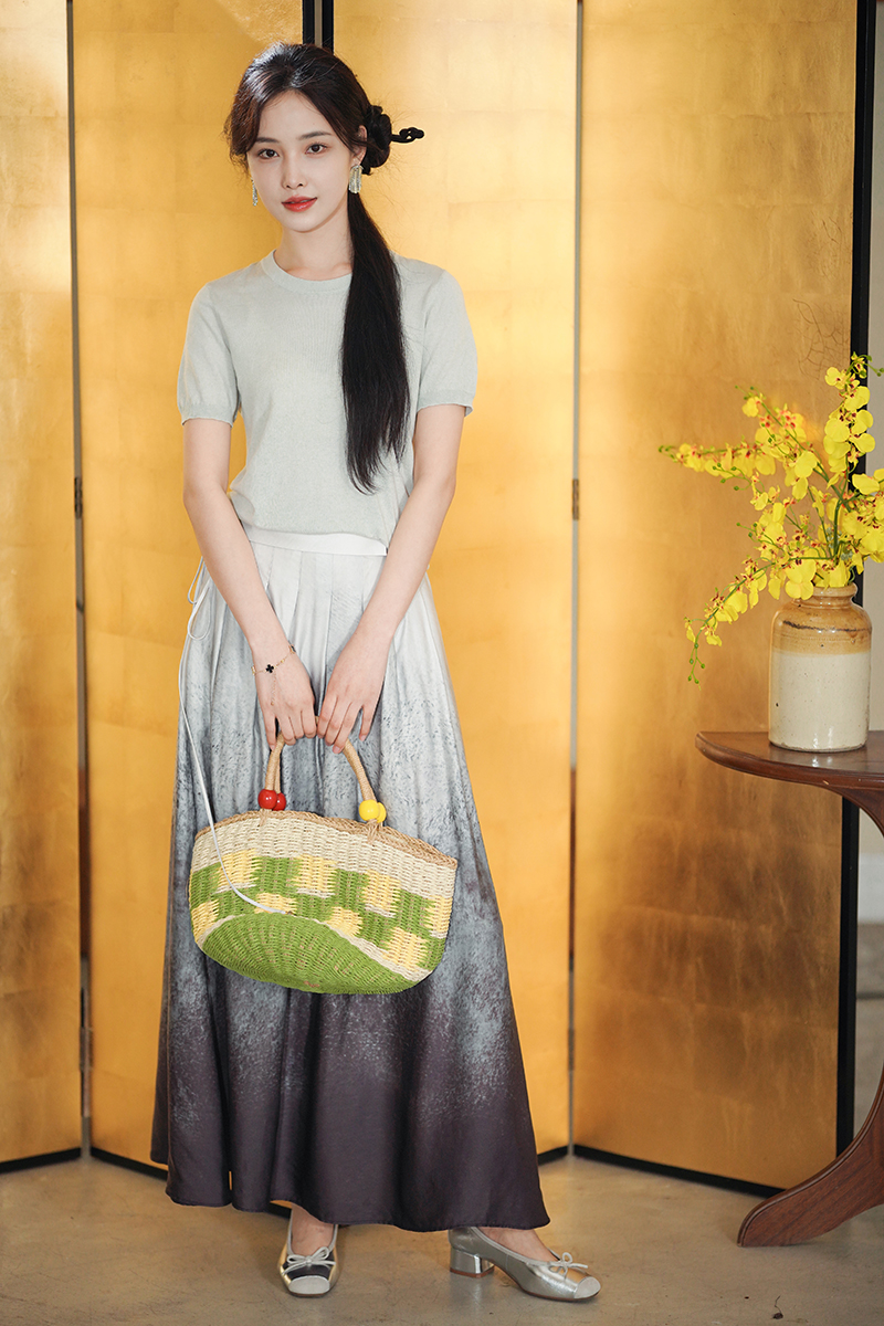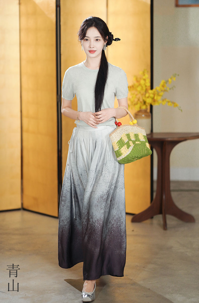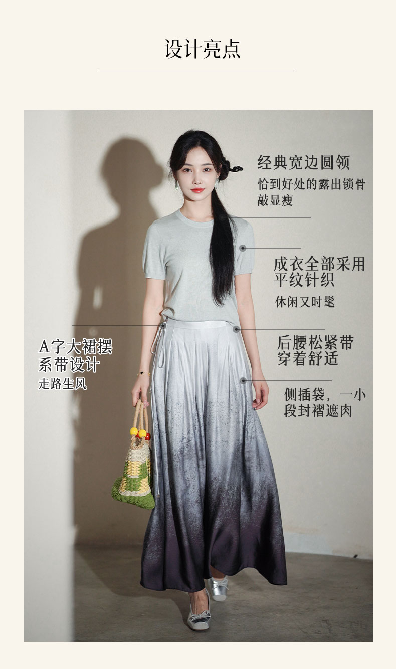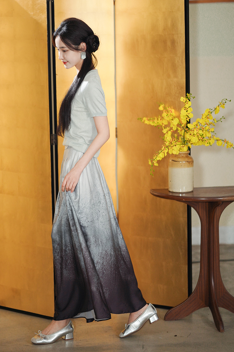 比T更有松弛新中式的韵味,搭配半裙展现出山水的层次感和动态之美,营造出宁静、内敛、高雅的氛围~~