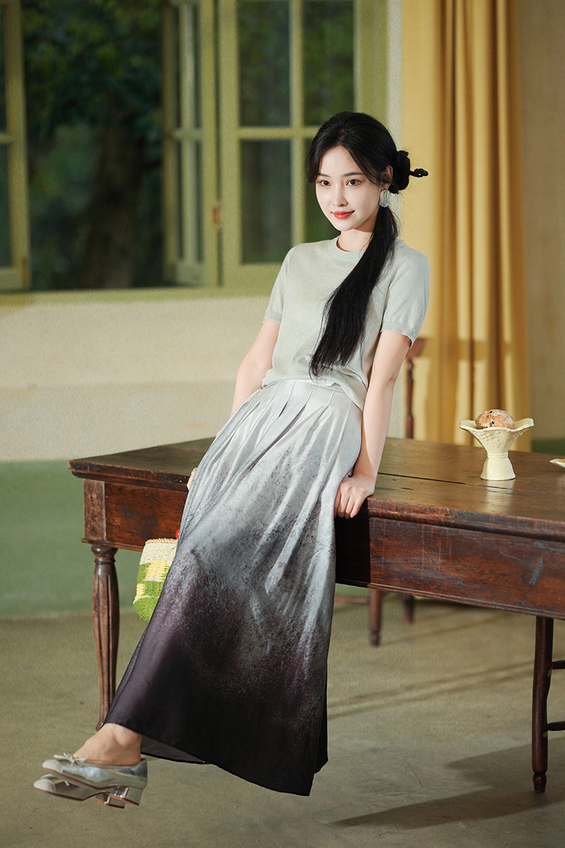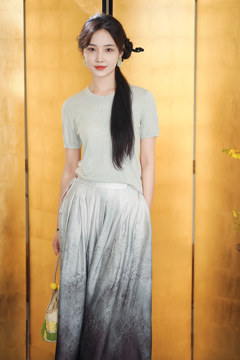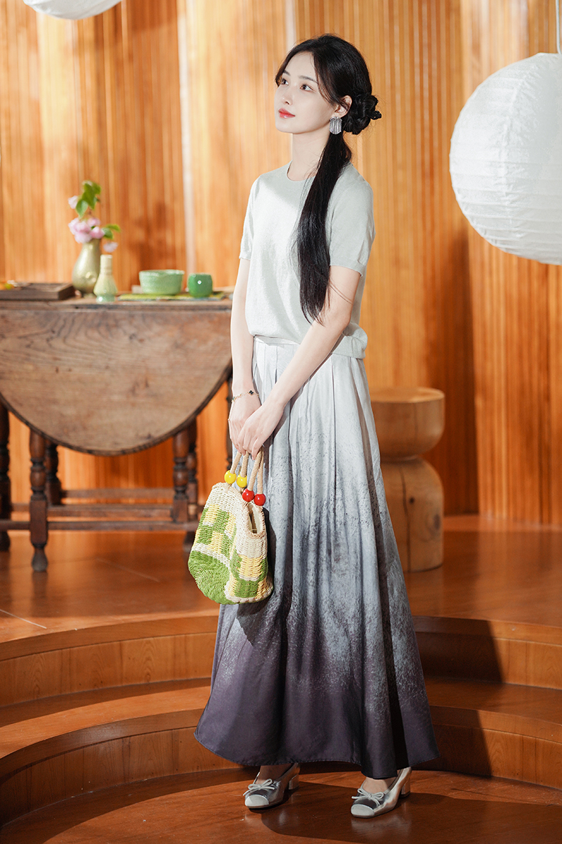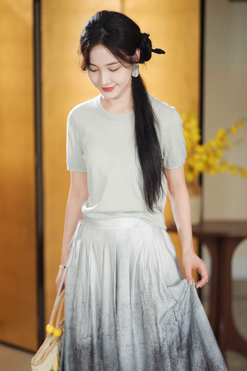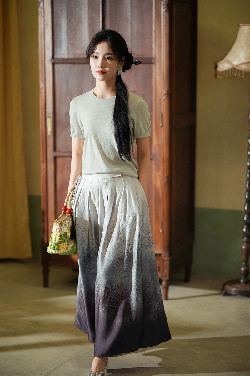 比T更有松弛新中式的韵味,搭配半裙展现出山水的层次感和动态之美,营造出宁静、内敛、高雅的氛围~~