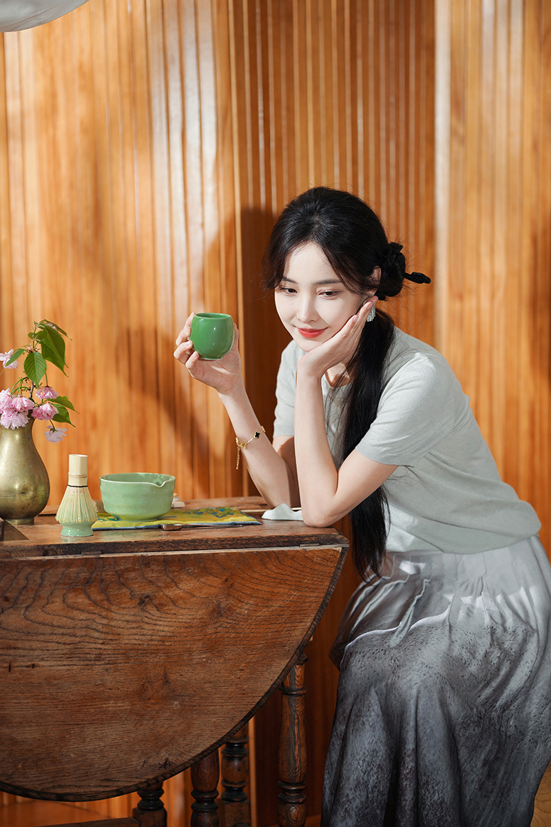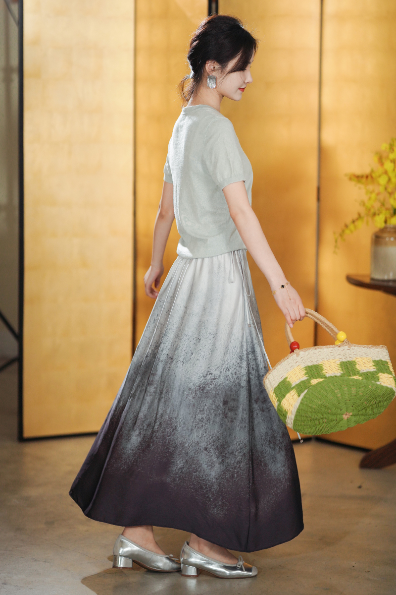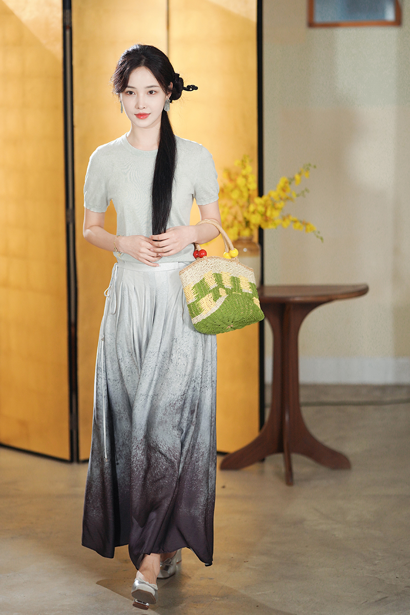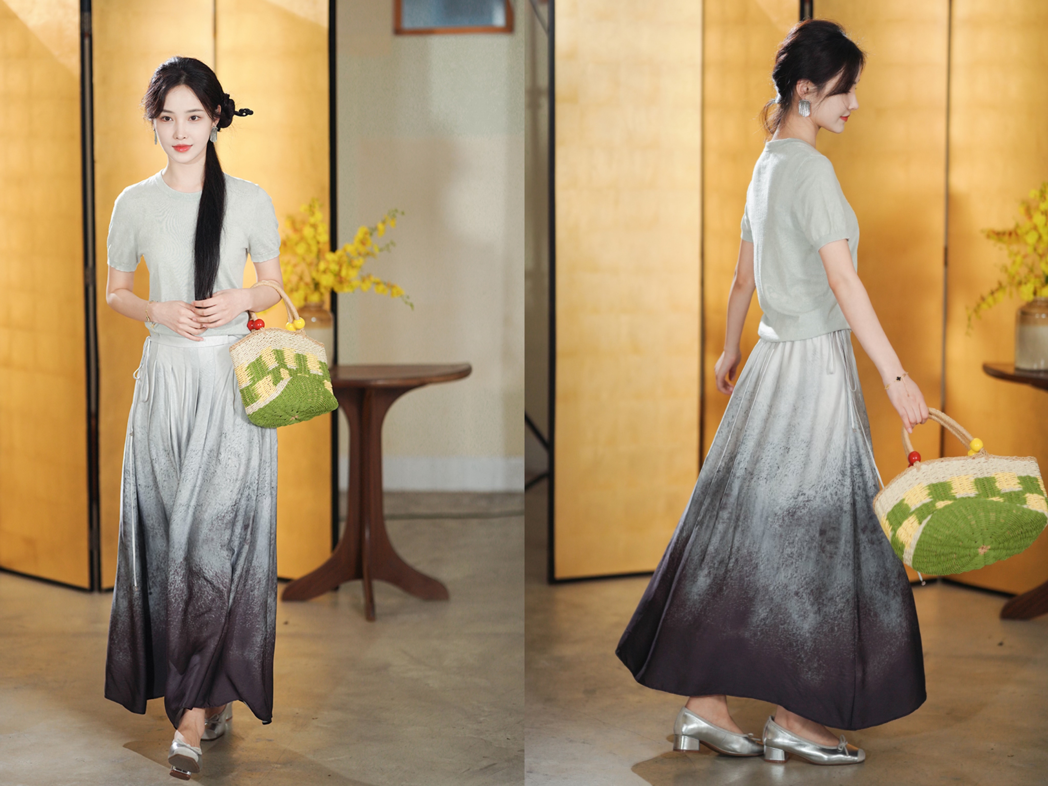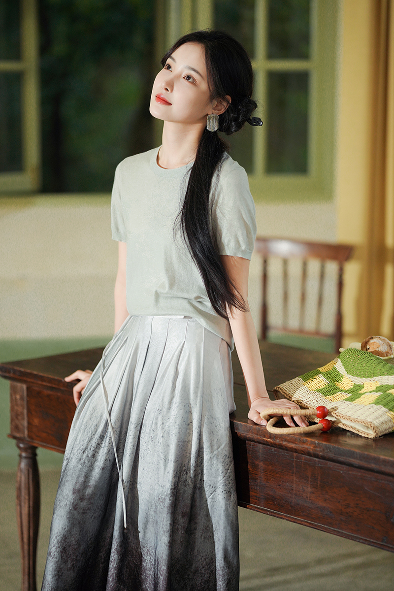 比T更有松弛新中式的韵味,搭配半裙展现出山水的层次感和动态之美,营造出宁静、内敛、高雅的氛围~~