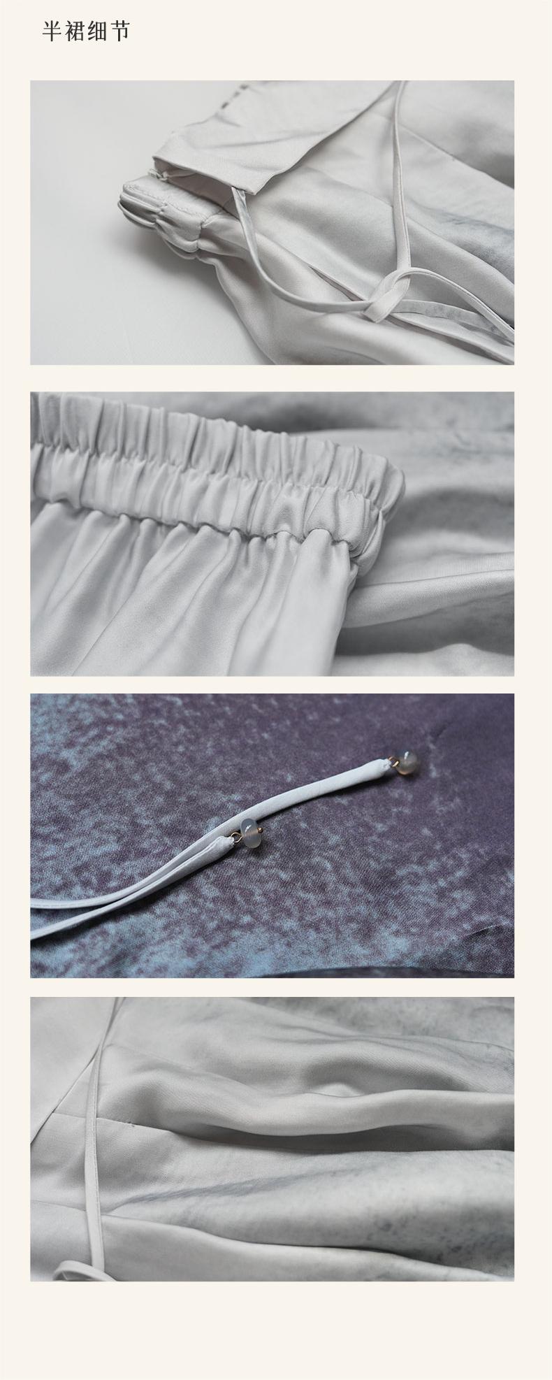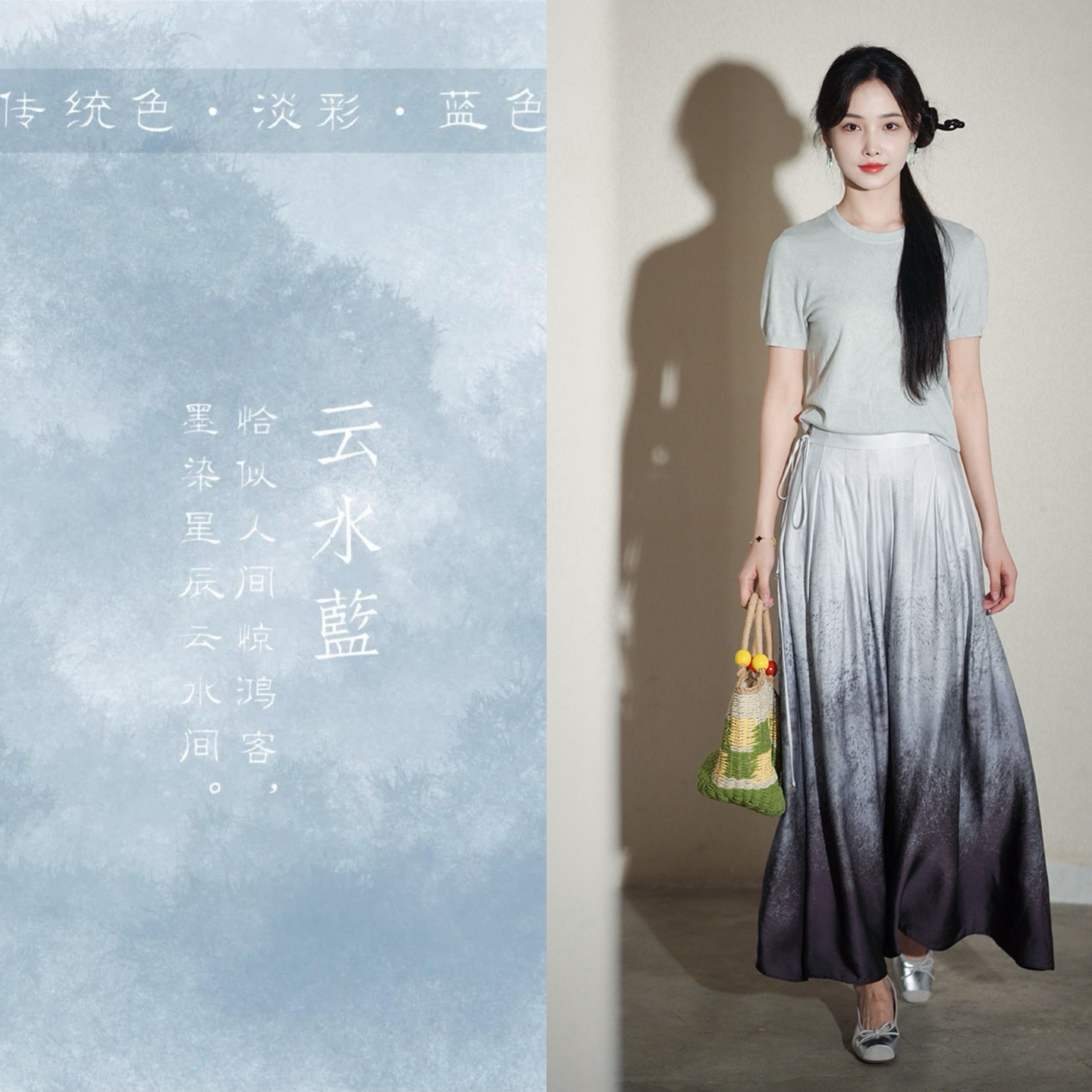 【青山】上下装都选用云水蓝色作为底色,裙摆上再做出泼墨艺术印花,极简又有新中式设计感,非常适合夏天穿着,这样的色彩搭配可以自然而然地消除我们身体的紧张感,真正让我们达到松弛有度、闲适宁静~