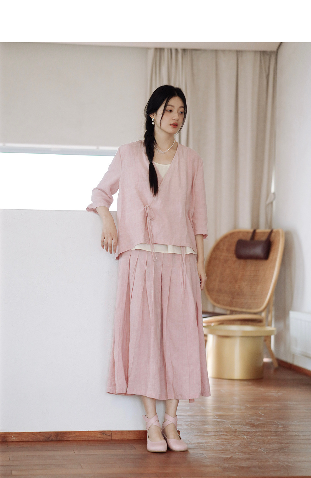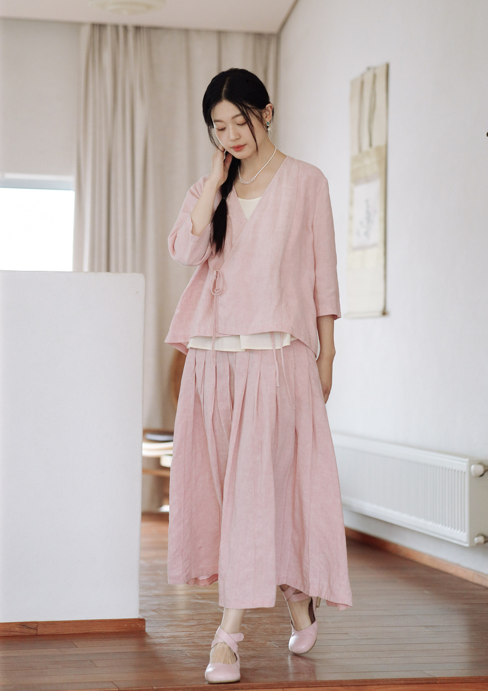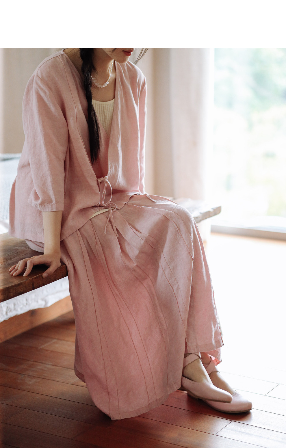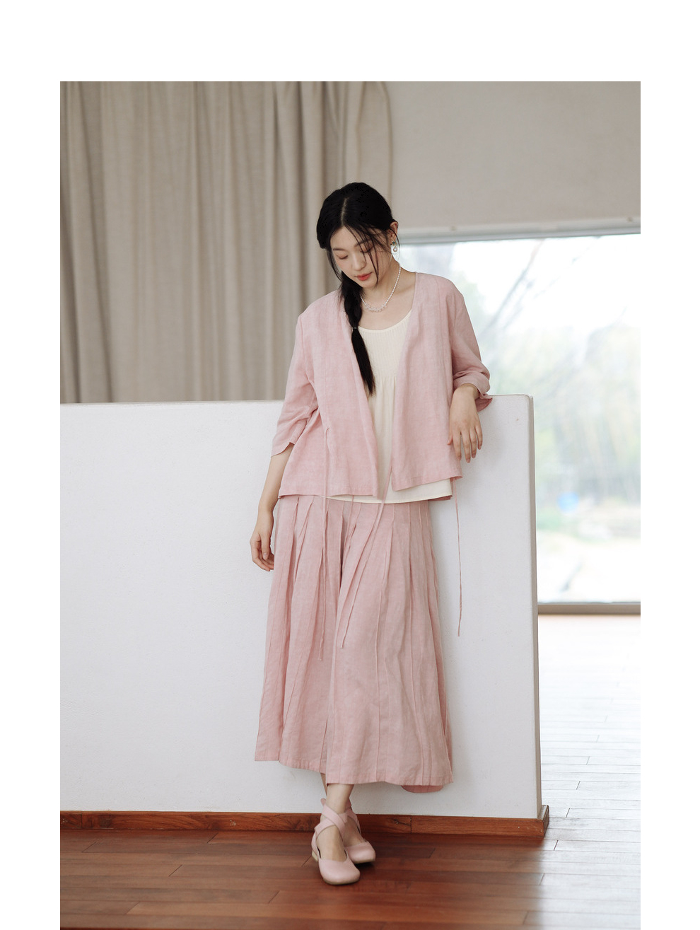 * 绽放225朵/藕荷粉仙女感半身裙天丝亚麻半腰松紧捏褶