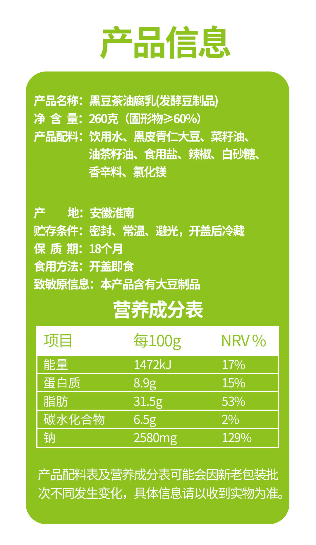 黑豆茶油腐乳 净素配方 微辣 香而不腻、咸淡适中 传统工艺