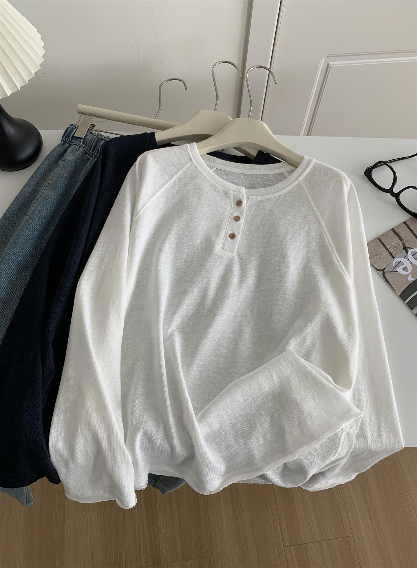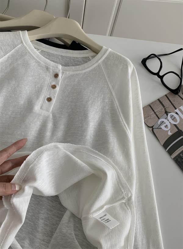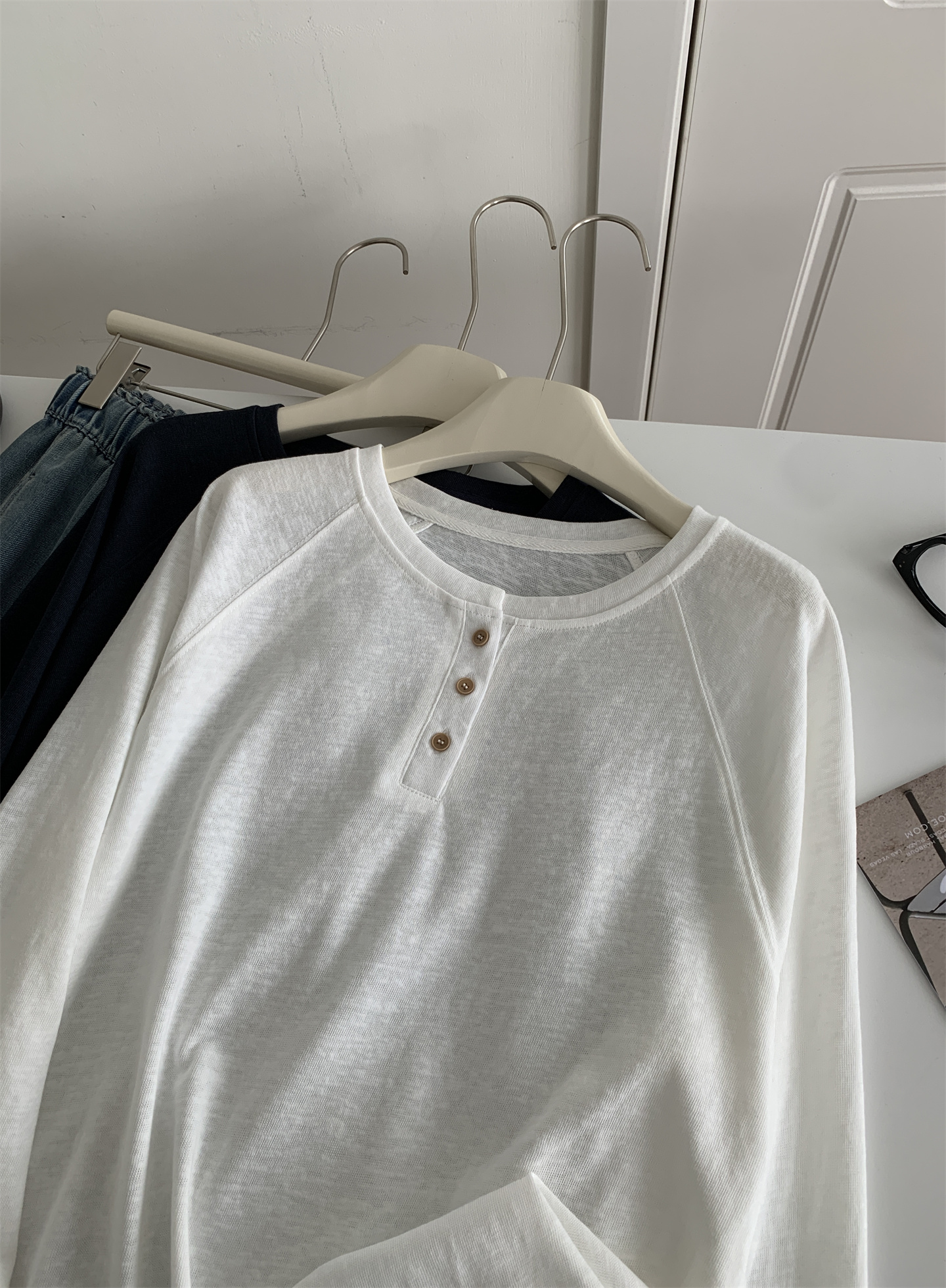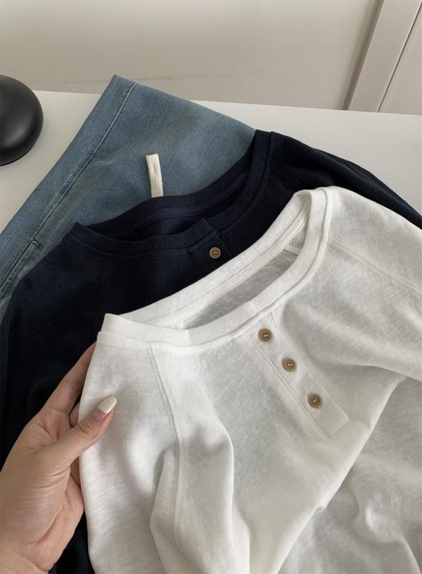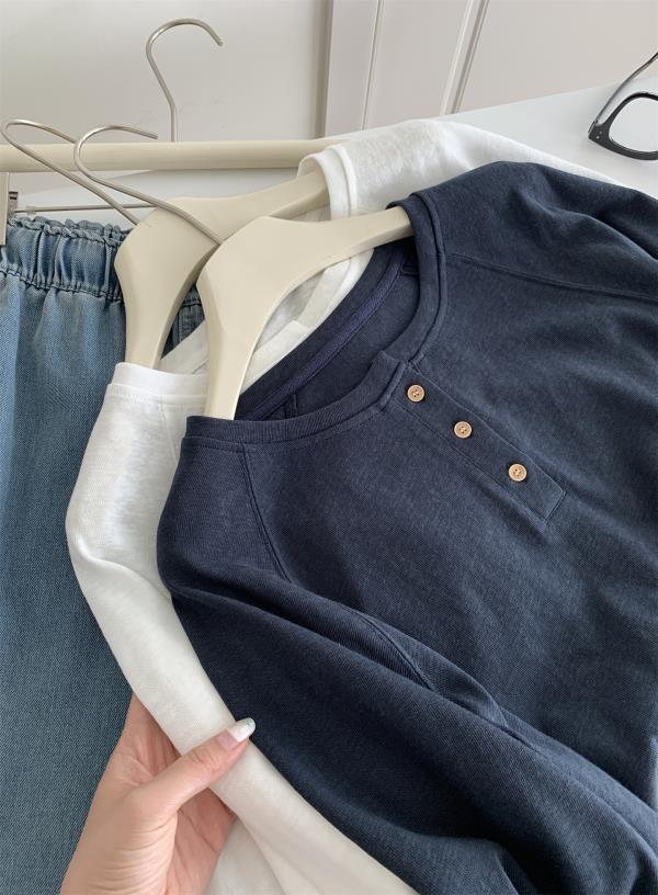 简约韩版三粒扣!麻感棉长袖T恤!女款宽松显瘦插肩袖圆领秋冬打底衫!