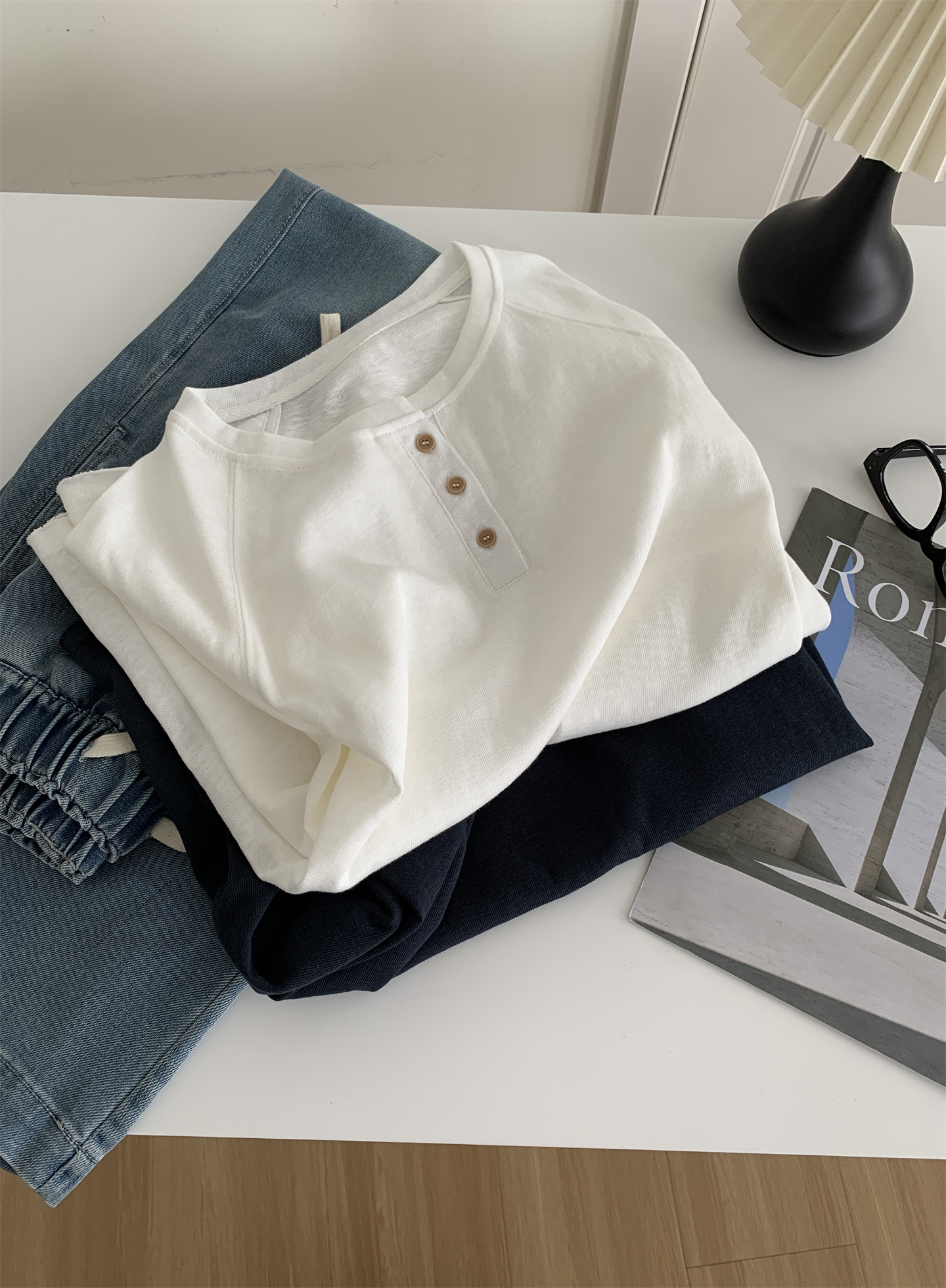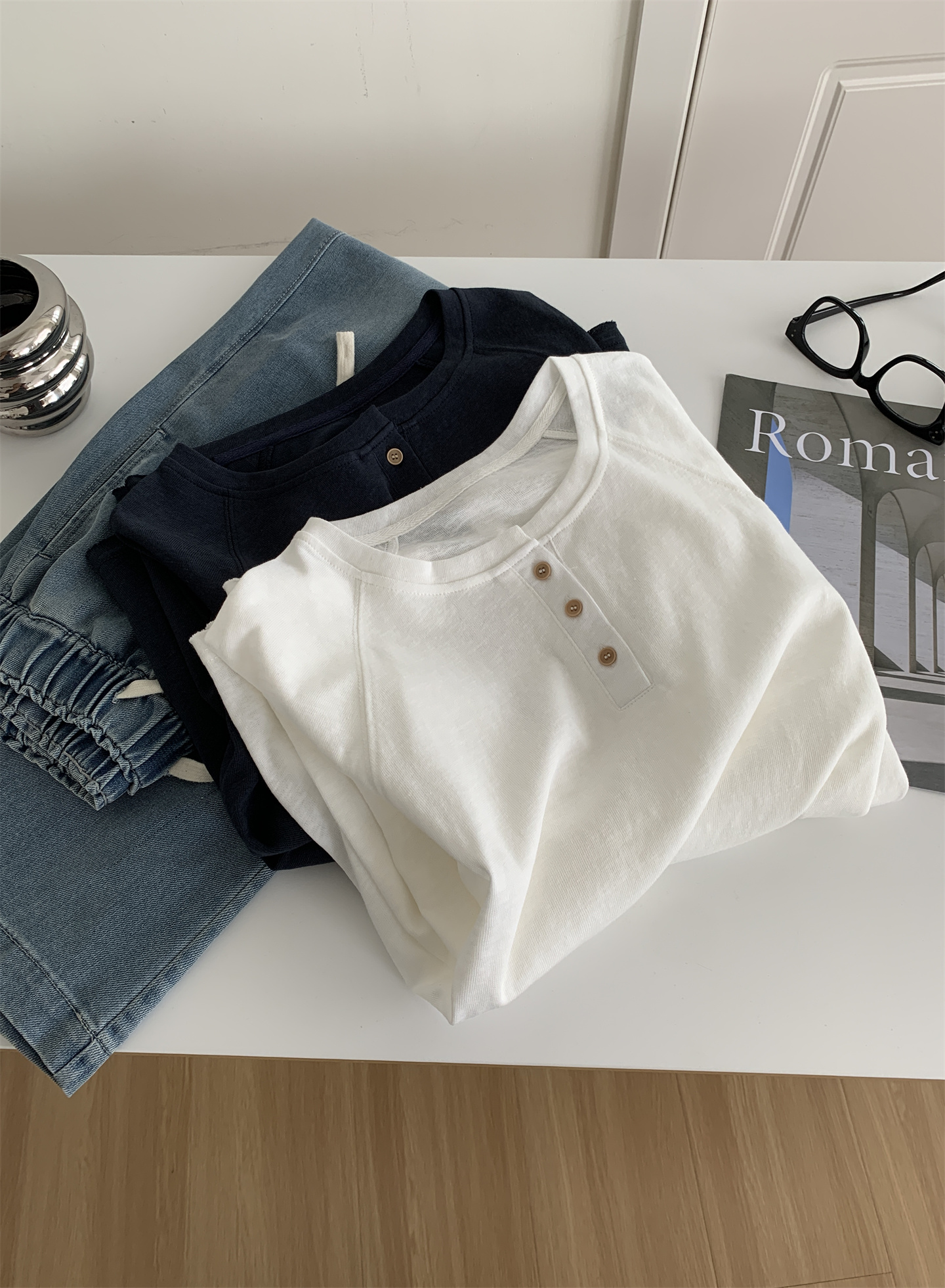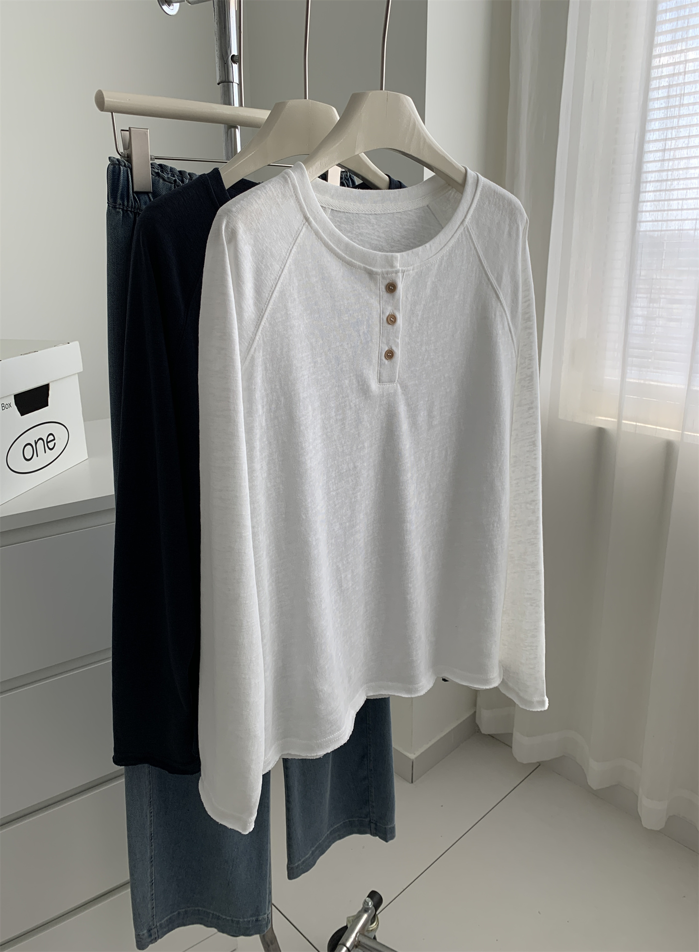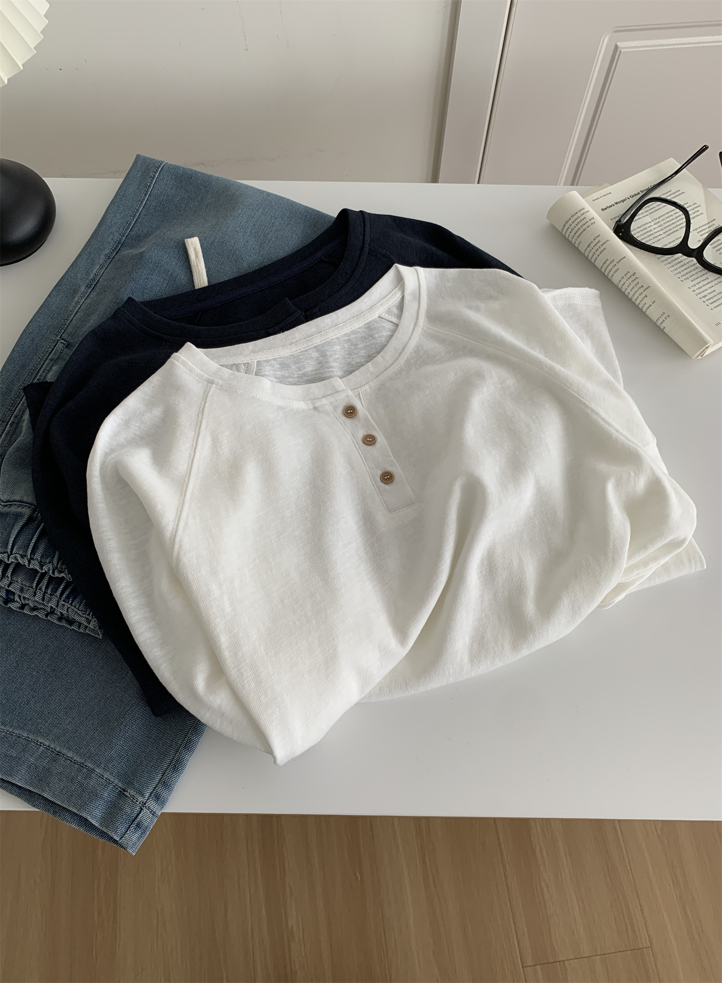 简约韩版三粒扣!麻感棉长袖T恤!女款宽松显瘦插肩袖圆领秋冬打底衫!