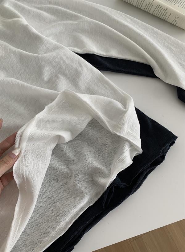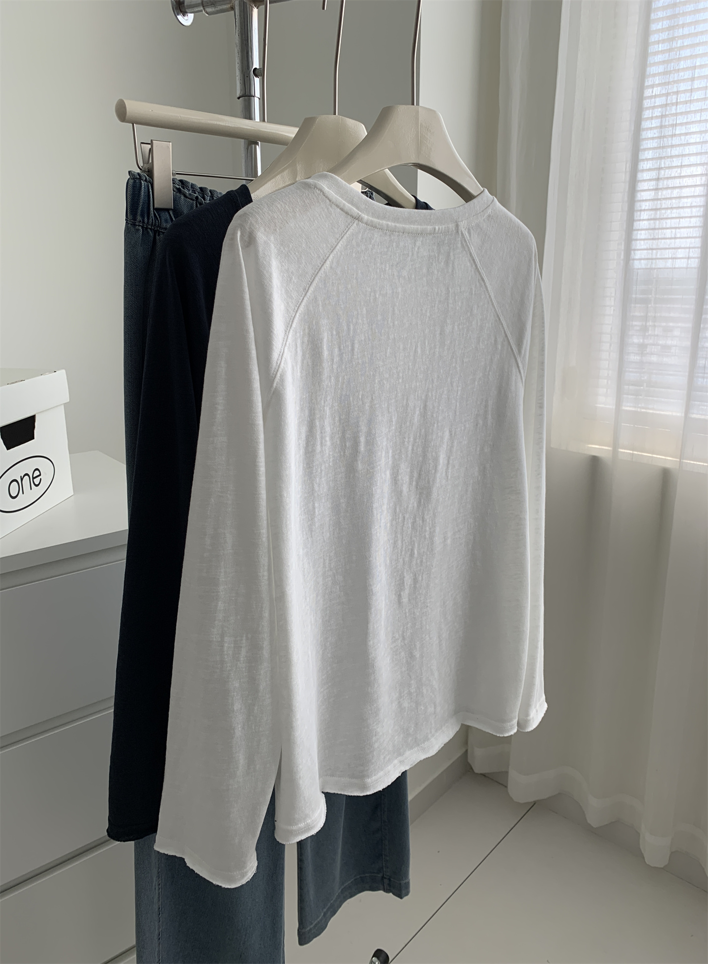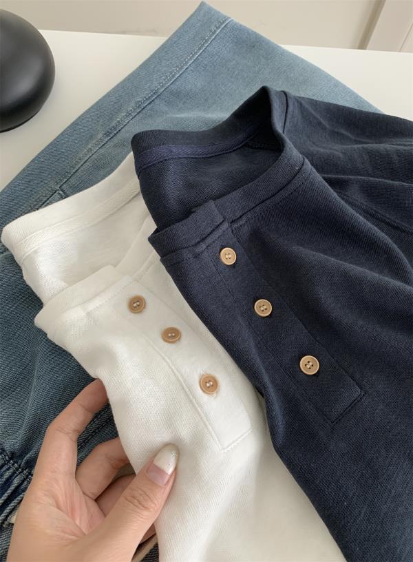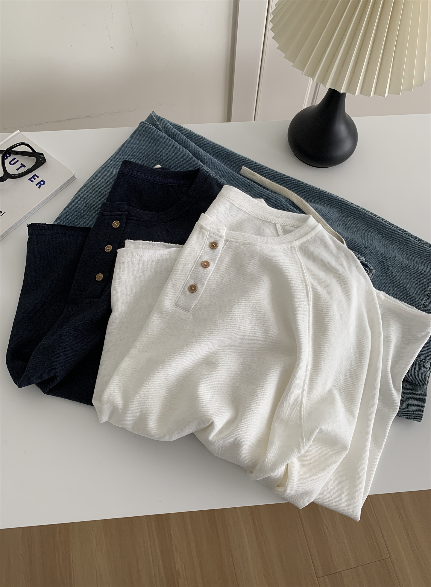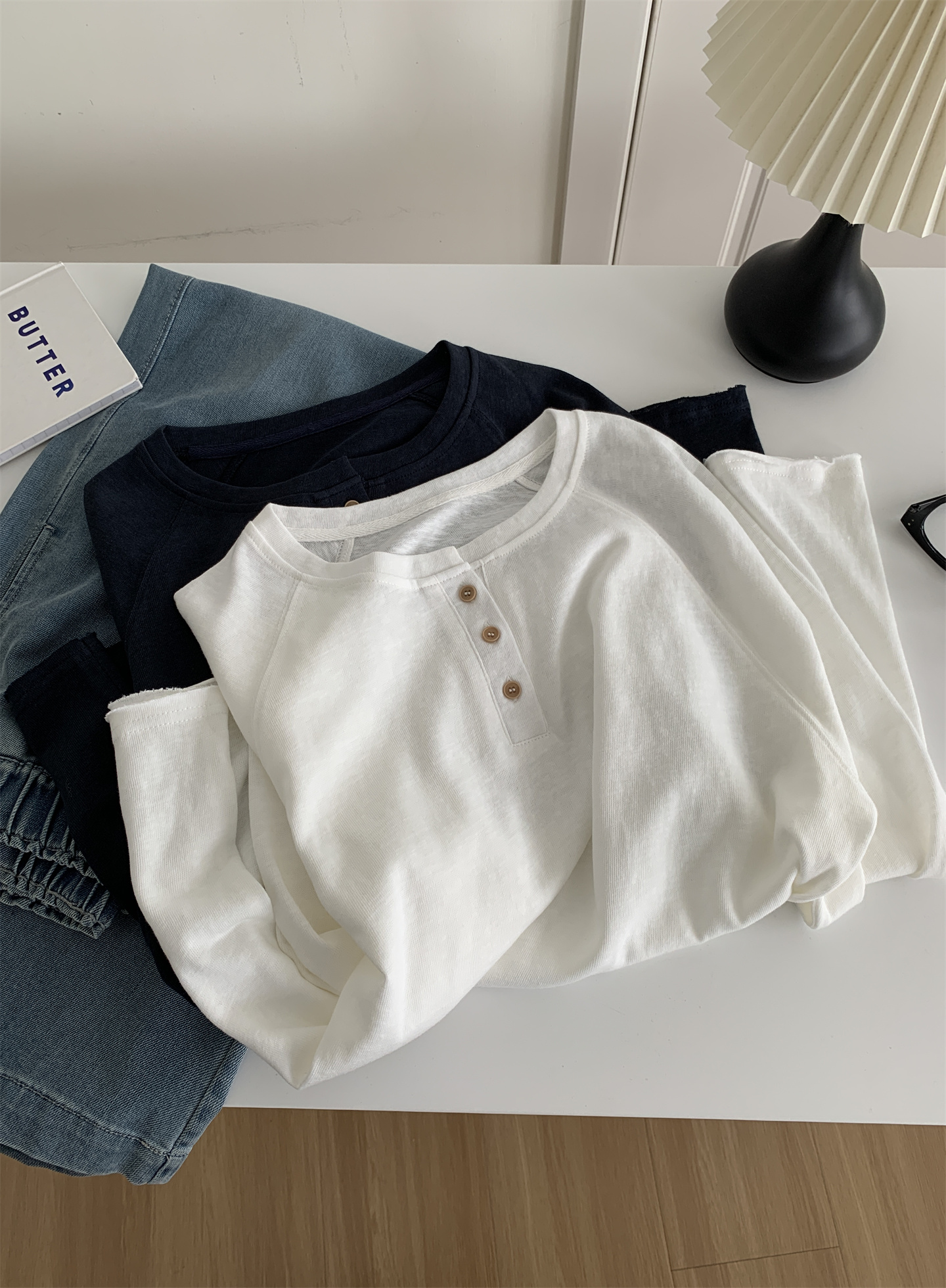 简约韩版三粒扣!麻感棉长袖T恤!女款宽松显瘦插肩袖圆领秋冬打底衫!