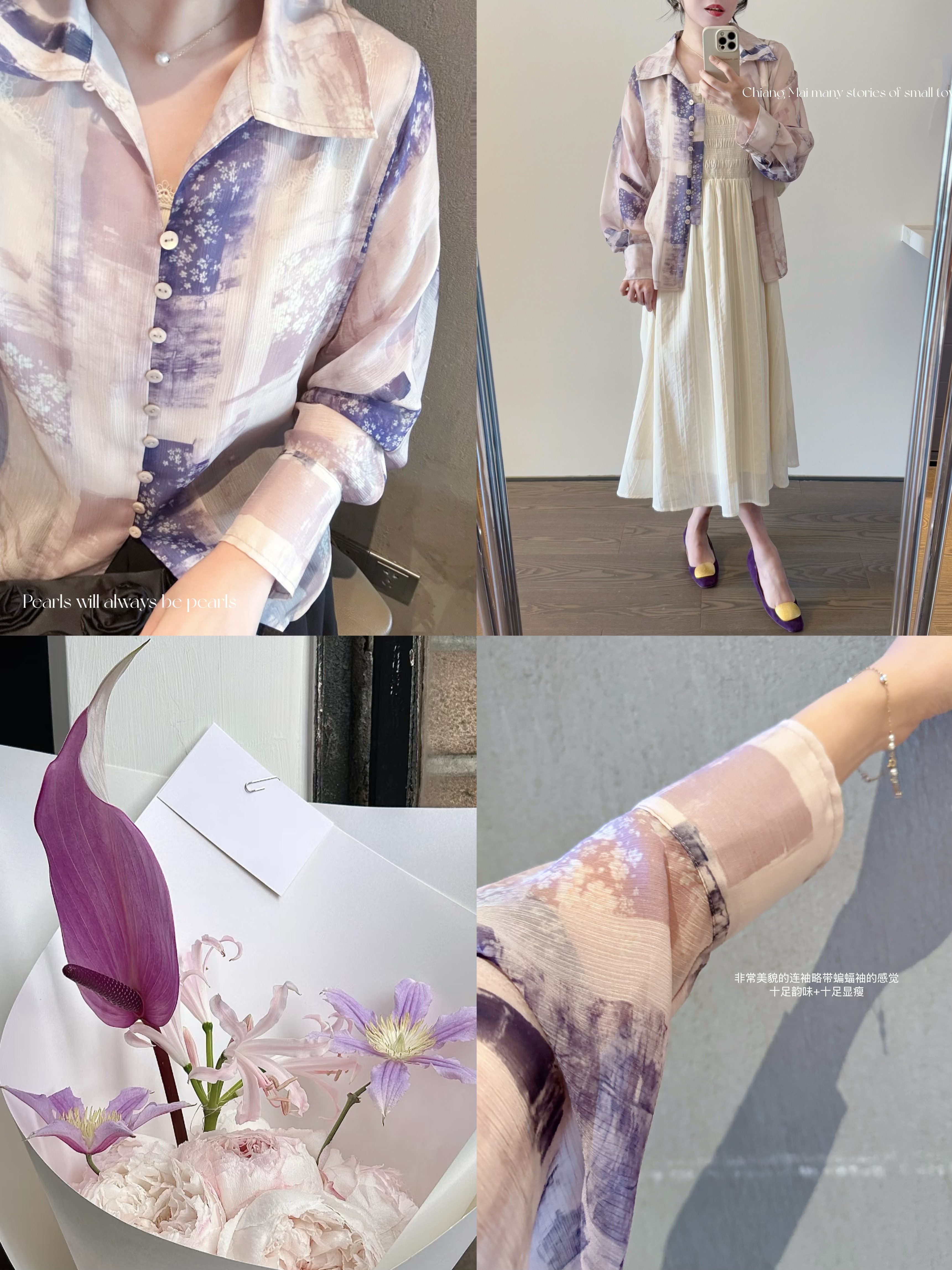 动人时刻 晕染感印花超绝版型优美感十足的顺纡绉单排扣雪纺衬衫 温柔紫色系
