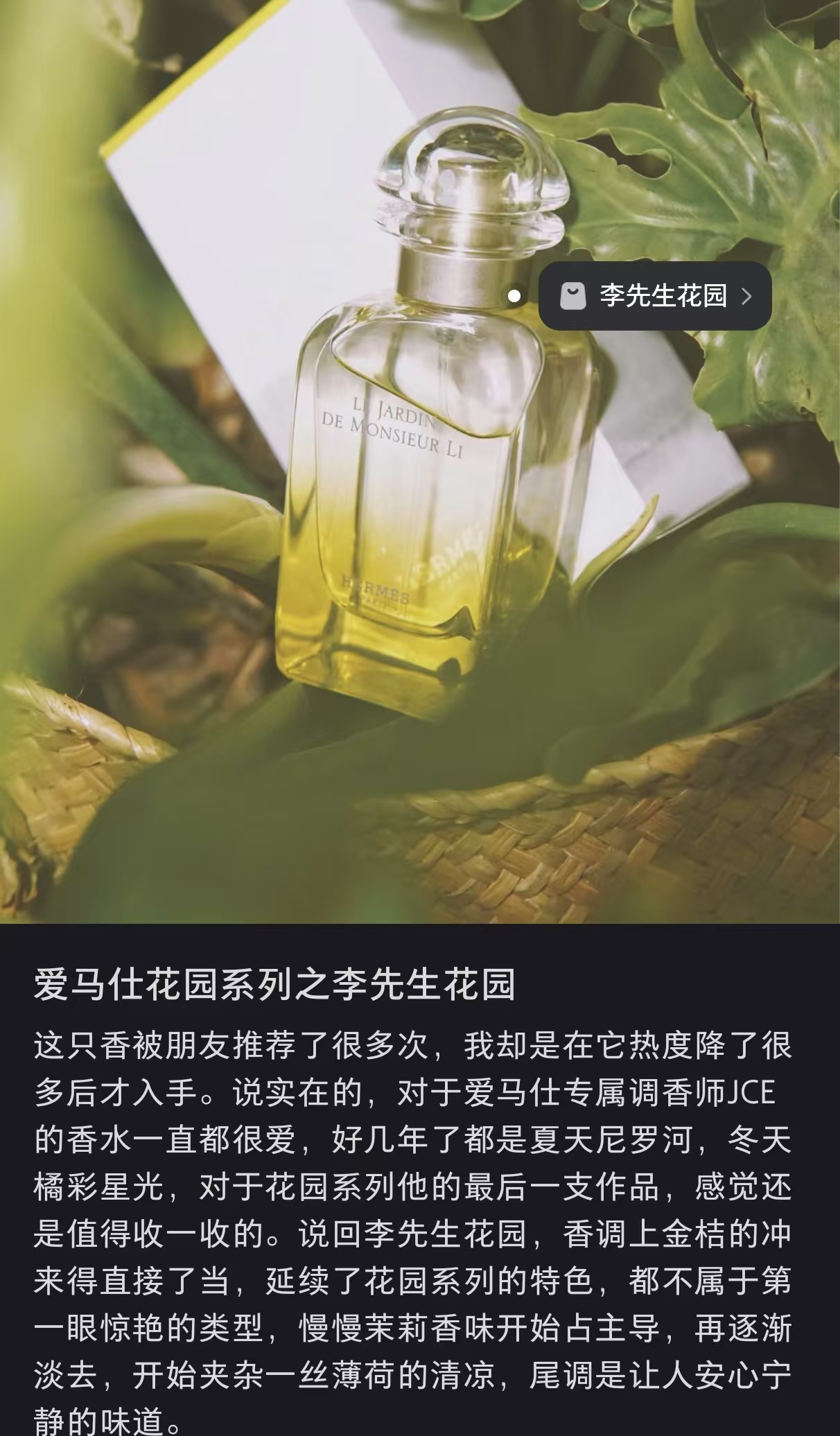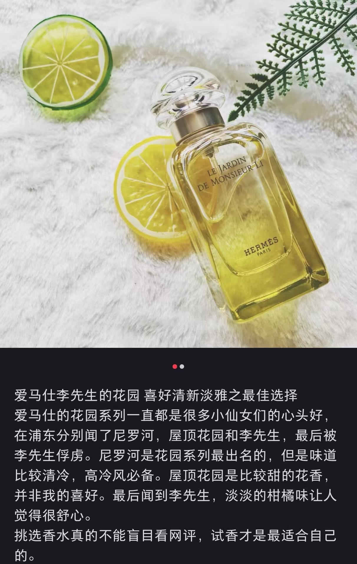 大多男女都喜欢李先生花园是因为香味低调安神,前调金桔的味道像是会导入健康的VC,初闻就会被清澈到