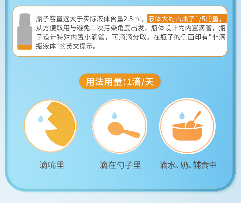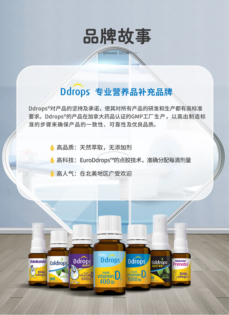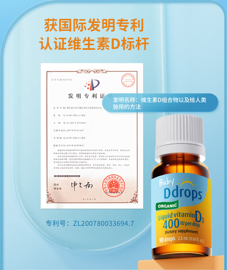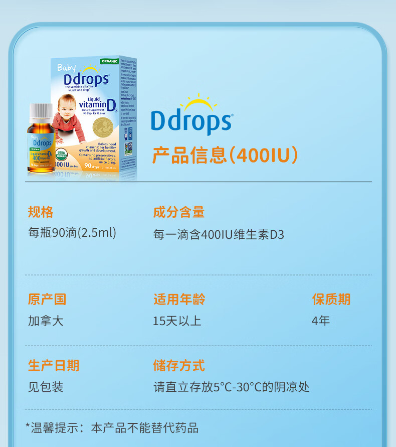 【香港直邮】美国Ddrops滴卓思婴儿补钙每滴400IU维生素D3滴剂 2.5ml(90天量)