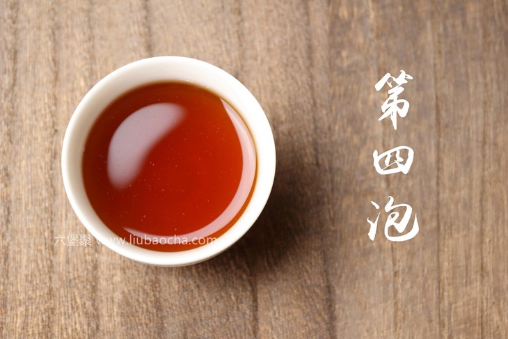 第三泡:汤色深红,浓而明亮,香气纯正,显陈香和木质香,茶汤厚度增加,同时轻发酵的鲜爽底味渐出。