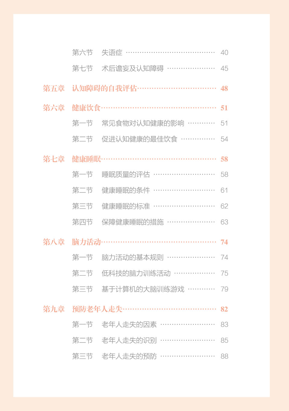 ·体系完整,逻辑清晰:从认知障碍的概述、诱因、影响,到分类评估、自我检测,再到饮食、睡眠、脑力训练等实操预防方案,最后聚焦老年人走失专项防护,层层递进、全面覆盖,让读者从认知到行动形成完整认知闭环。