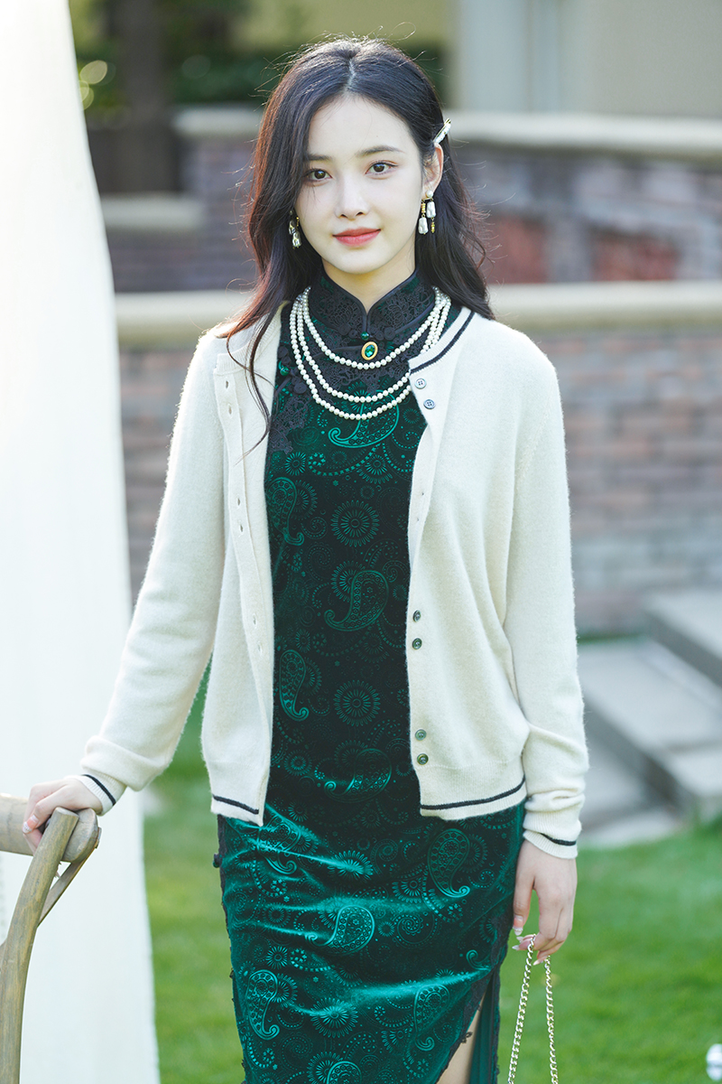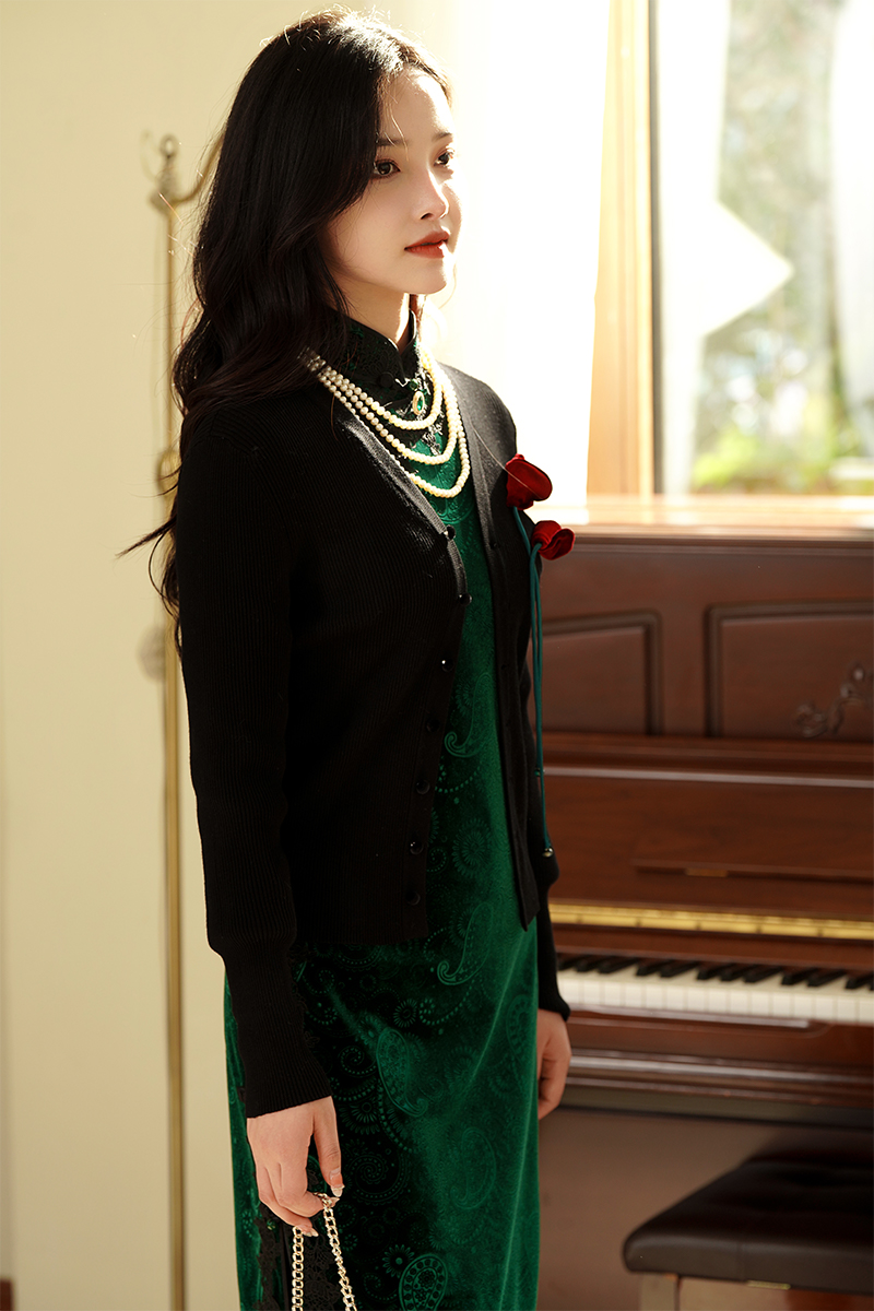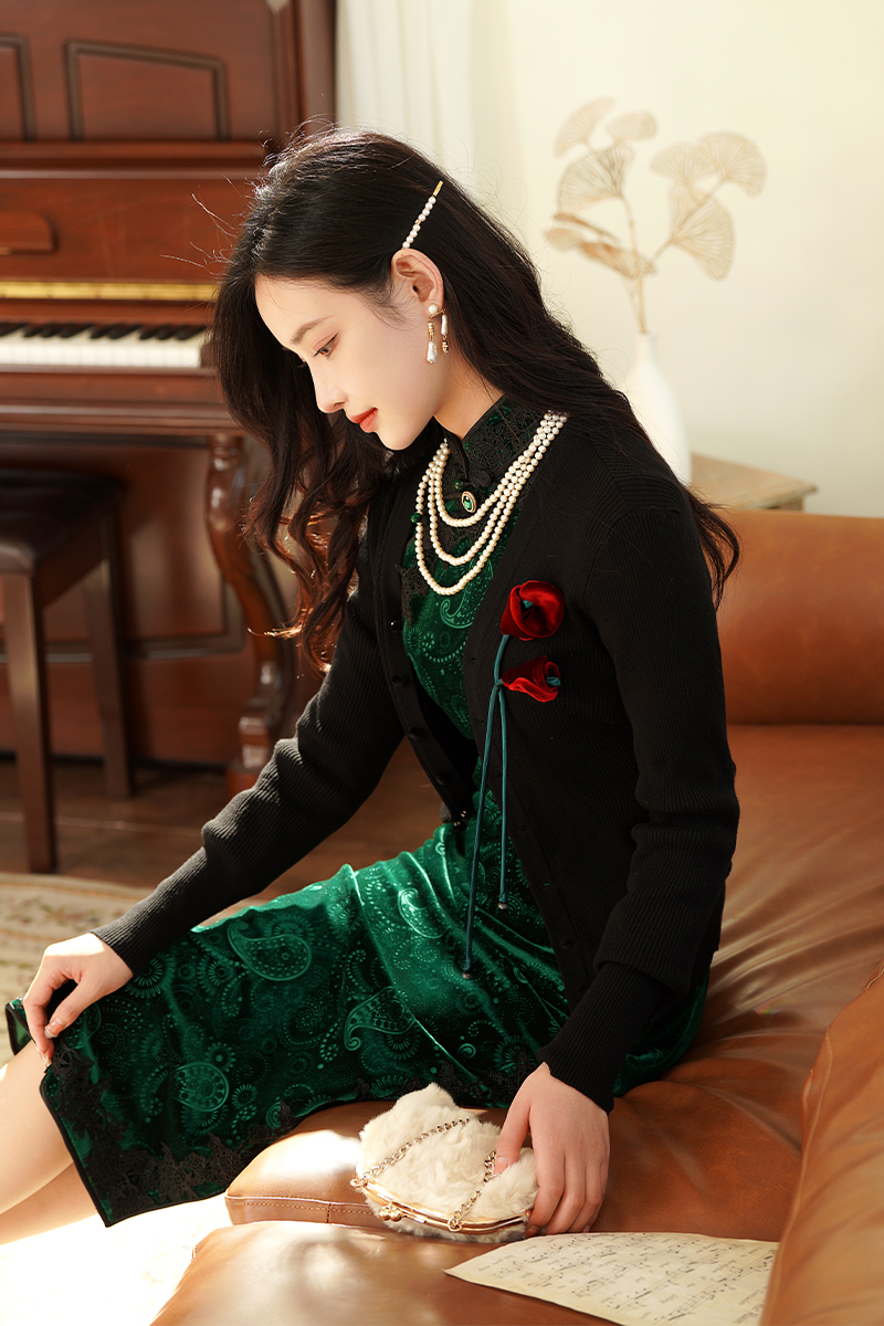 2.旗袍+黑色开衫【晚盈】/黑色披肩【璀璨】。绿色和黑色的搭配可谓是复古优雅的高级存在,上身妥妥的富家千金感。