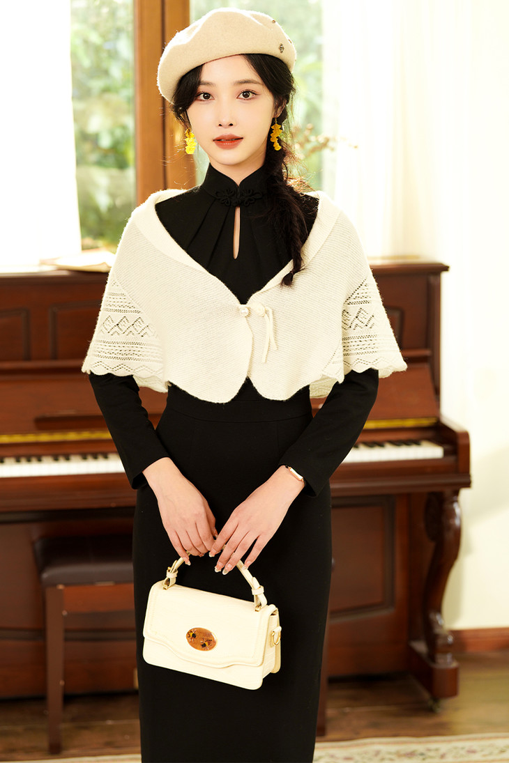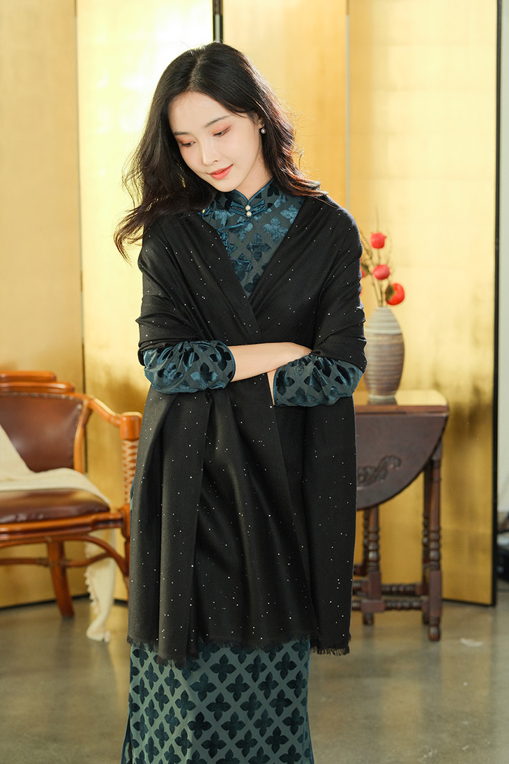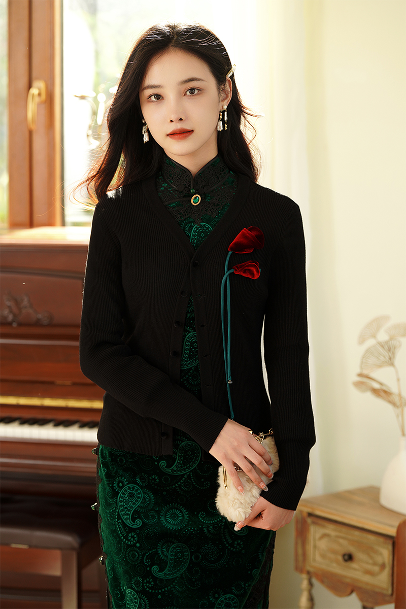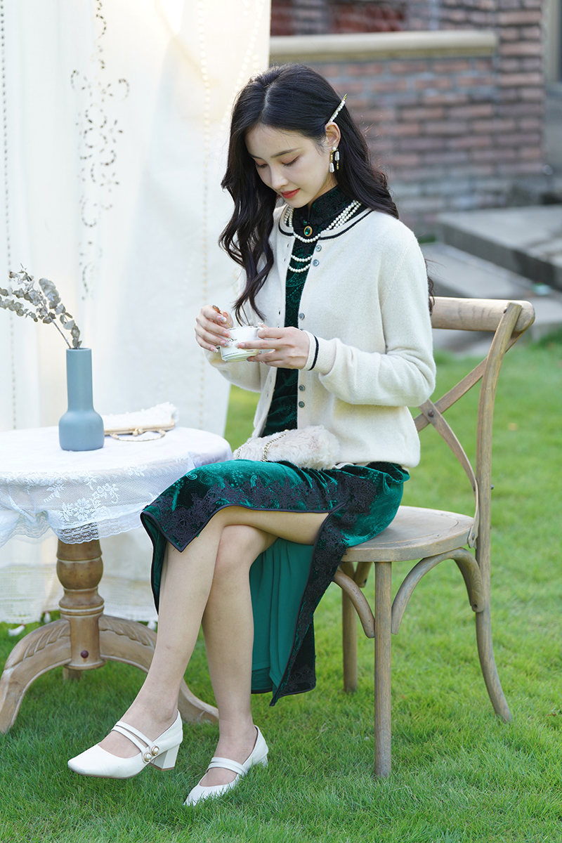 2.旗袍+黑色开衫【晚盈】/黑色披肩【璀璨】。绿色和黑色的搭配可谓是复古优雅的高级存在,上身妥妥的富家千金感。