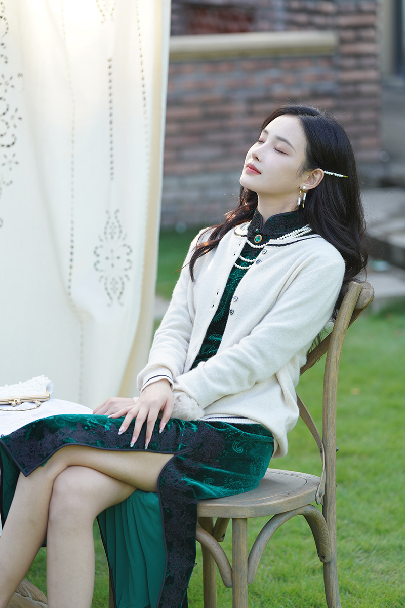 1.旗袍+白色开衫/白色披肩【婉君】。白色是很百搭的颜色,搭配绿色旗袍,色系和谐,美得很自然!~