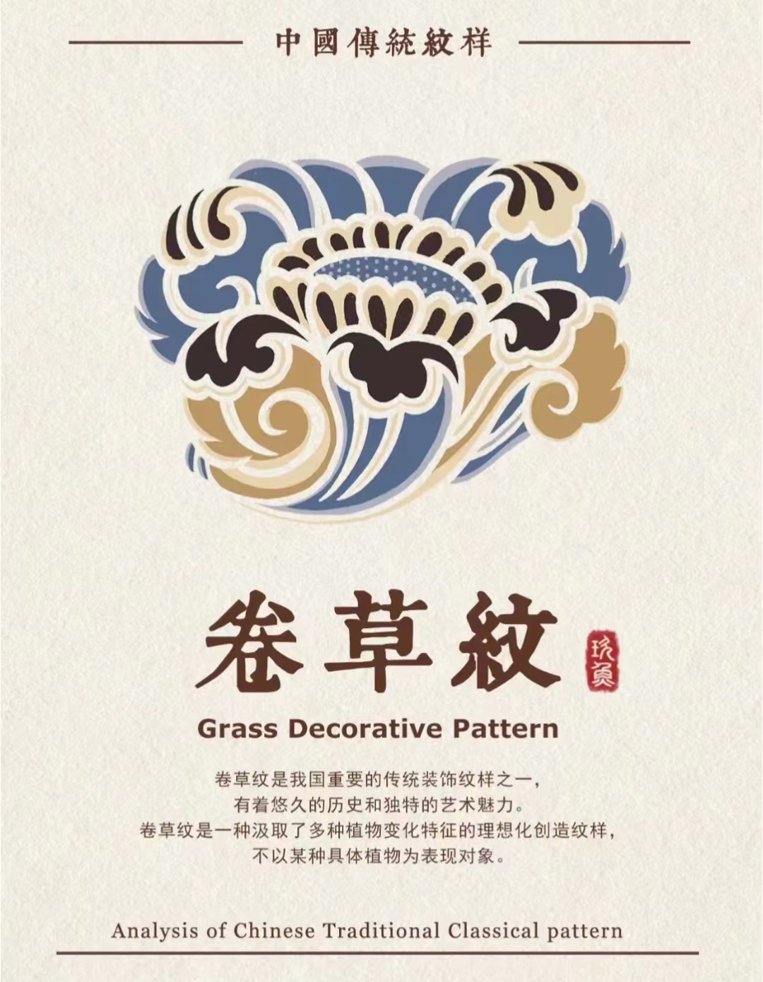 卷草纹在我国唐代最为流行,俗称唐草,在元代发展为缠枝纹,成为我国主要的装饰纹样之一。以"s"形为主线,以“C”形为装饰构成的连续卷曲纹样,总体造型线条流畅,饱满圆润,自然卷曲,呈连绵不绝的连续波曲状。
