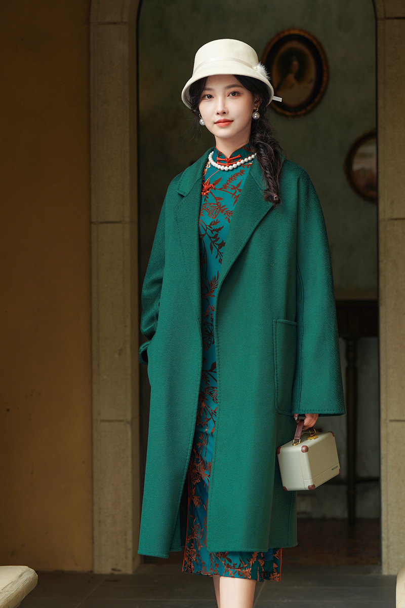 3.旗袍+大衣。可以选择一款修身的风衣,颜色上可以选择经典的颜色,比如黑色、驼色或者同色系大衣,这样既能增加整体的时尚感,又不失优雅。