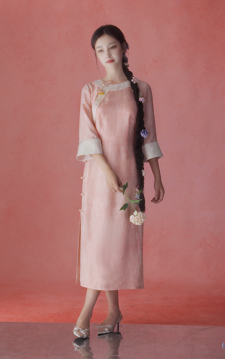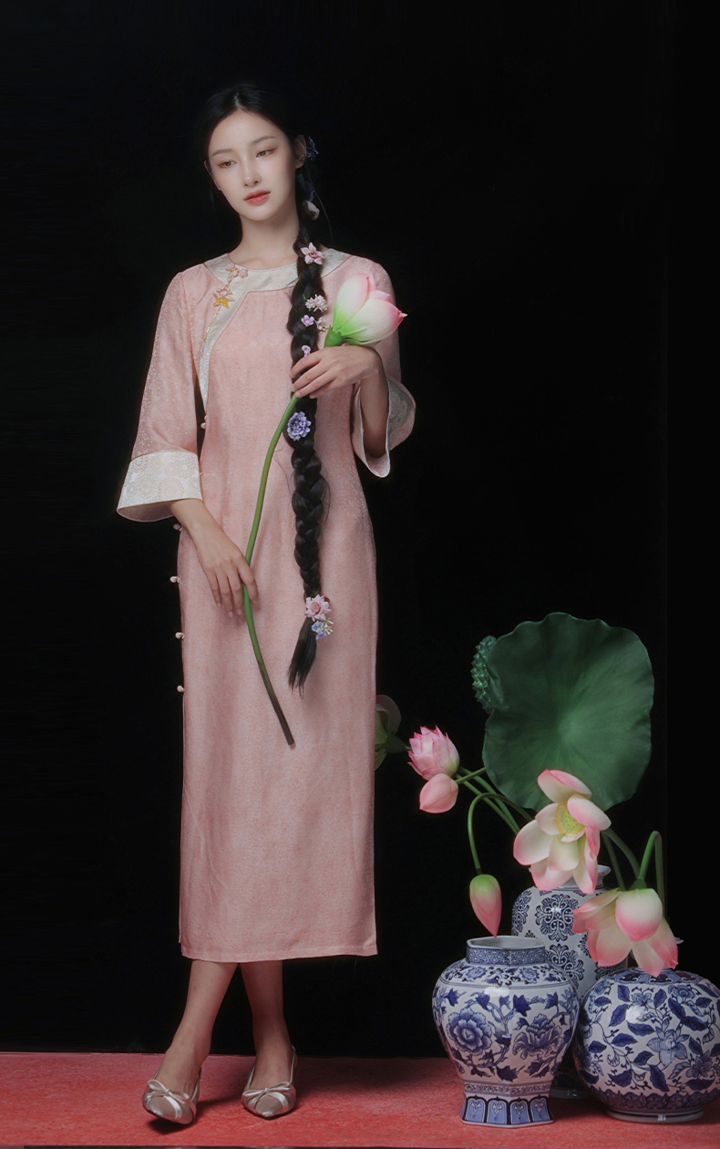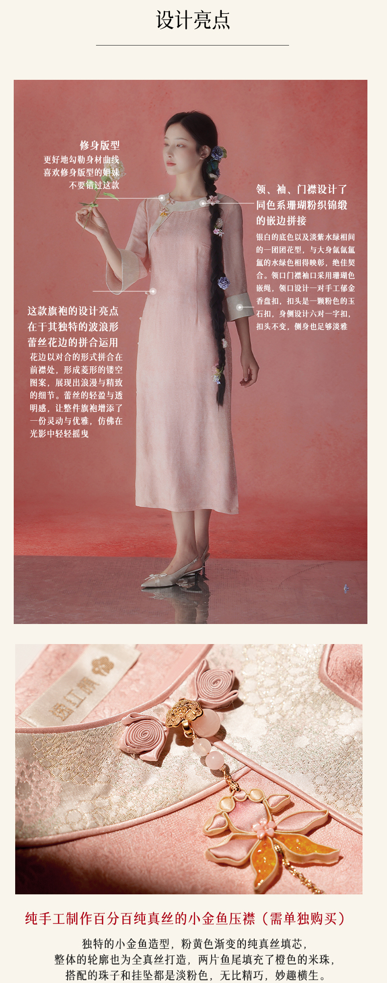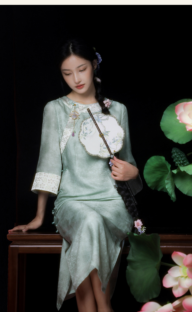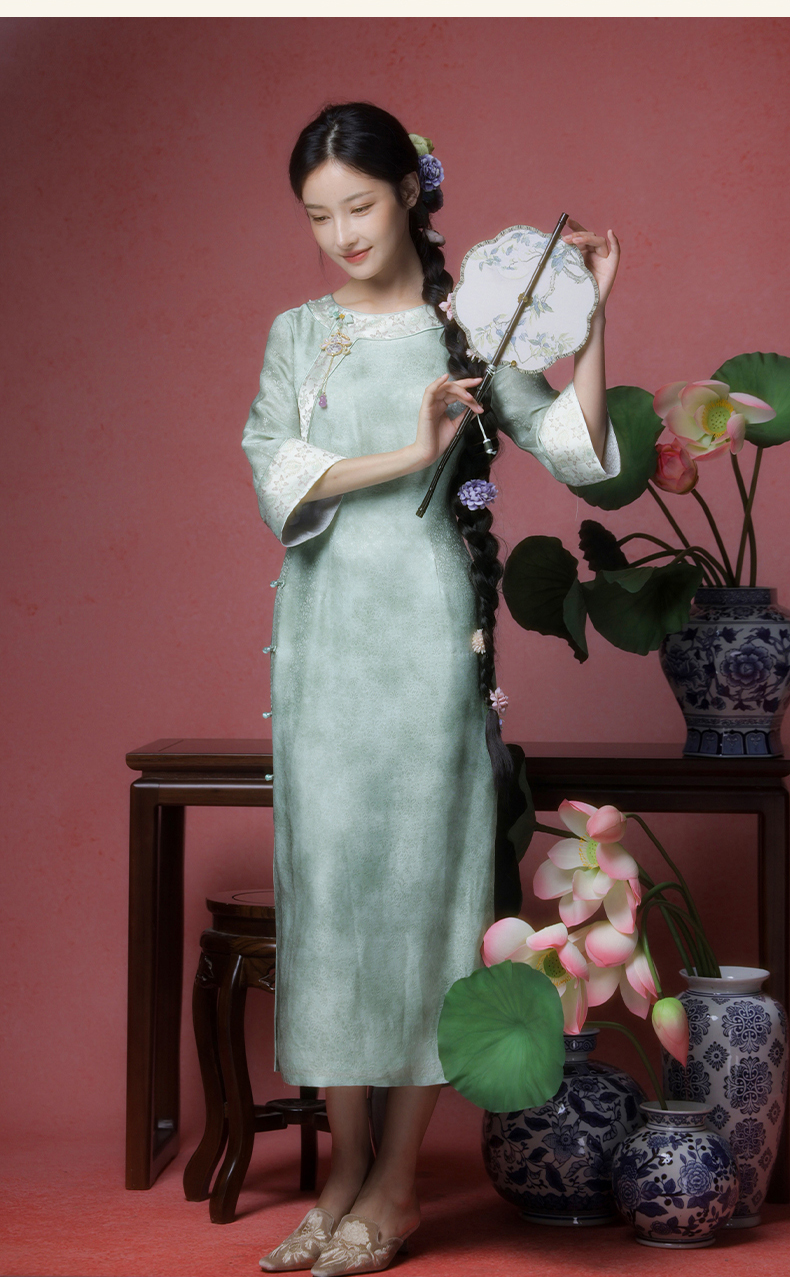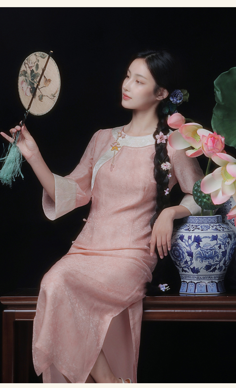 逸红颜问许2025秋新款真丝圆领拼宋锦略宽松新中式中袖改良旗袍女