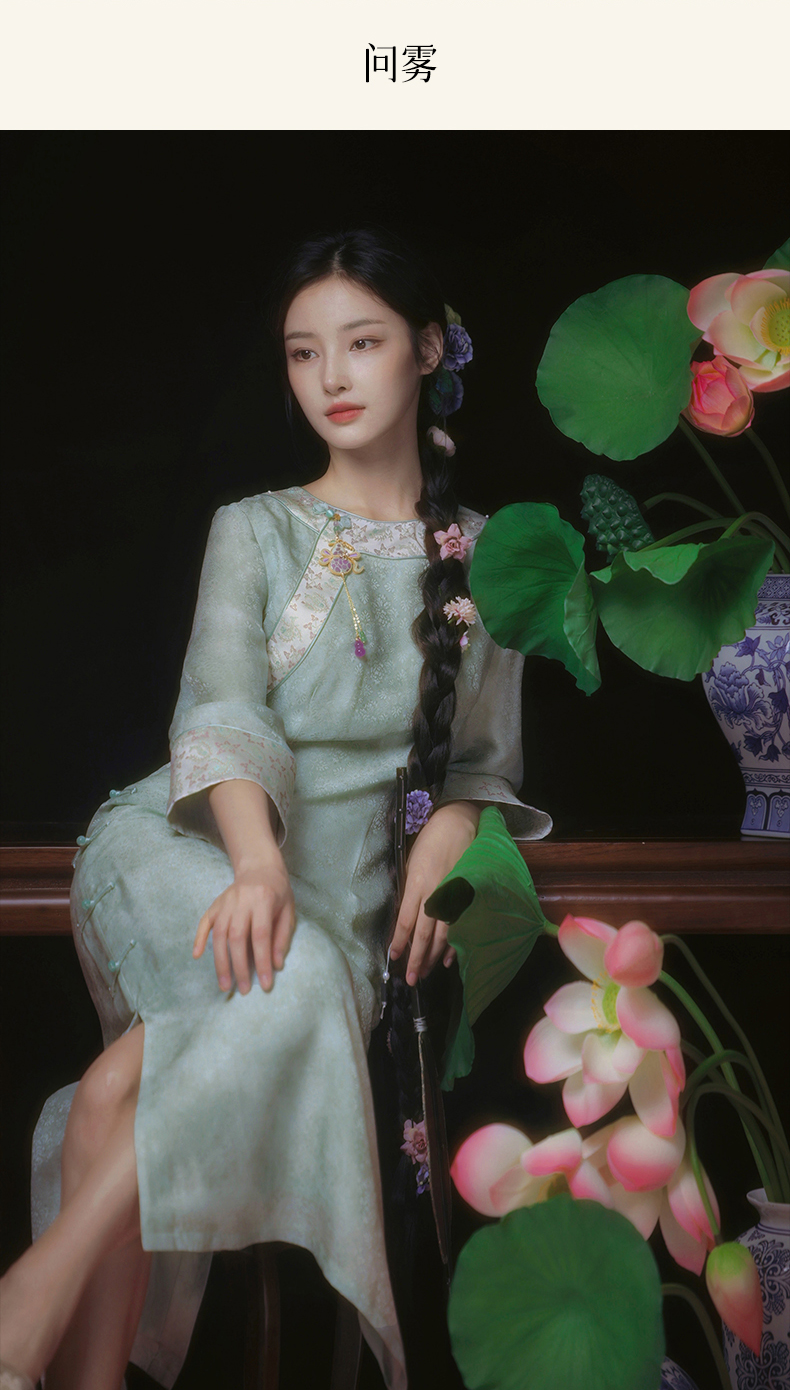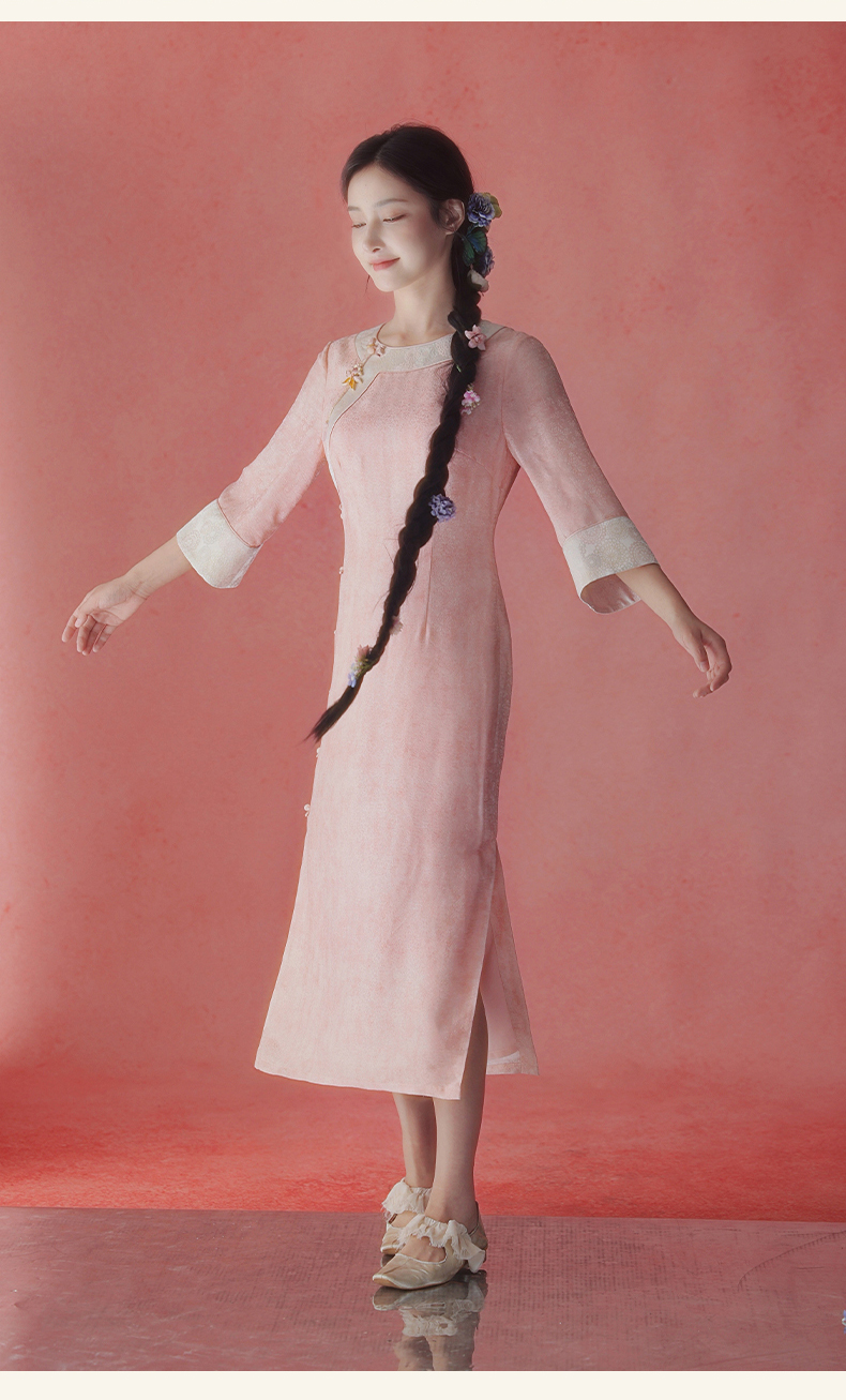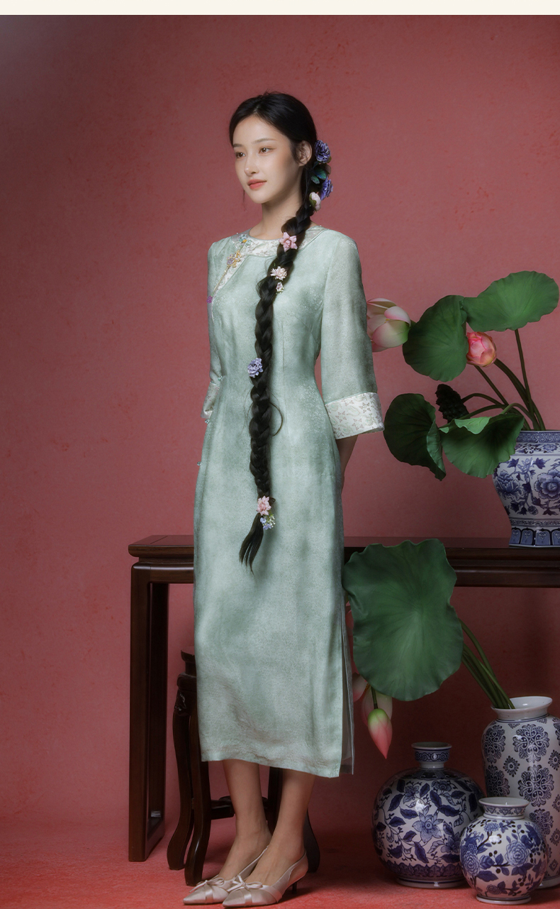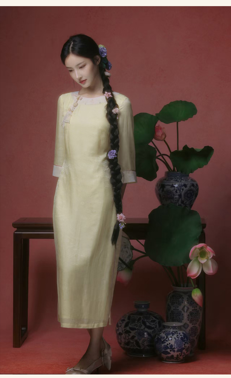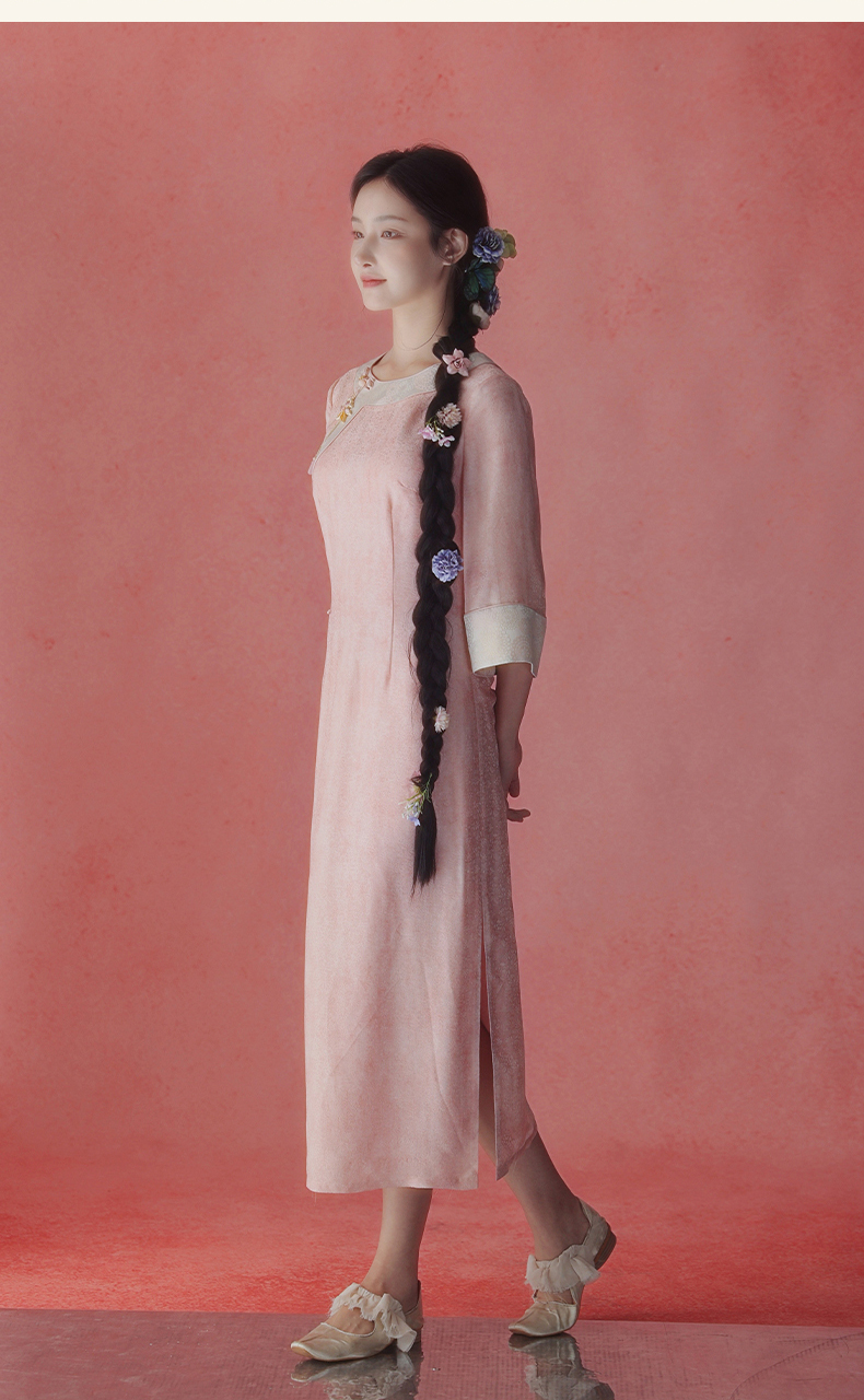逸红颜问许2025秋新款真丝圆领拼宋锦略宽松新中式中袖改良旗袍女