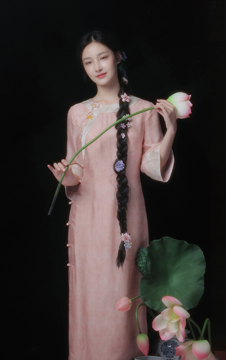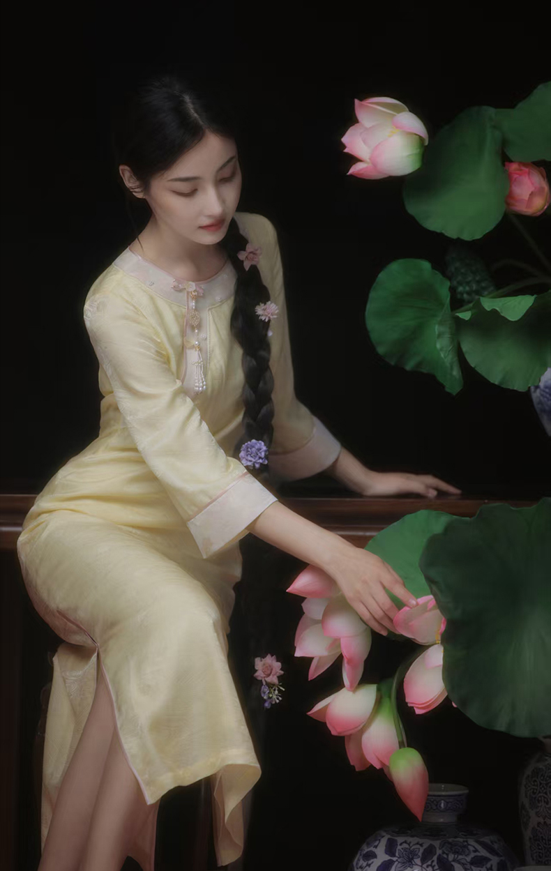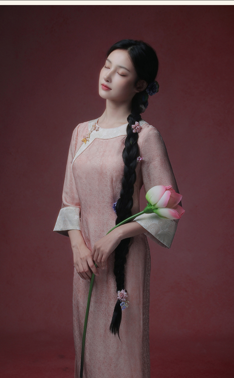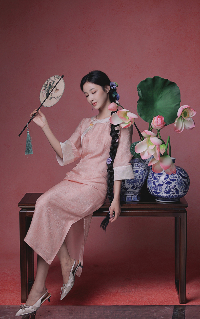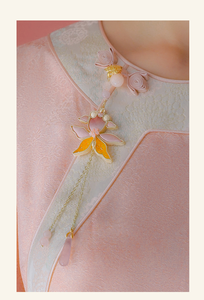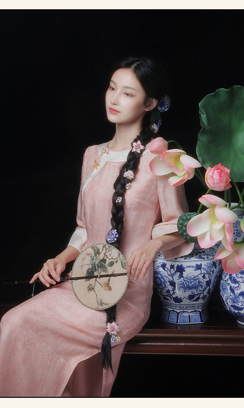 逸红颜问许2025秋新款真丝圆领拼宋锦略宽松新中式中袖改良旗袍女