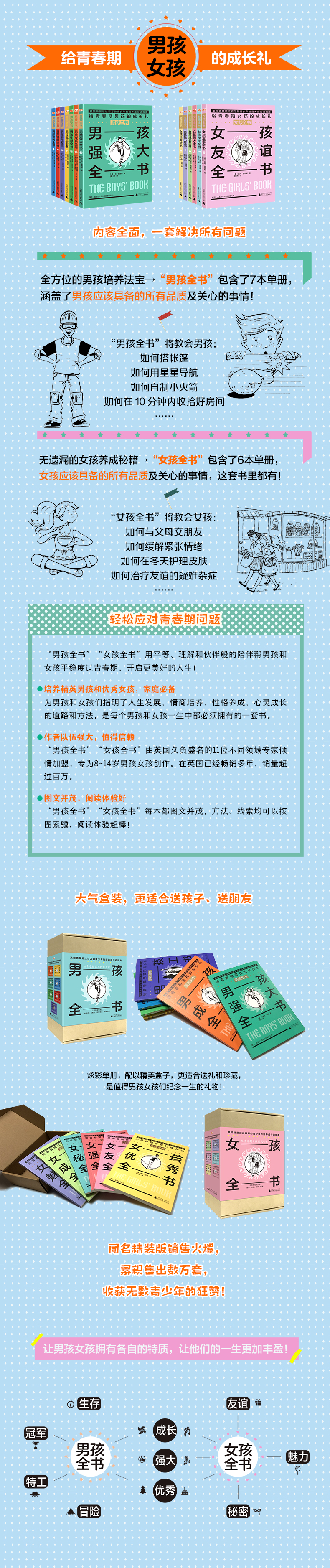 ★内容全面,一套解决所有问题“男孩全书”包含了7本单册,生存、特工、冒险、冠军、成长、优秀、强大,男孩应该具备的所有的品质及关心的事情,这套书里都有!是全方位培养男孩的法宝!