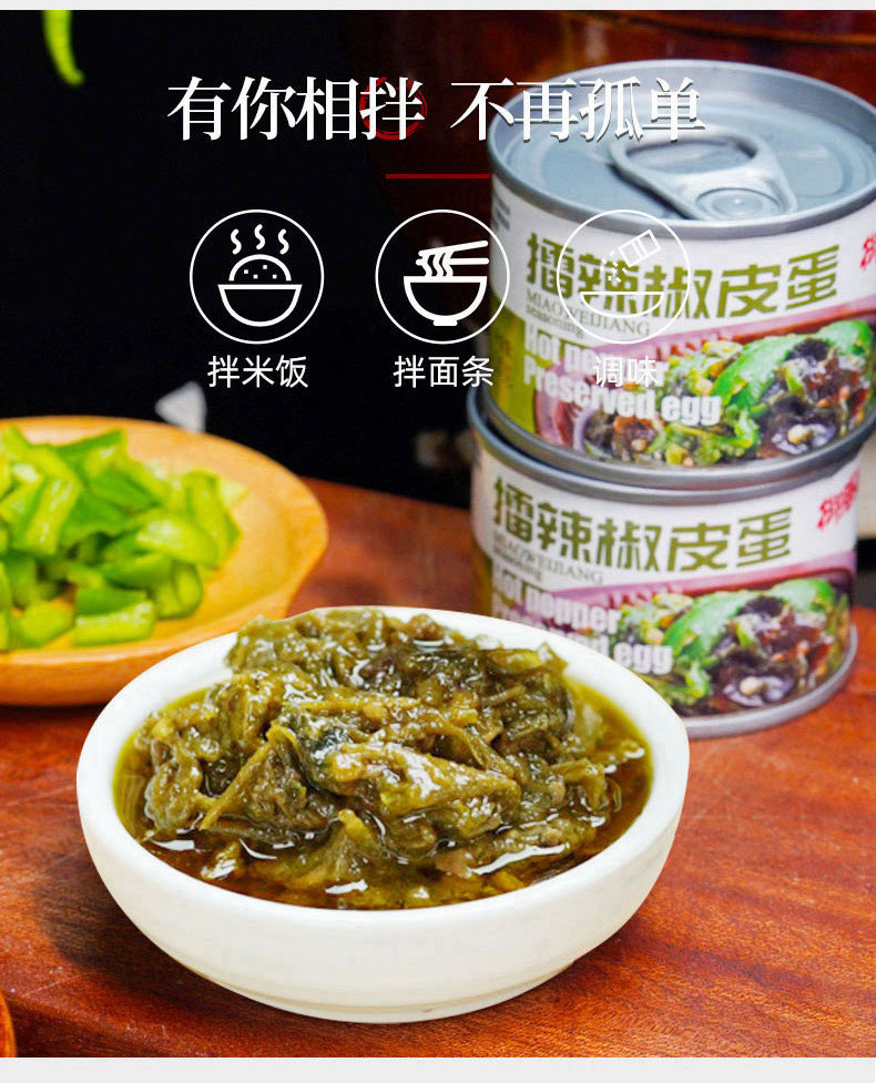 虽然一罐只有50g,小小的,但是一组有8罐,量很大了呢!炒菜、拌饭、拌面...可以拌一切的擂椒皮蛋,绝对是没食欲的夏天里,打开胃口的得力助手!